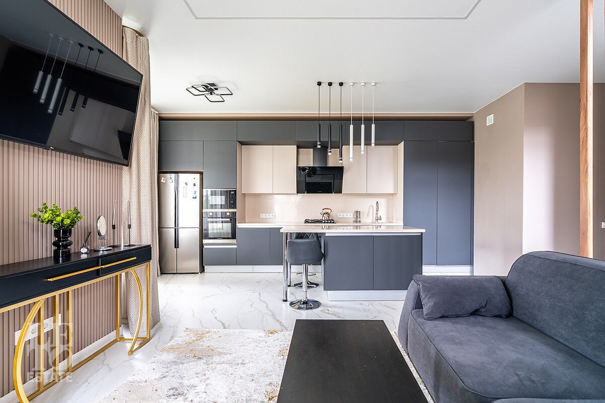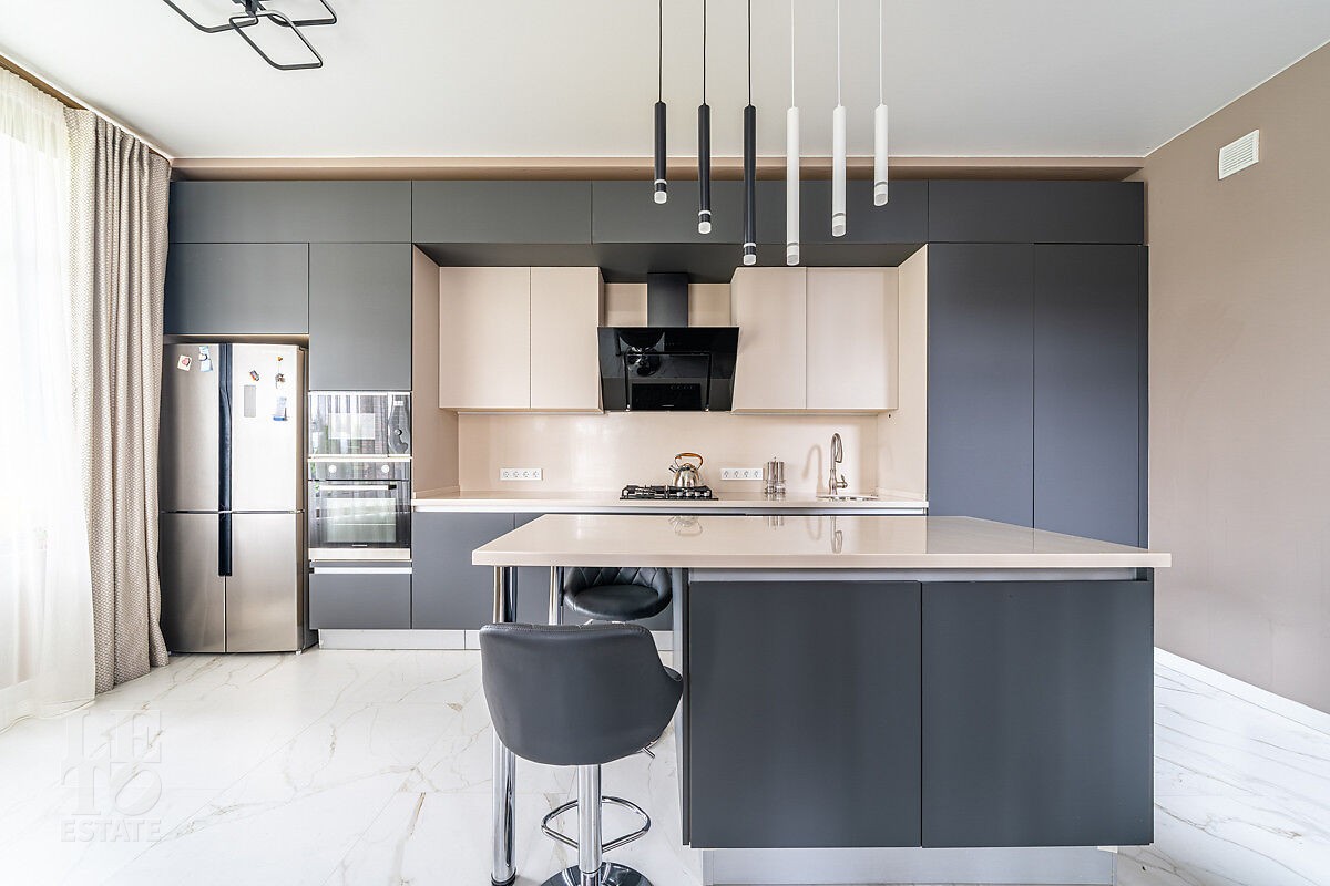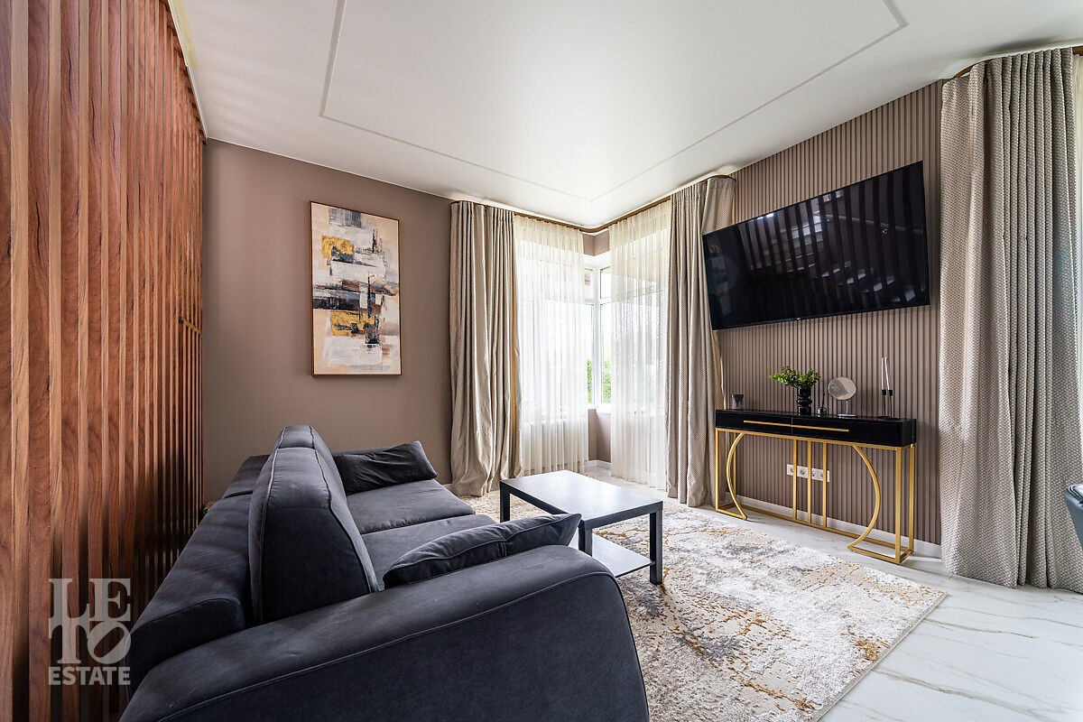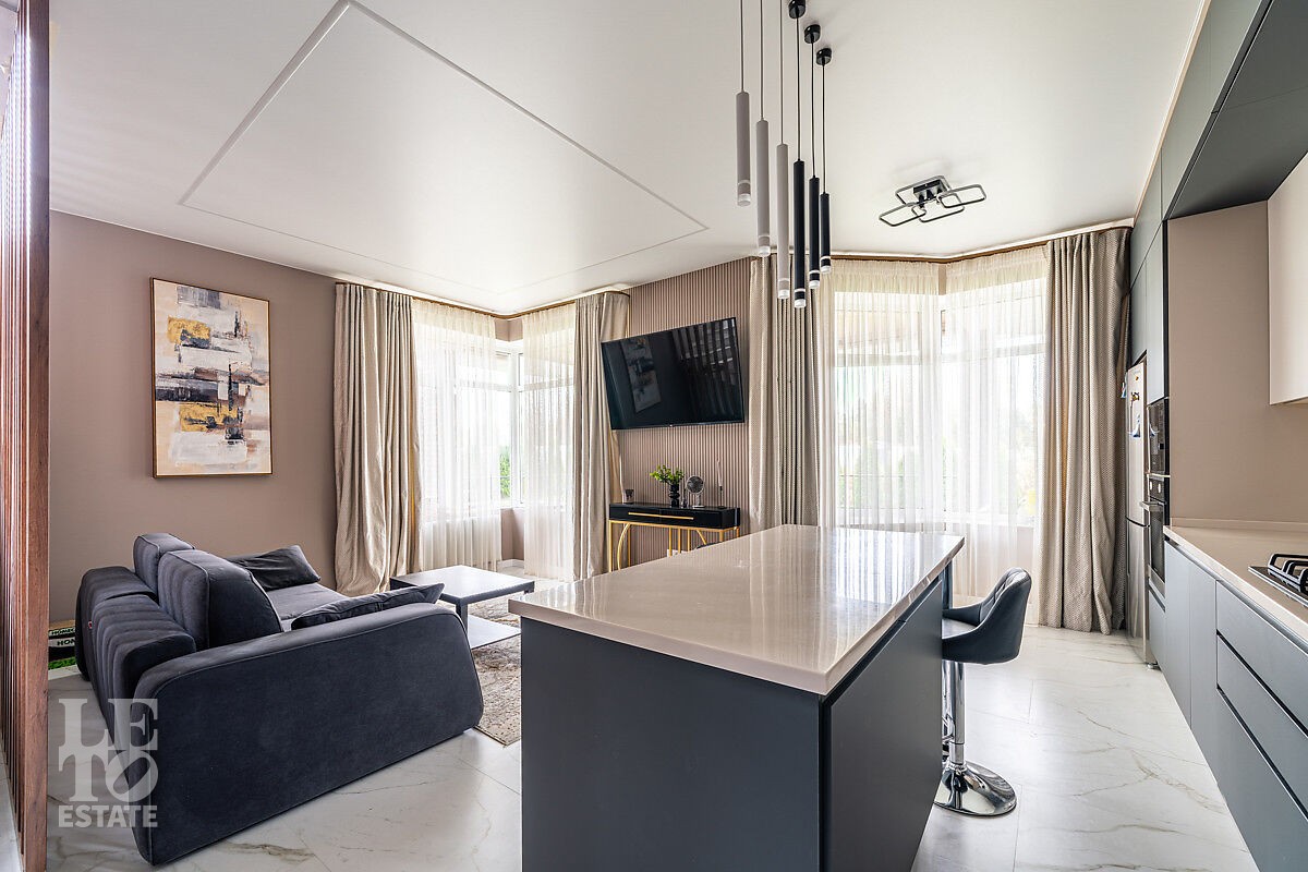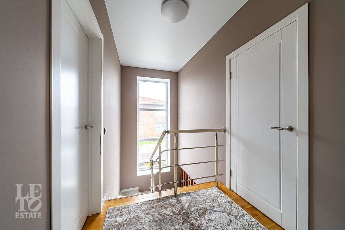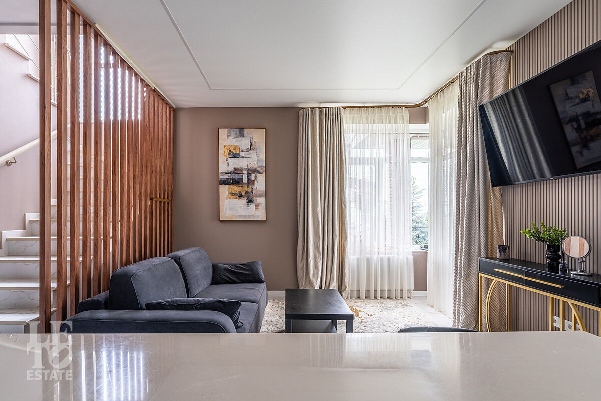 Дуплекс выполнен из качественных строительных материалов. Стены - кирпич. Фундамент - ленточный. Кровля - металлочерепица. Дизайн интерьера выполнен в современном стиле из дорогих строительных материалов и в светлых тонах. Дом полностью меблирован и укомплектован всей необходимой бытовой техникой от ведущих мировых производителей. Лестница, пол и подоконники выполнены из керамогранита, полы в зоне плитки с подогревом. Столешница и фартук кухонного гарнитура выполнены из искуственного камня. Установлен видеодомофон. Интернет - оптоволокно. Мебель и шторы входят в стоимость.