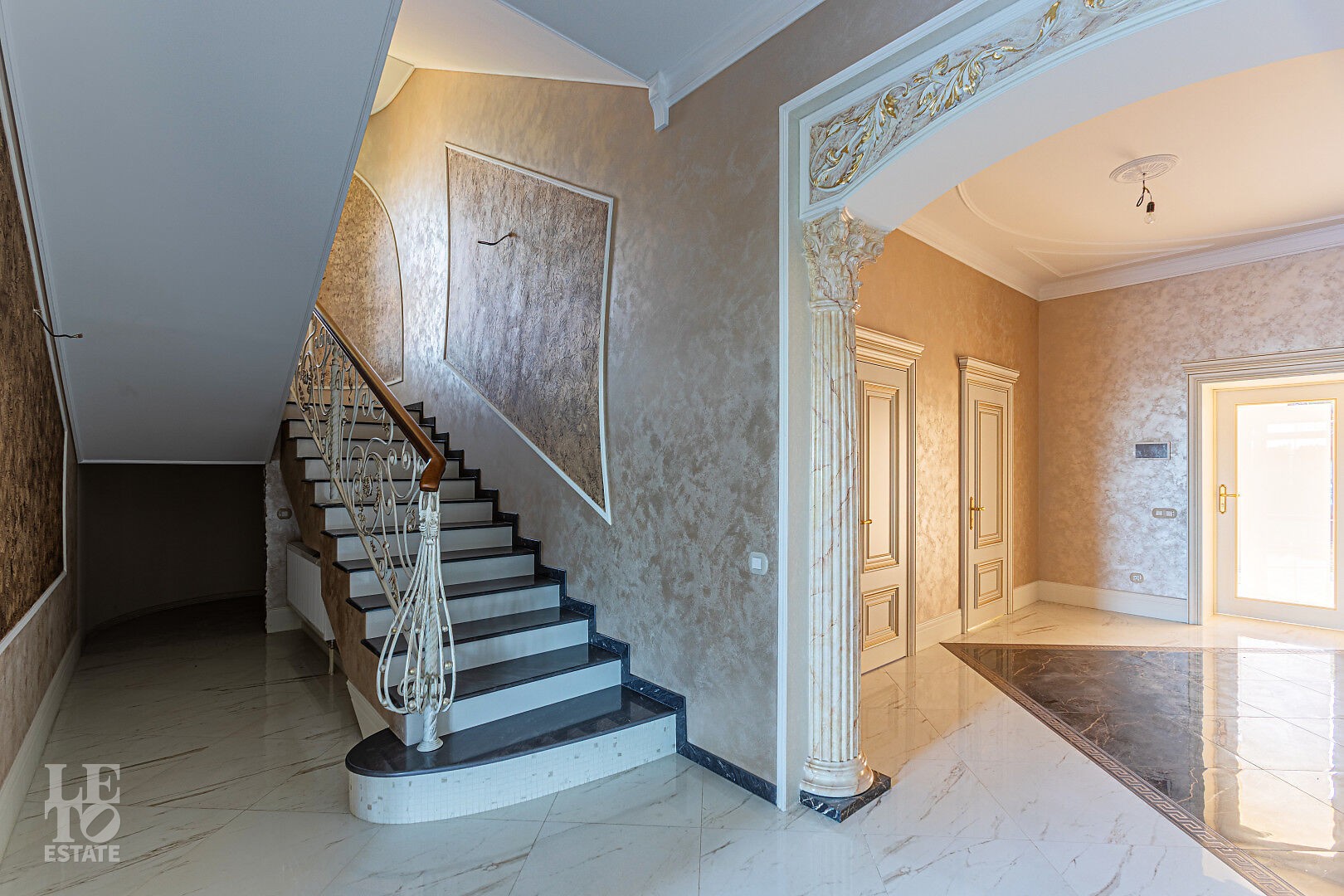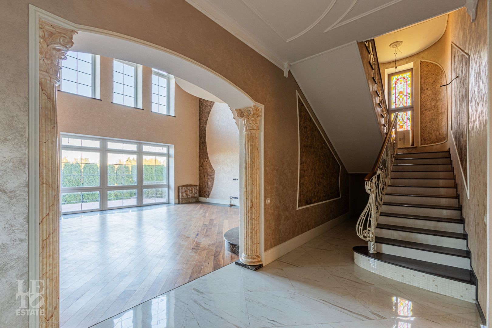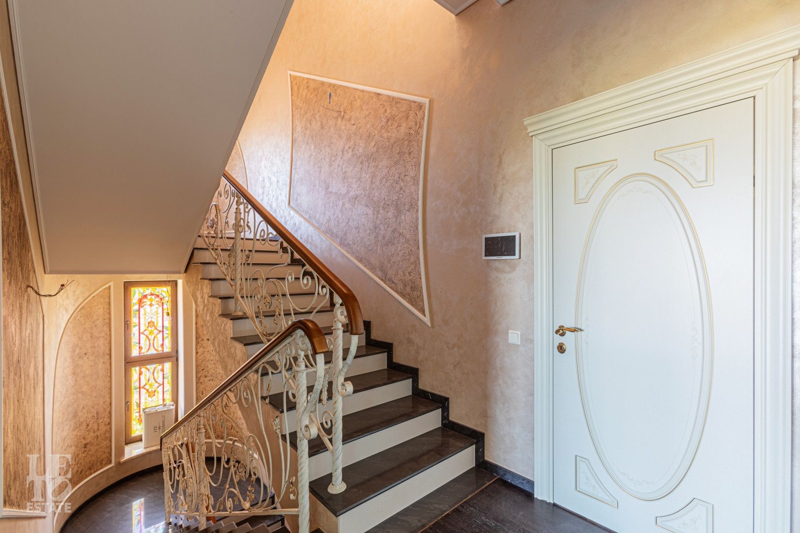 Лестница: Эксклюзивные перила ручной ковки с патиной и мраморные ступени. Витражные окна создают уникальную игру света;
