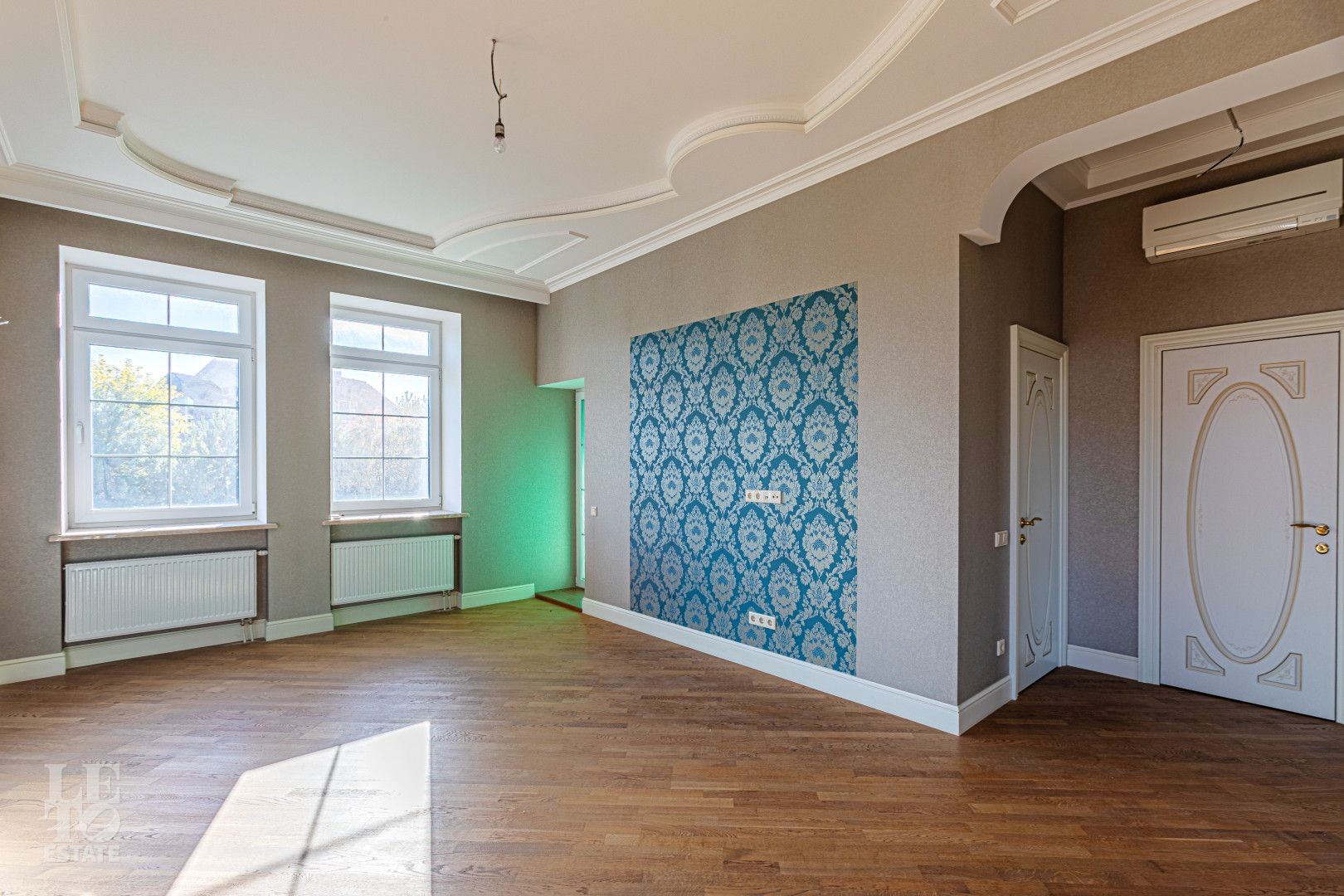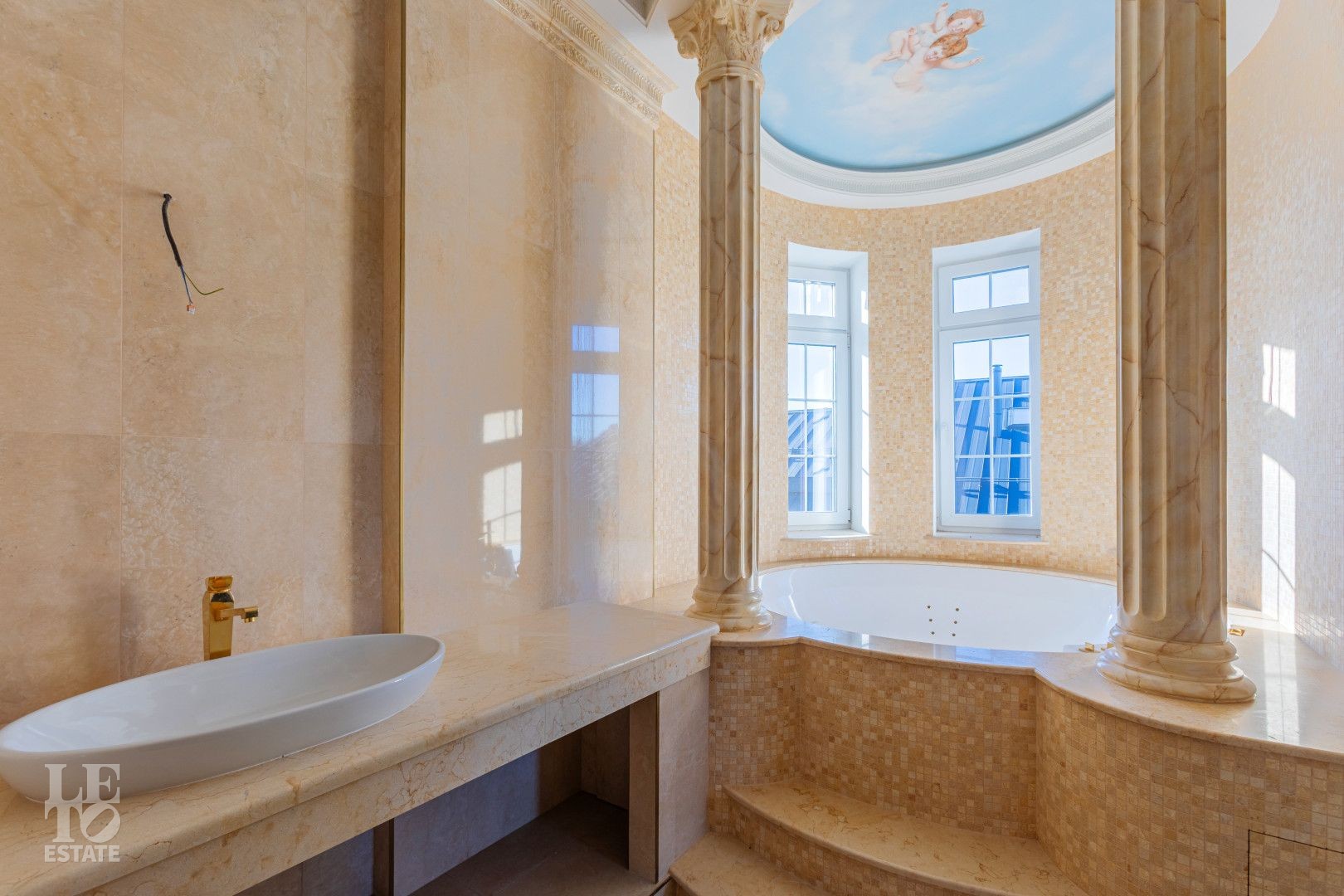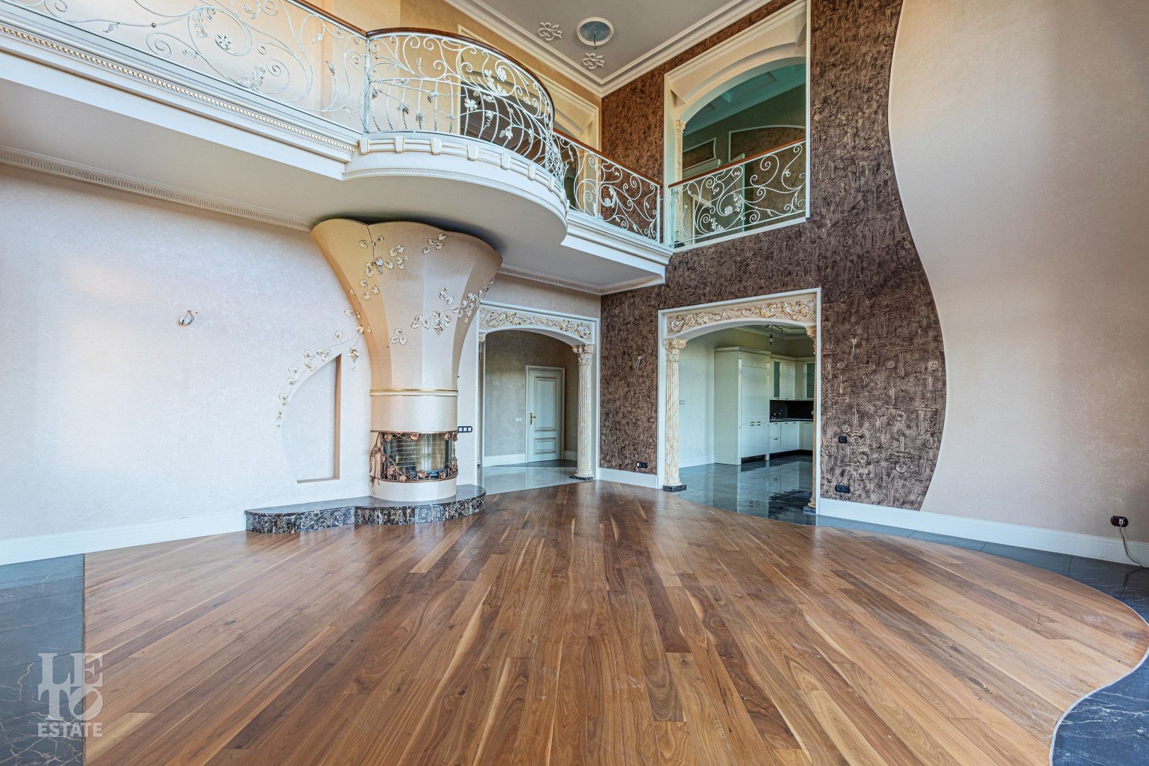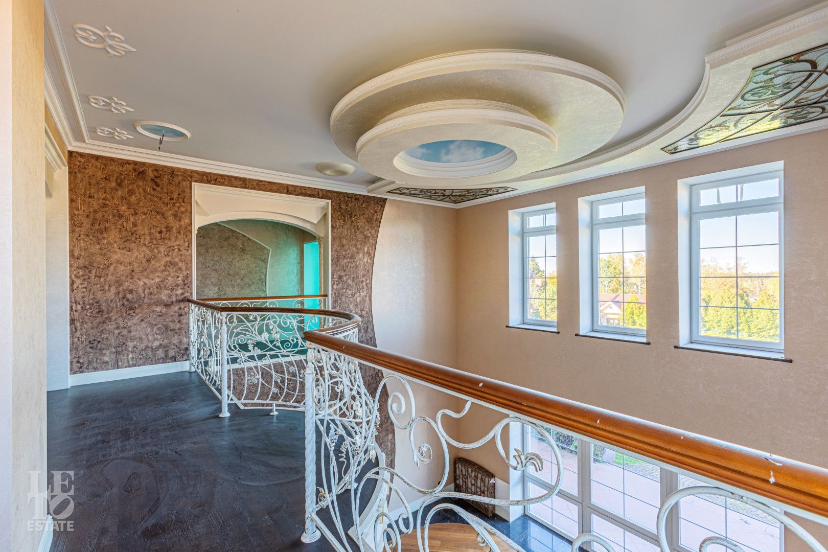 Лестница: Эксклюзивные перила ручной ковки с патиной и мраморные ступени. Витражные окна создают уникальную игру света;