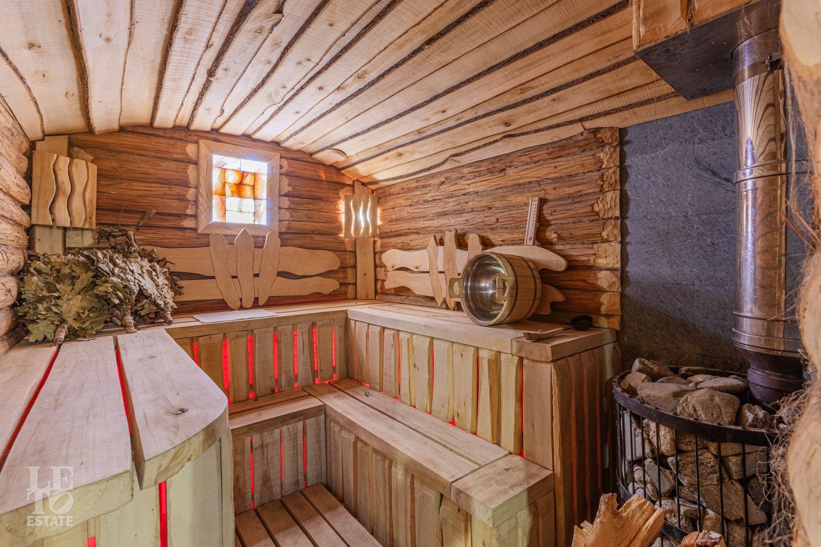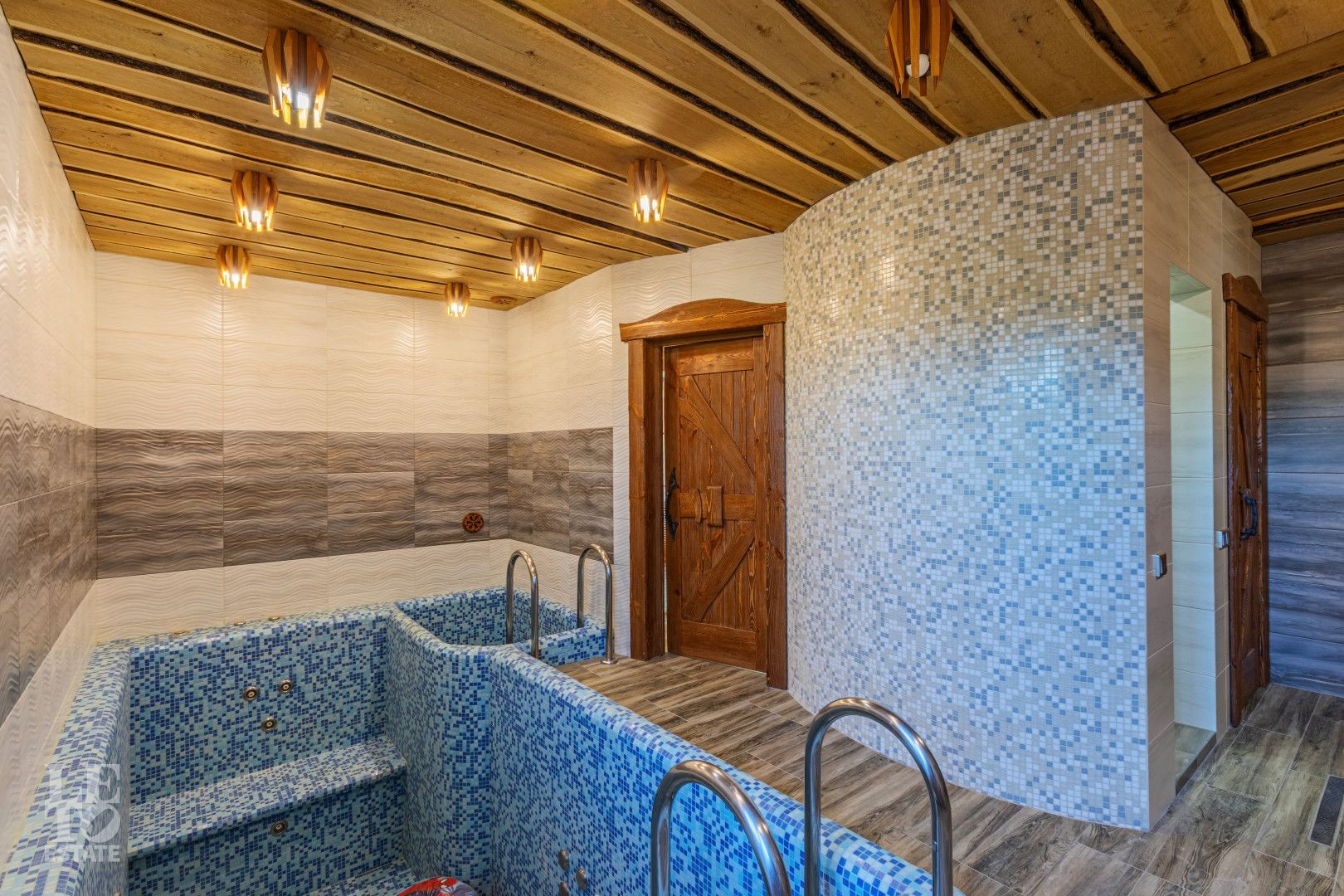 Первый этаж: комната отдыха, помывочная зона, хамам, русская парная с гималайской солью, бассейн с гидромассажем глубиной до 2 метров, купель, санузел, душ.