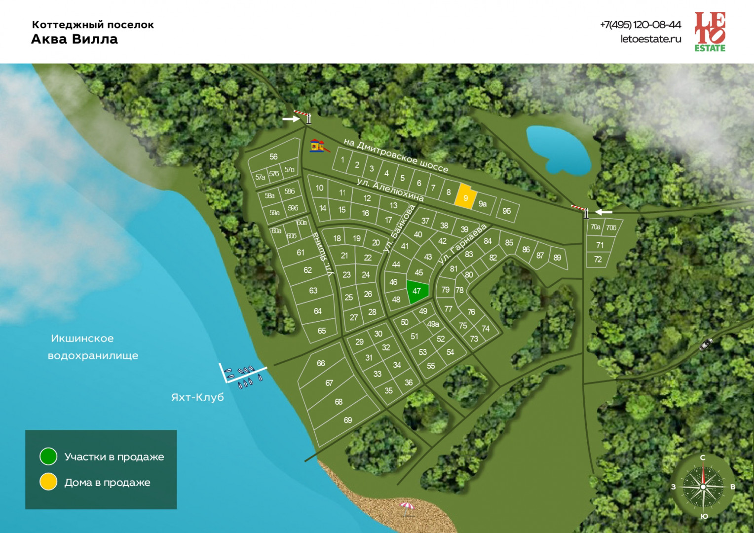 Агентство загородной недвижимости LETO Estate предлагает вам возможность ближе ознакомиться с поселком «Аквавилла», схема которого позволит лучше разобраться в особенностях местности. Коттеджный поселок бизнес-класса располагается в 40 км от МКАД по Дмитровскому шоссе. Также к поселку можно добраться по Ярославскому шоссе. Месторасположение поселка было выбрано не зря. Коттеджный поселок «Аква Вилла» сегодня пользуется большой популярностью из-за уникальности расположения возле воды. Территория КП прилегает к живописному Икшинскому водохранилищу. Собственный оборудованный причал возле поселка может сегодня принимать катера и яхты длиной до 8 метров. Это позволяет владельцу дома в поселке сменить свой автомобиль на водное средство передвижения. Минуя пресловутые пробки, от столицы до поселка можно будет добраться с ветерком по водным артериям Подмосковья. Коттеджный поселок «Аквавилла» (Дмитровское шоссе) расположен в окружении могучего леса. Около поселка протекают также такие реки, как: Клязьма, Уча, Яуза, Сукромка.