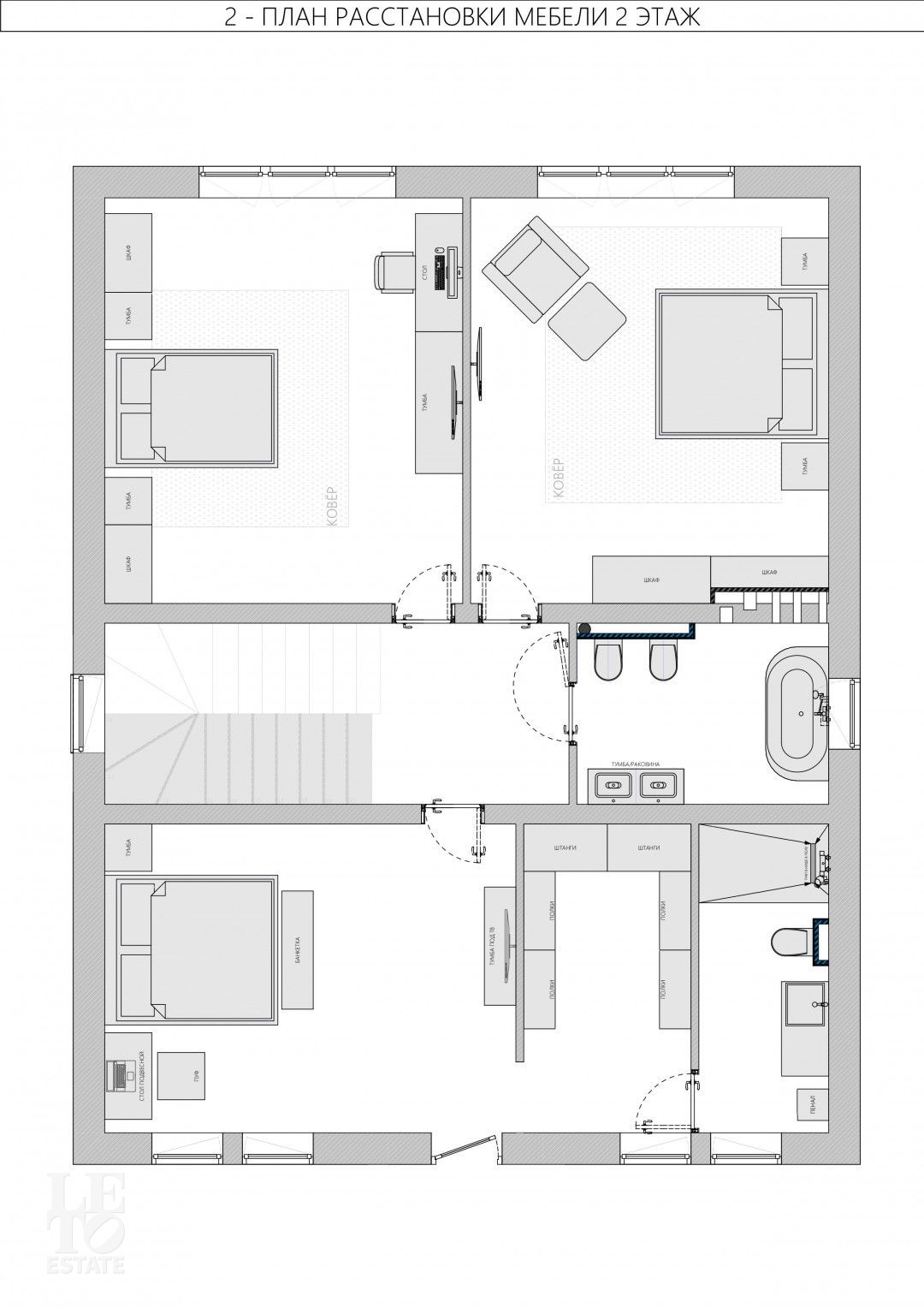 Второй этаж: мастер-спальня с гардеробной и санузед с душевой, две спальни, санузел с ванной