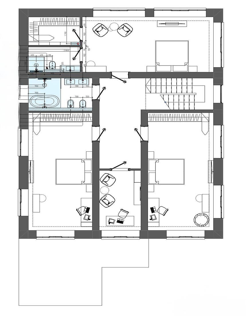 Второй этаж: мастер-спальня со своим санузлом и гардеробной, санузел, спальня с выходом на террасу, спальня, кабинет