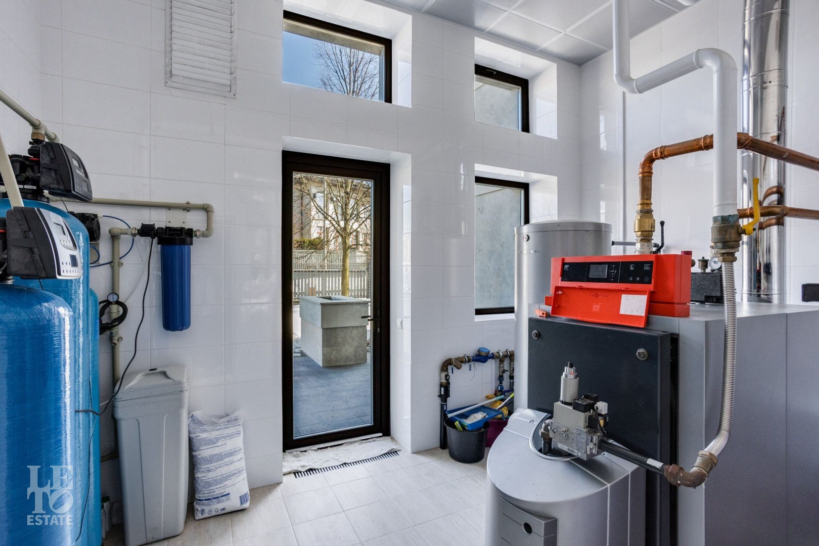 Первый этаж: прихожая, два холла, кухня, поварская, столовая, кабинет, гардеробная, тамбур, три санузла, серверная, квартира для персонала, постирочная, котельная, гараж на два машиноместа;