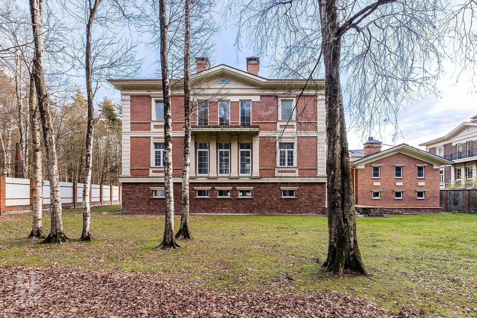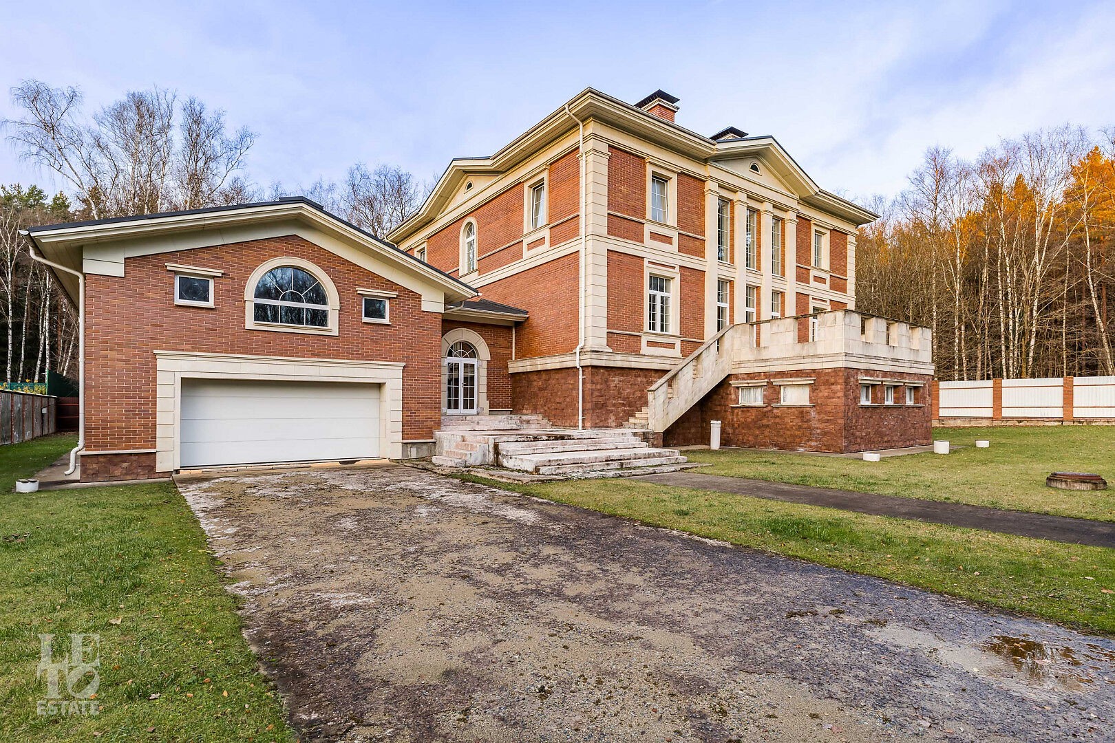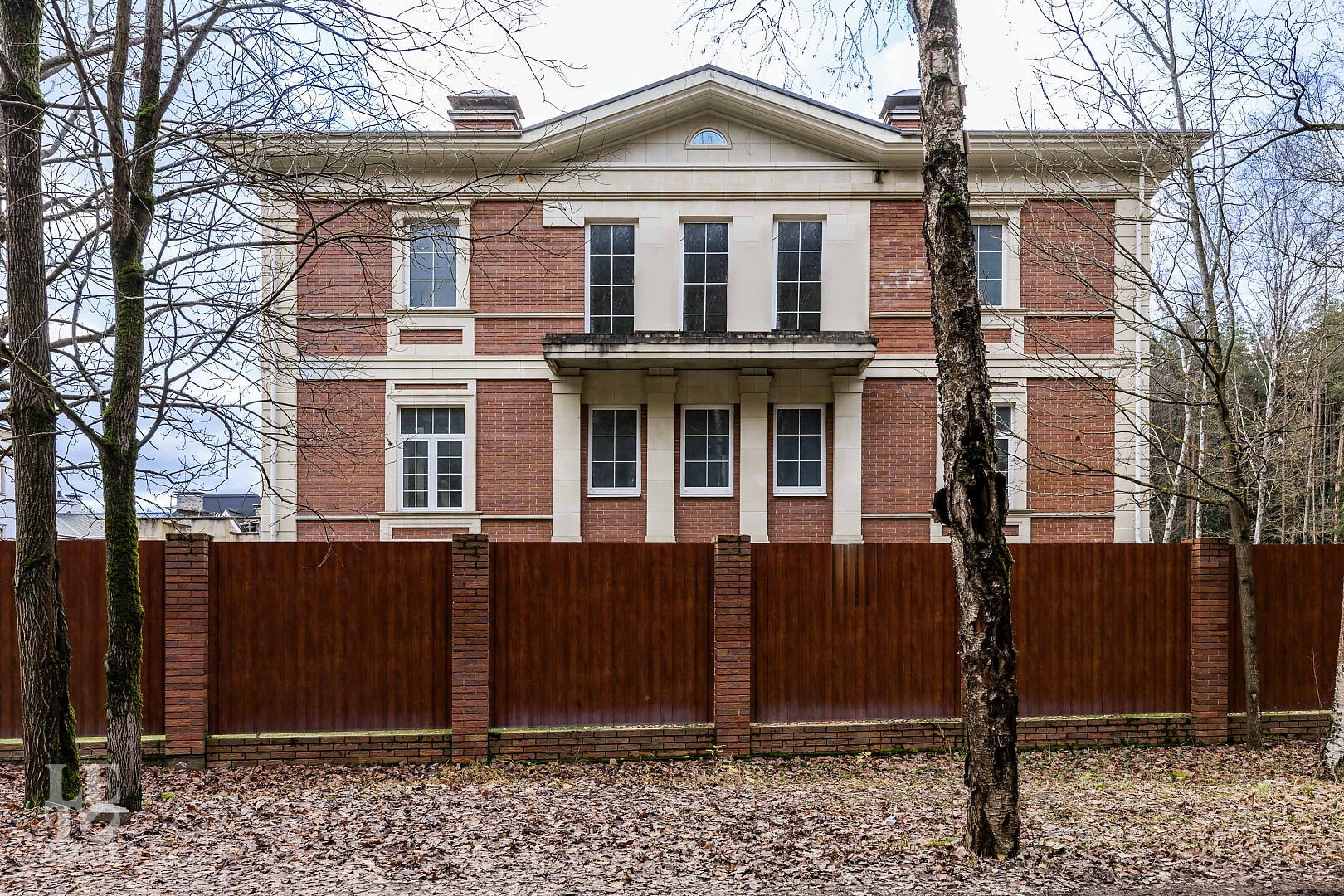 Дом построен из английского кирпича в классическом стиле, фасад украшают декоративные элементы: рельефная кладка и колонны у входа. Рядом с домом находится двухэтажный гараж, который построен в том же стиле и соединён с домом крытым переходом.
