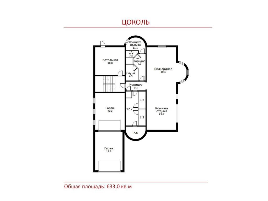 Цоколь: зона отдыха с бильярдной, сауна, душевая, санузел, винный погреб, комната для помощника, постирочная, котельная