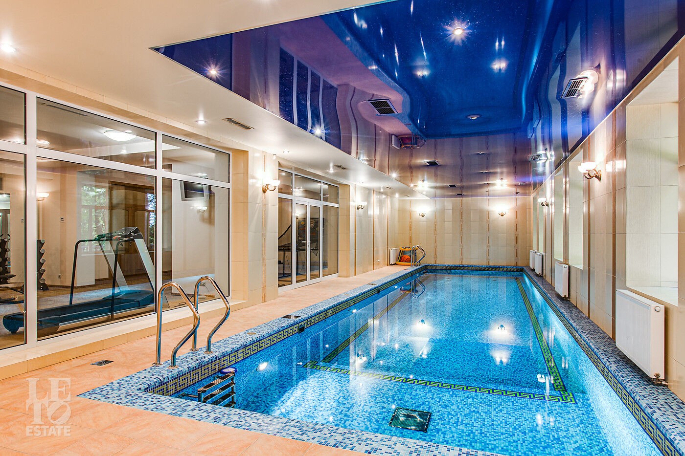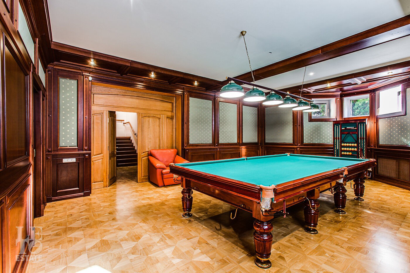 Цоколь (1 уровень): бассейн, спортзал, сауна, душевая, санузел, лифт, бильярдная, кинотеатр, постирочная, гладильная.
