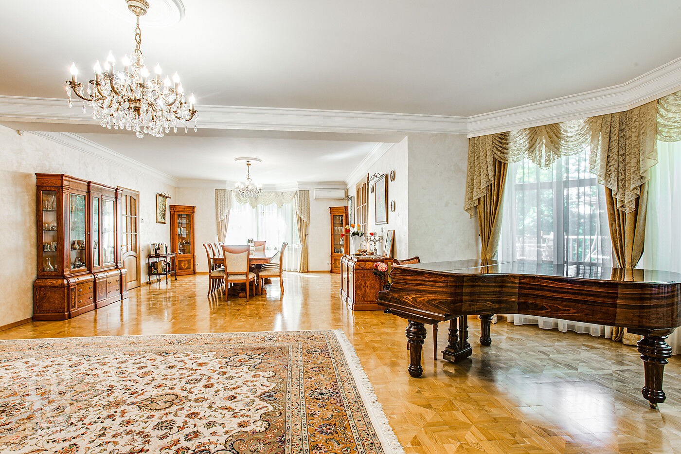 Первый этаж: прихожая, гардеробная, холл, кухня, столовая, гостиная с роялем, гостиная с камином, 2-х этажный зимний сад, лифт, санузел, кабинет с санузлом и душевой, выход на террасу, гараж на 2 м/м с зоной хранения (на антресоли), лифт.