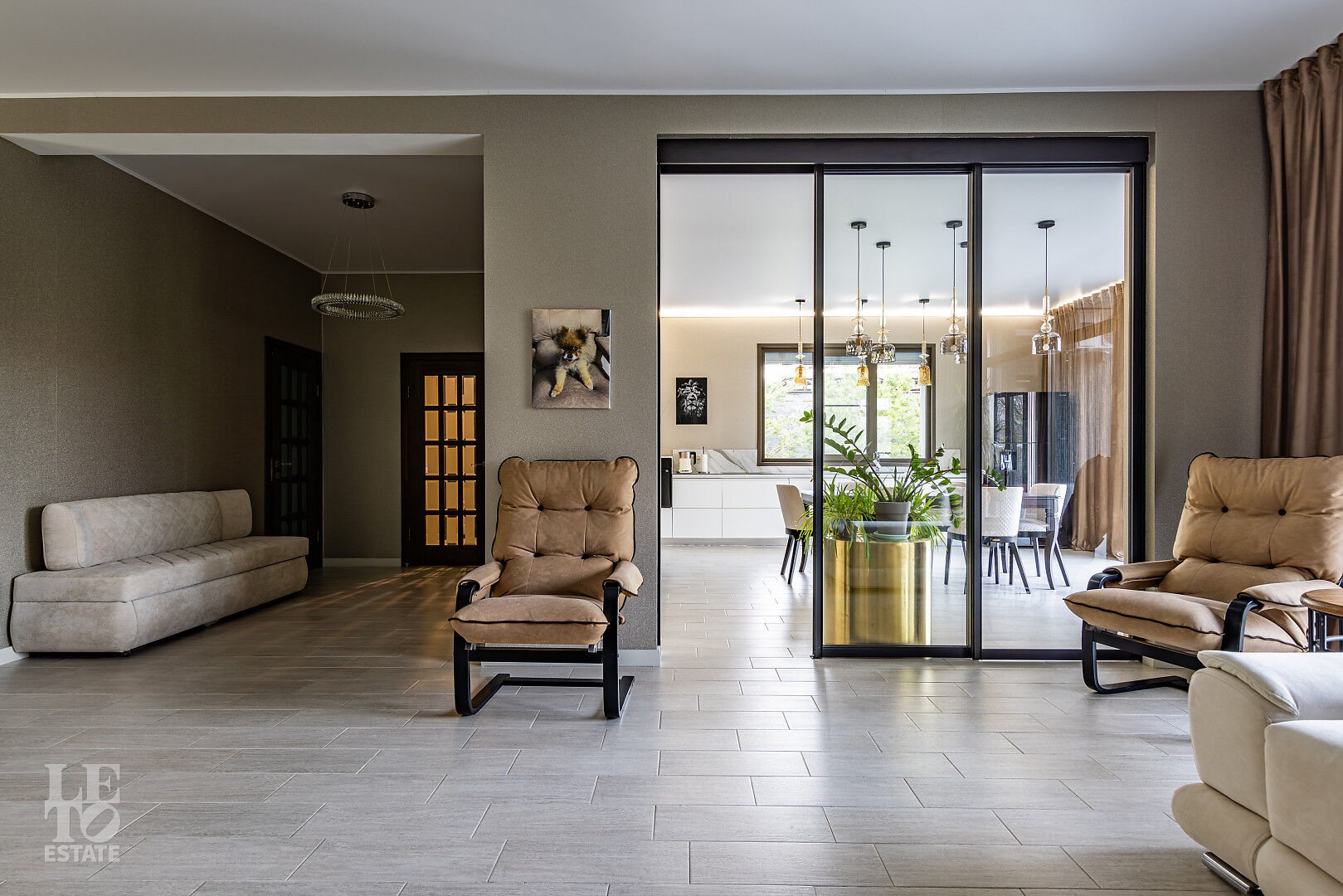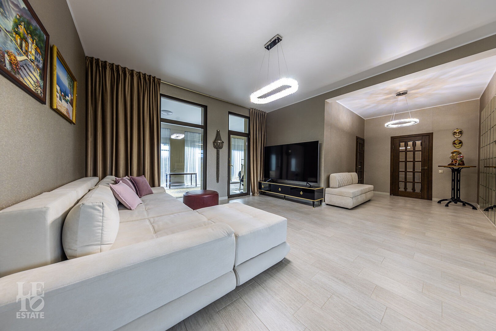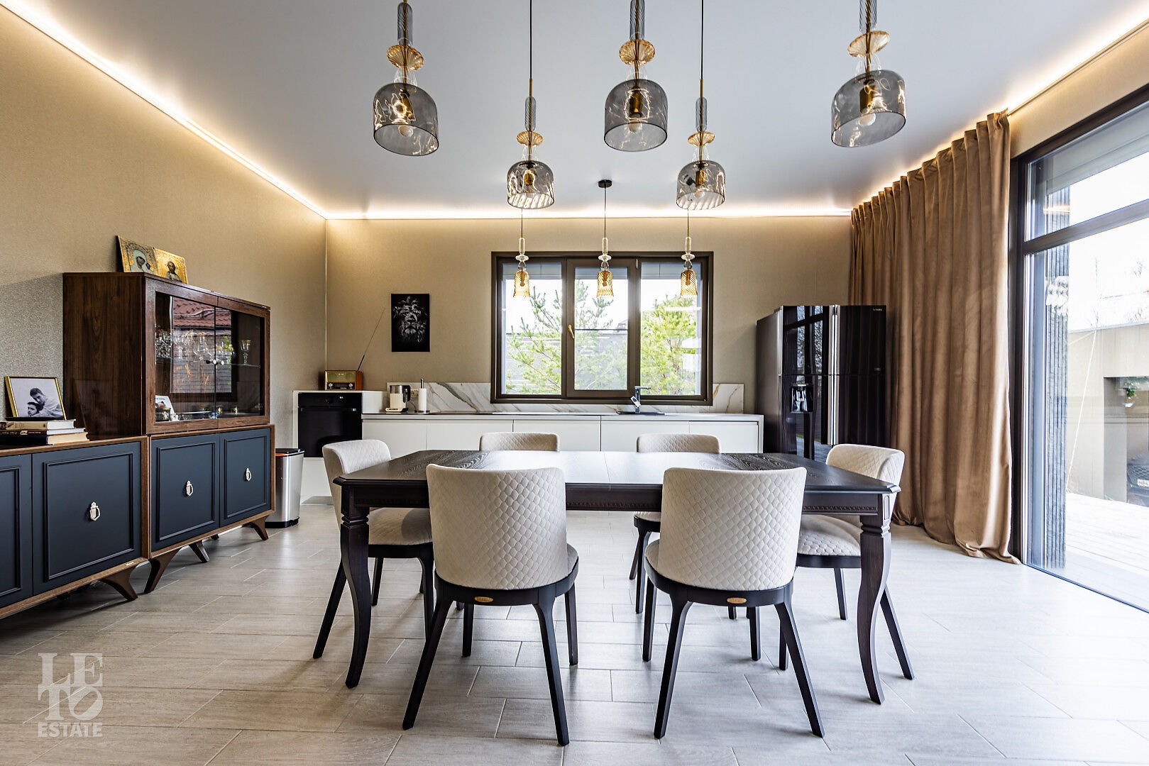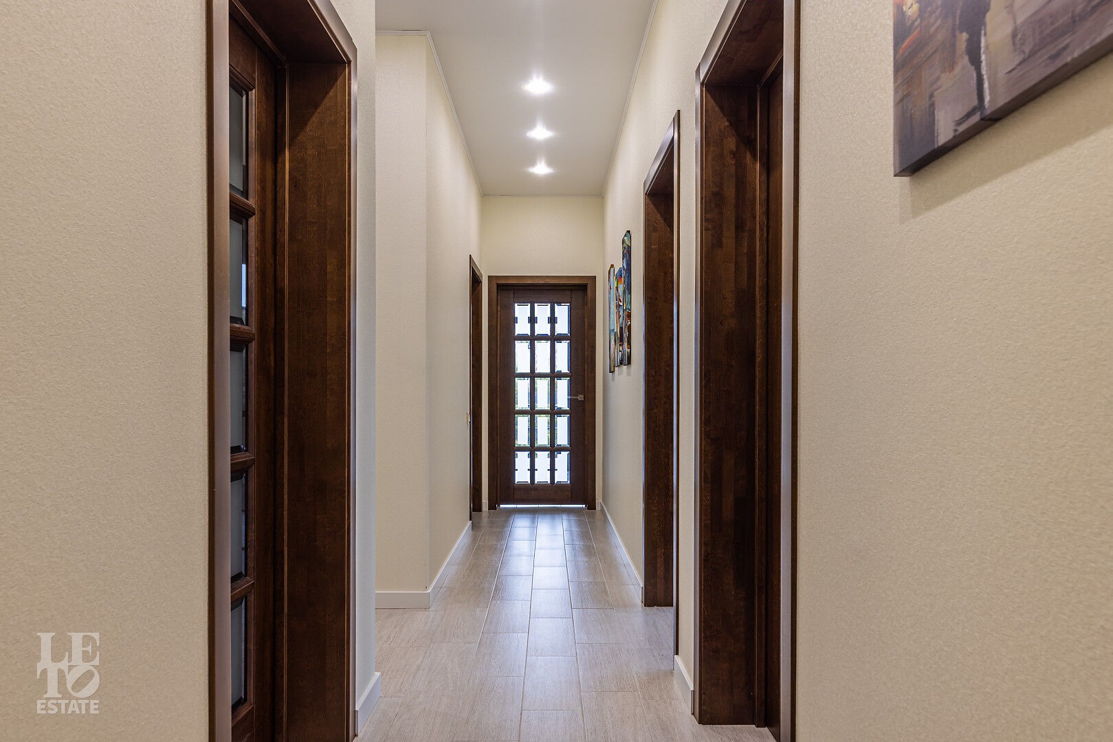 В доме просторная гостиная с выходом на крытую веранду, кухня- столовая с современной бытовой техникой, 4 спальни, 2 санузла, котельная, прихожая.