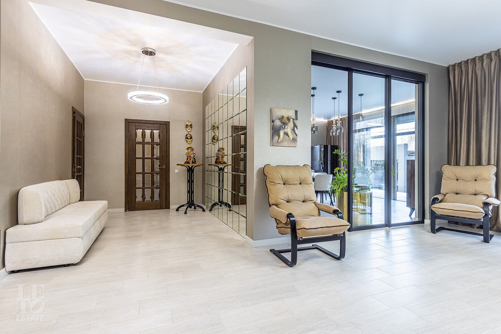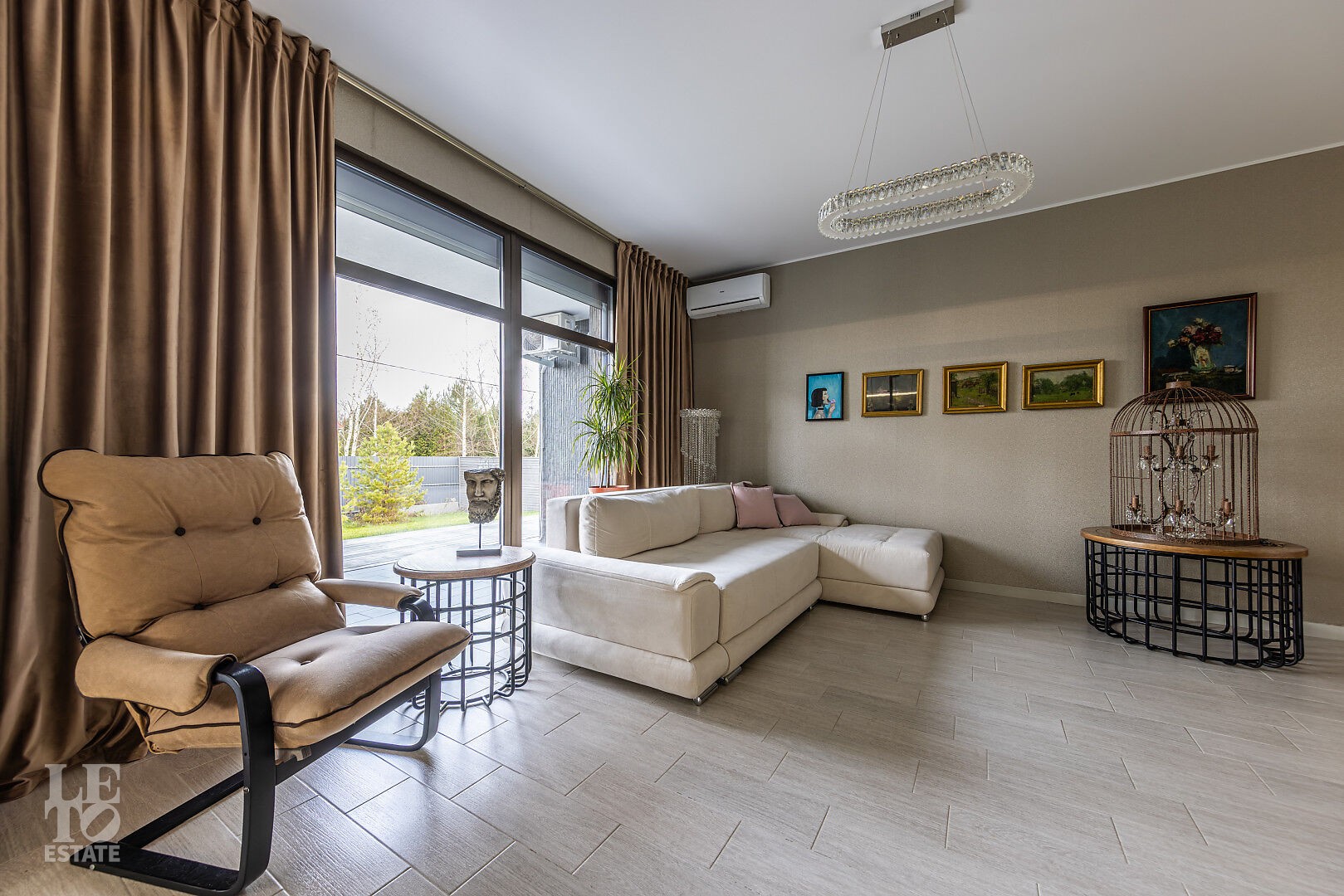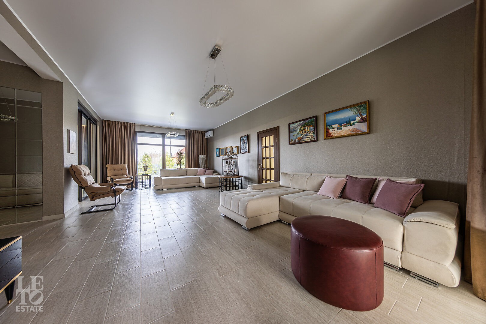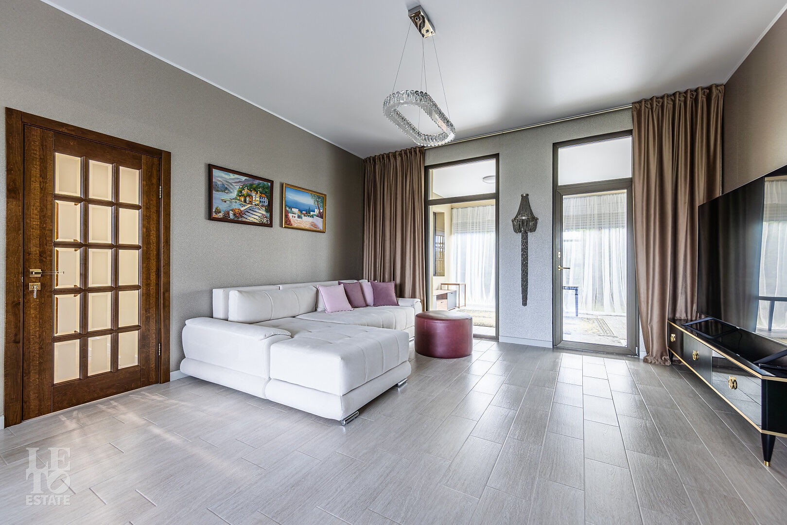 В доме просторная гостиная с выходом на крытую веранду, кухня- столовая с современной бытовой техникой, 4 спальни, 2 санузла, котельная, прихожая.