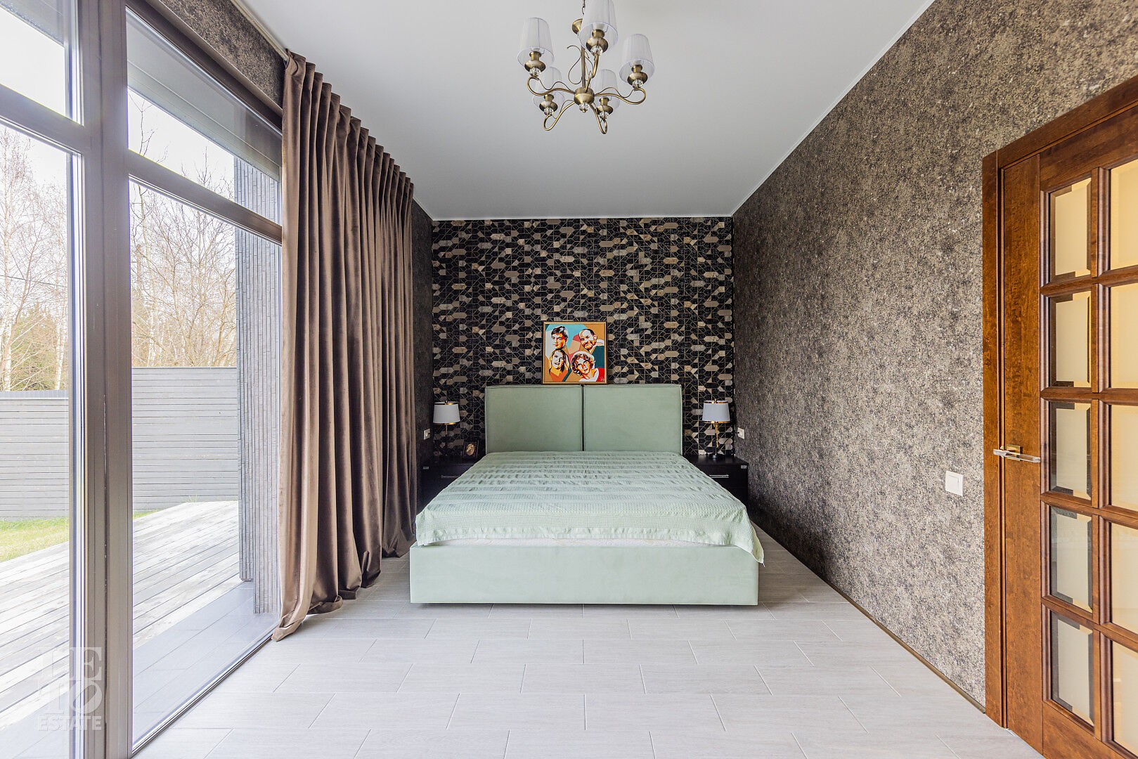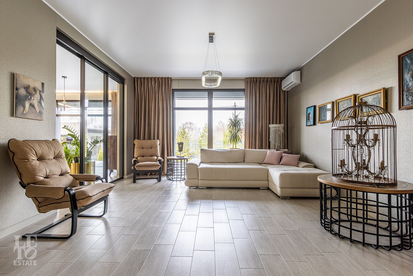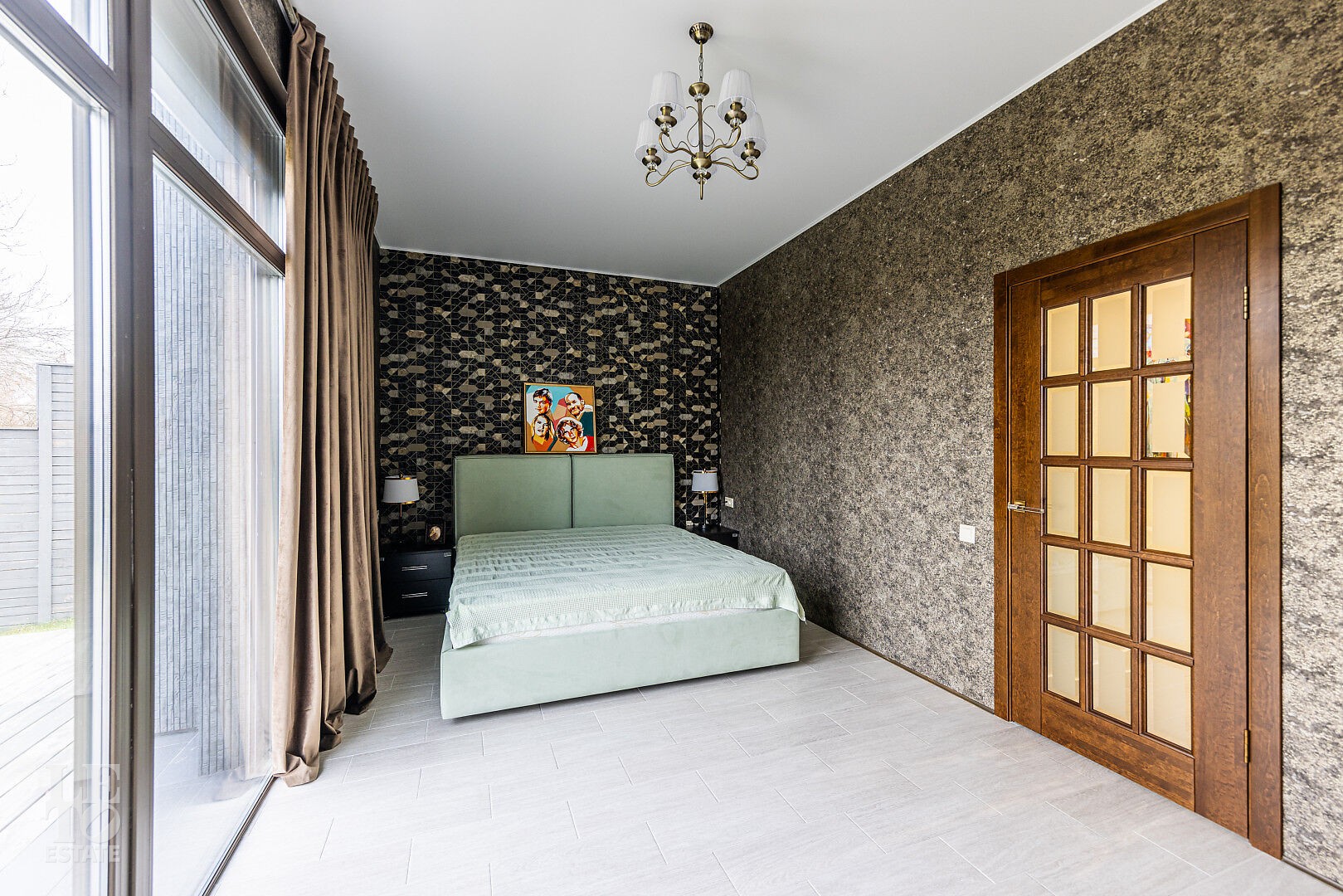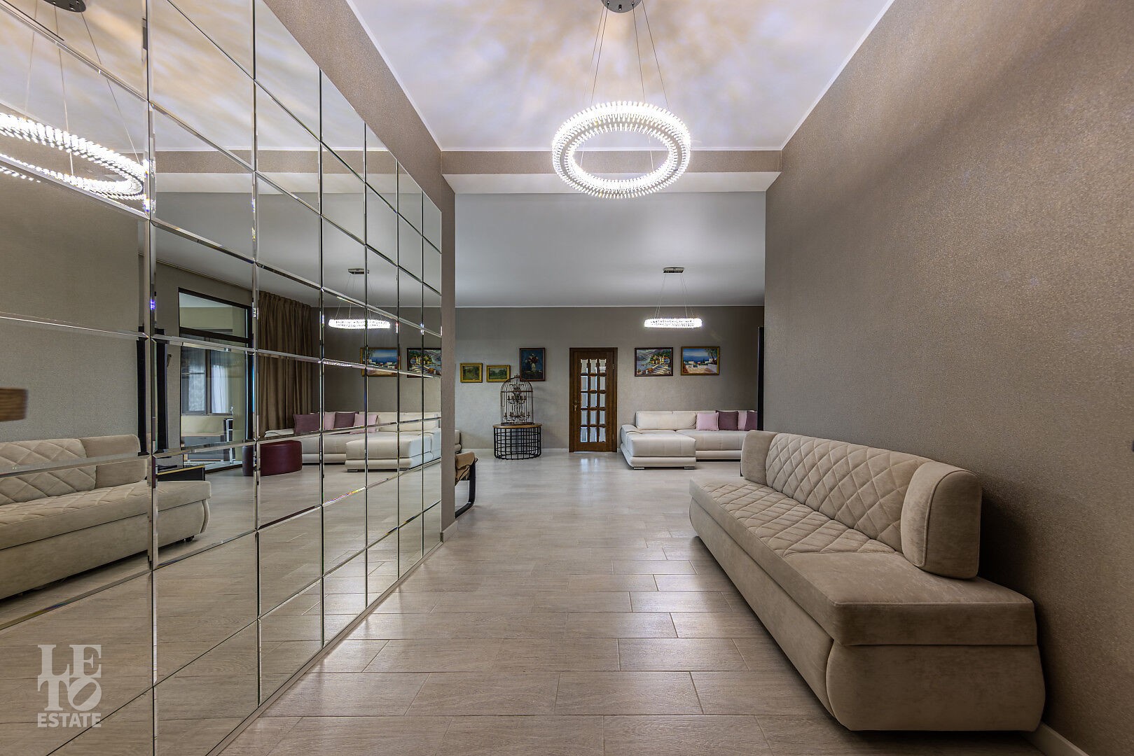 В доме просторная гостиная с выходом на крытую веранду, кухня- столовая с современной бытовой техникой, 4 спальни, 2 санузла, котельная, прихожая.