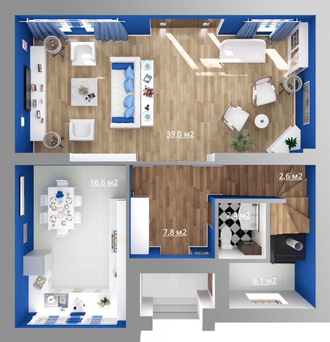 первый этаж: прихожая, кухня-столовая, гостиная, санузел