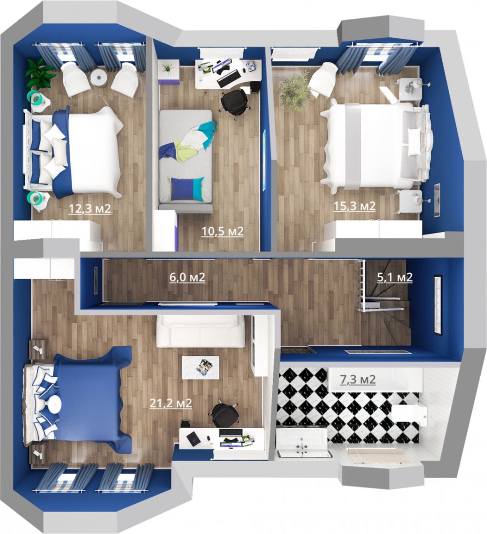 второй этаж: мастер-спальня с санузлом, две спальни, санузел