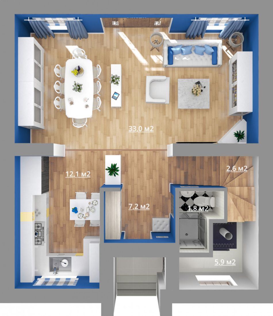 первый этаж: прихожая, кухня-столовая, гостиная, санузел