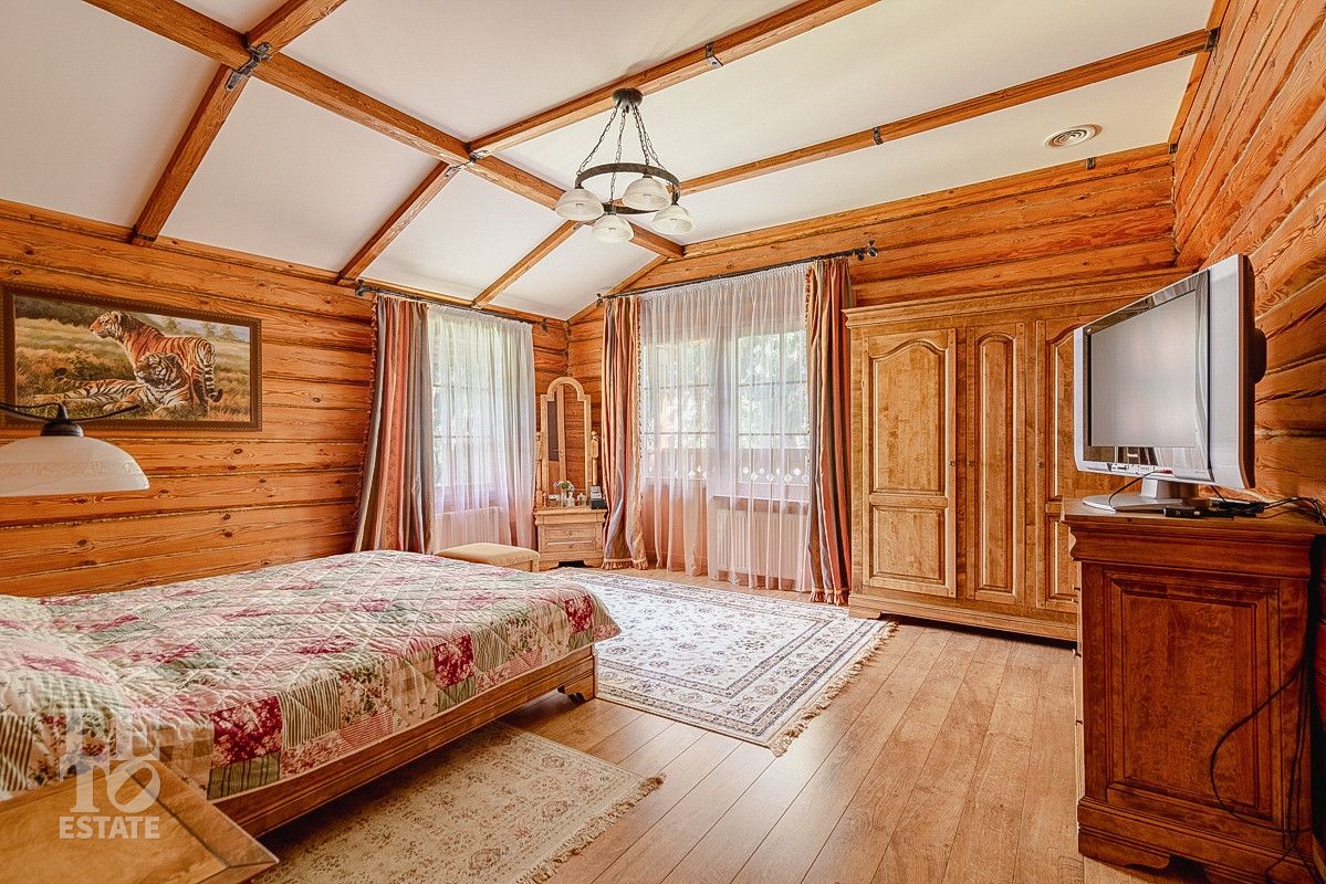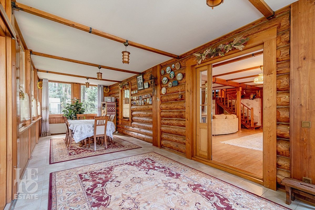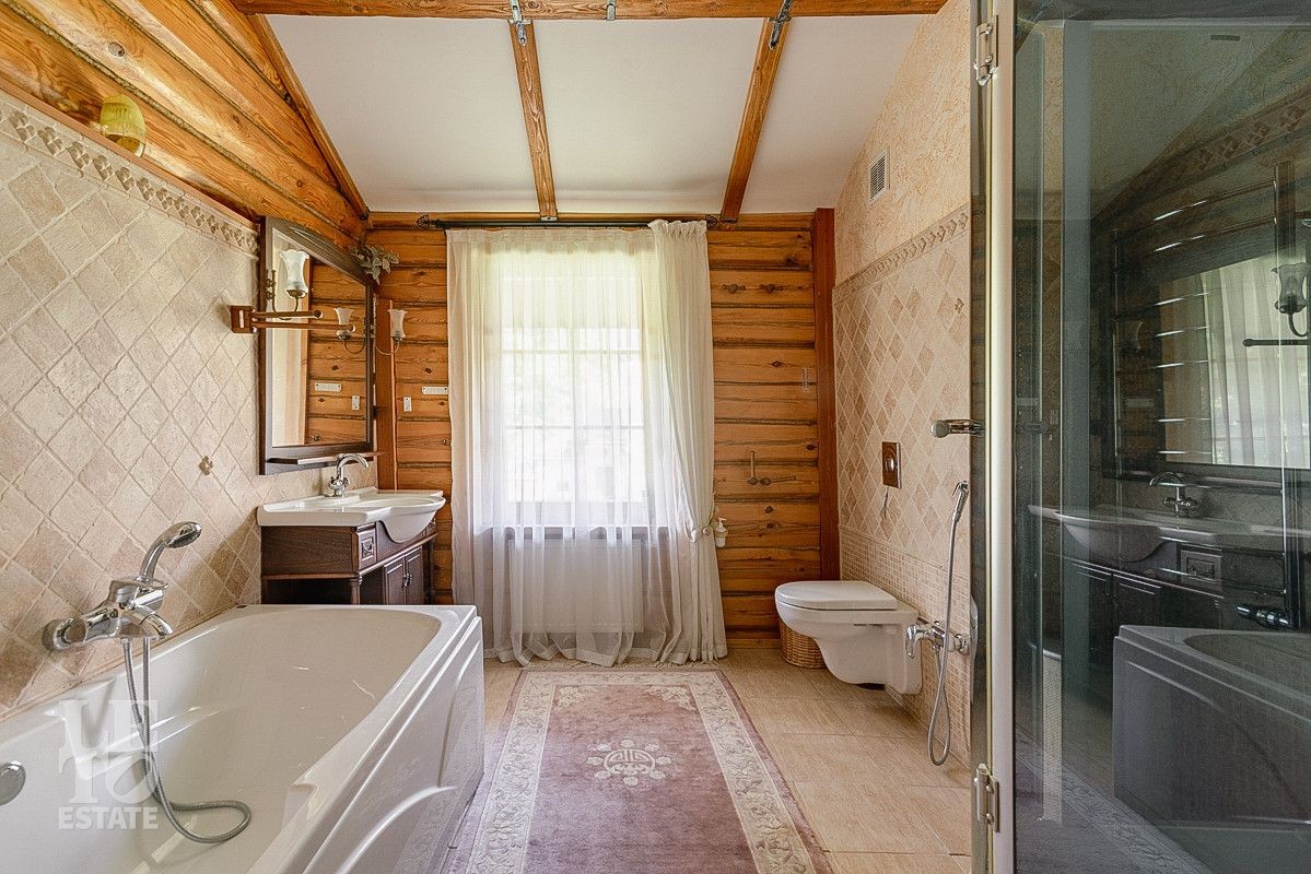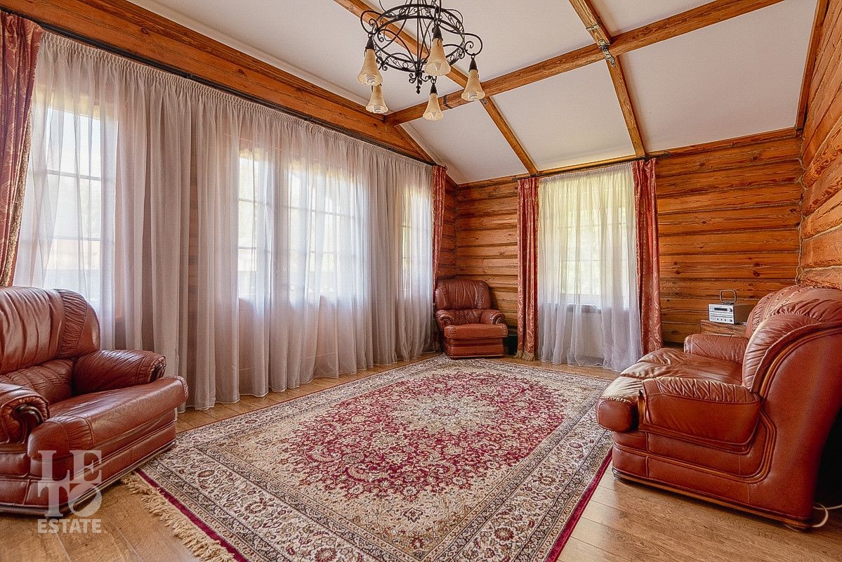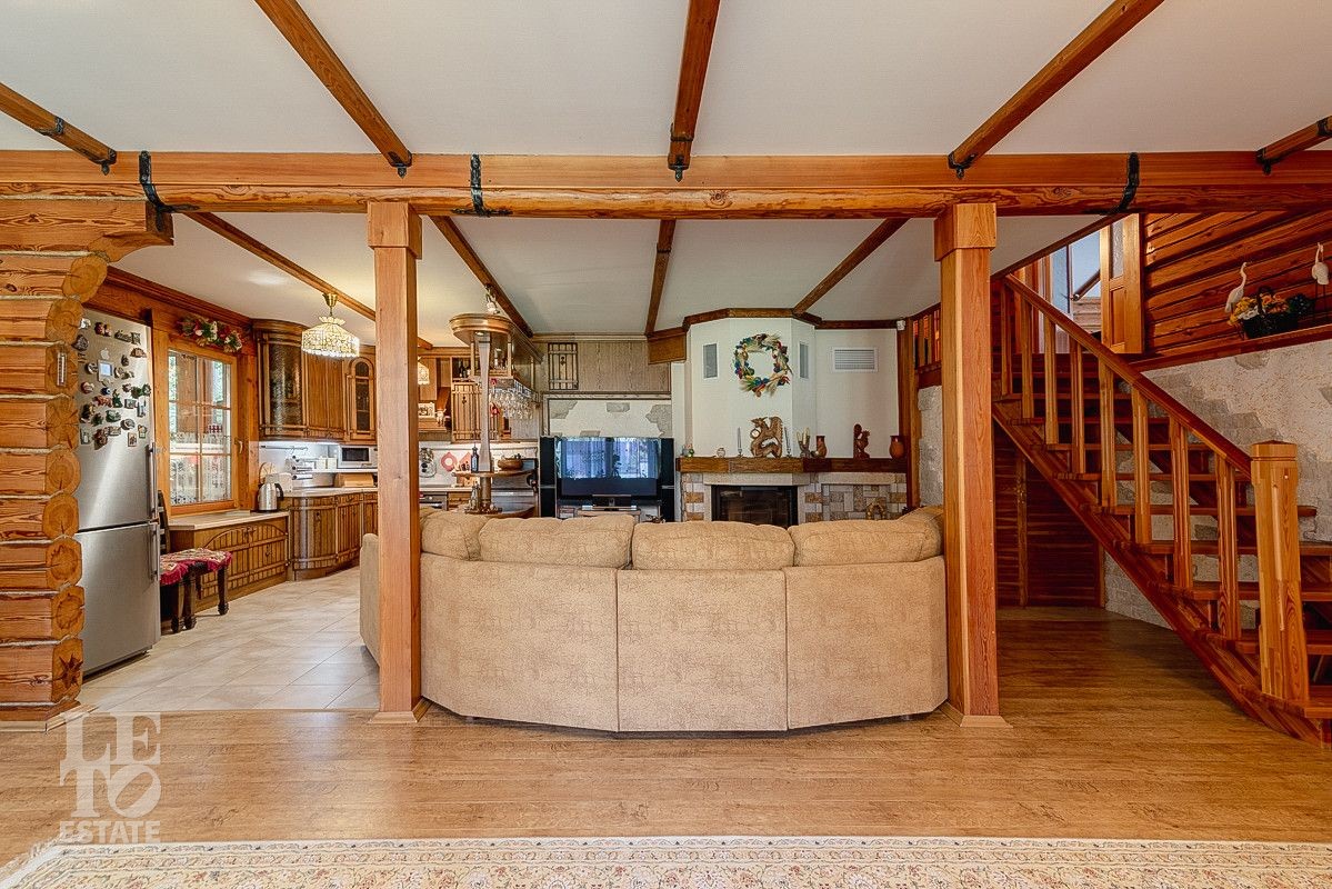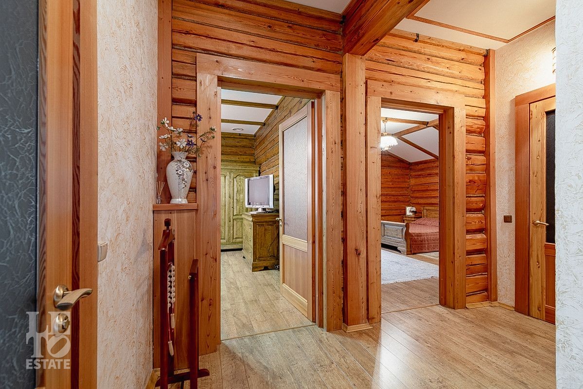 Дом построен из бревна: воплощение комфорта и уюта. Одним из основных достоинств дома является экологичность используемых материалов. Более того, в деревянном доме всегда создается уютная и теплая атмосфера, что благотворно влияет на здоровье и настроение. Брус обладает высокой плотностью и малой теплопроводностью, благодаря чему тепло внутри дома долго задерживается, а воздух не перегревается. Внутри дома используются только натуральные материалы, мебель выполнена на заказ. В доме разведены теплые полы, на цокольном этаже установлено кондиционирование. В доме во всех помещениях выполнена вытяжная вентиляция.