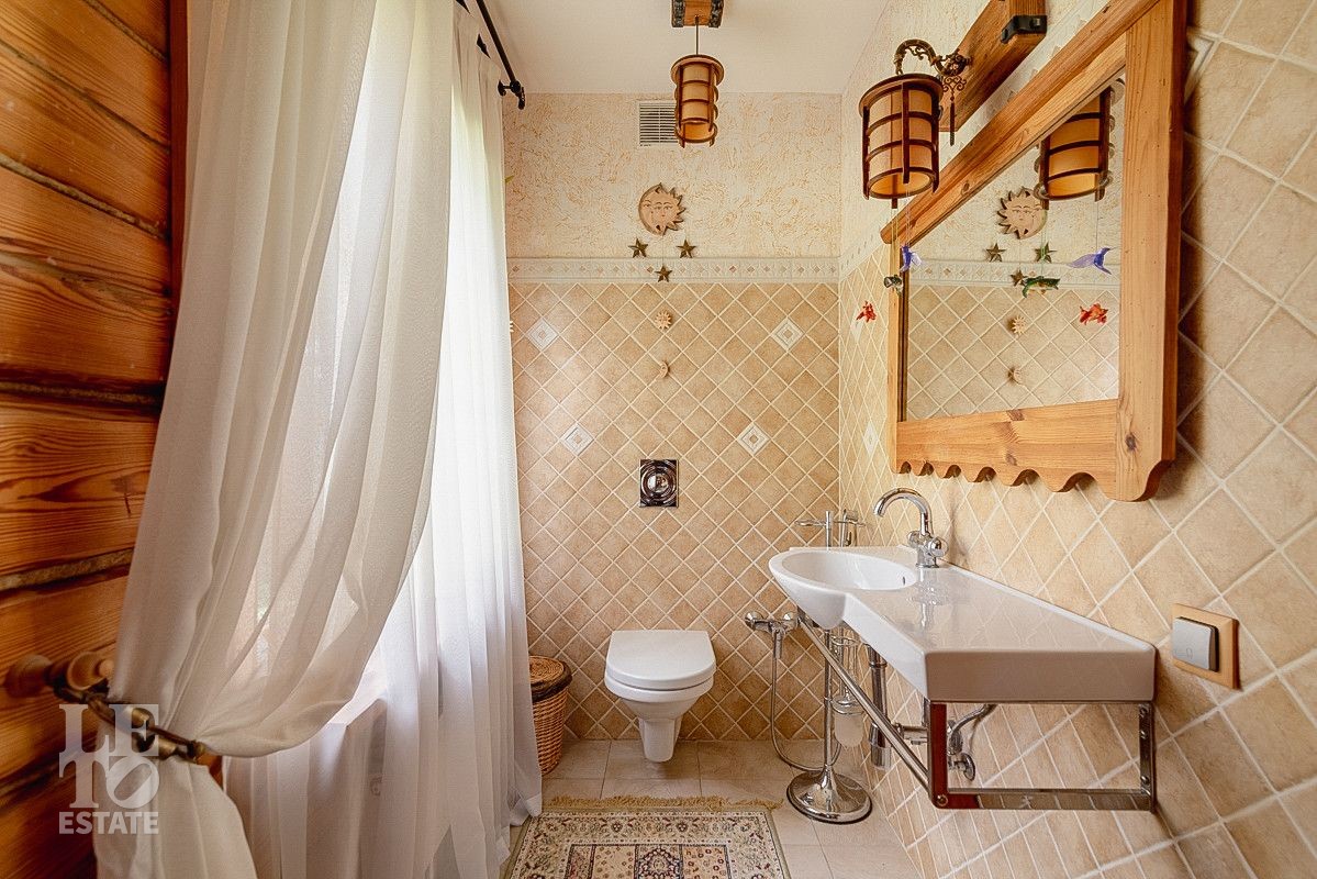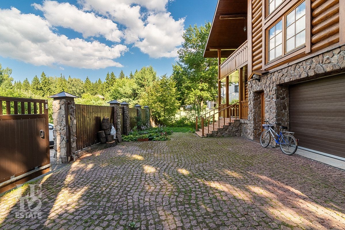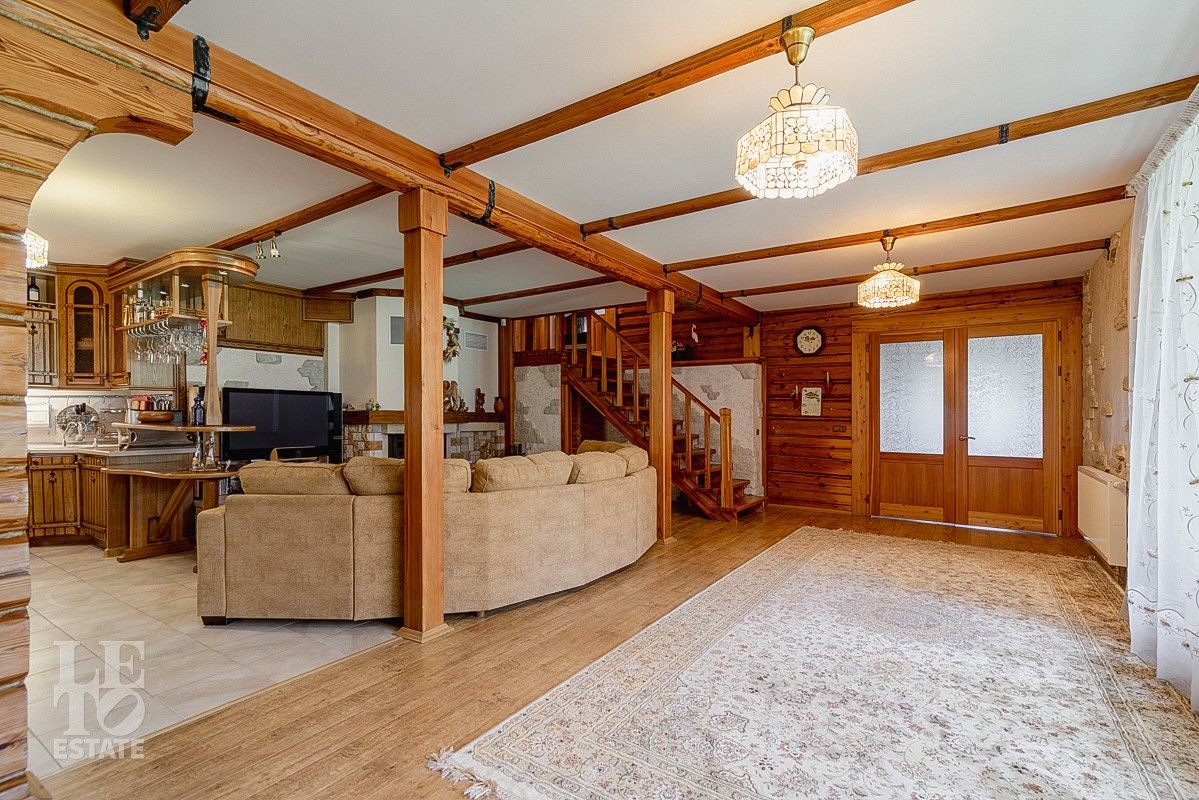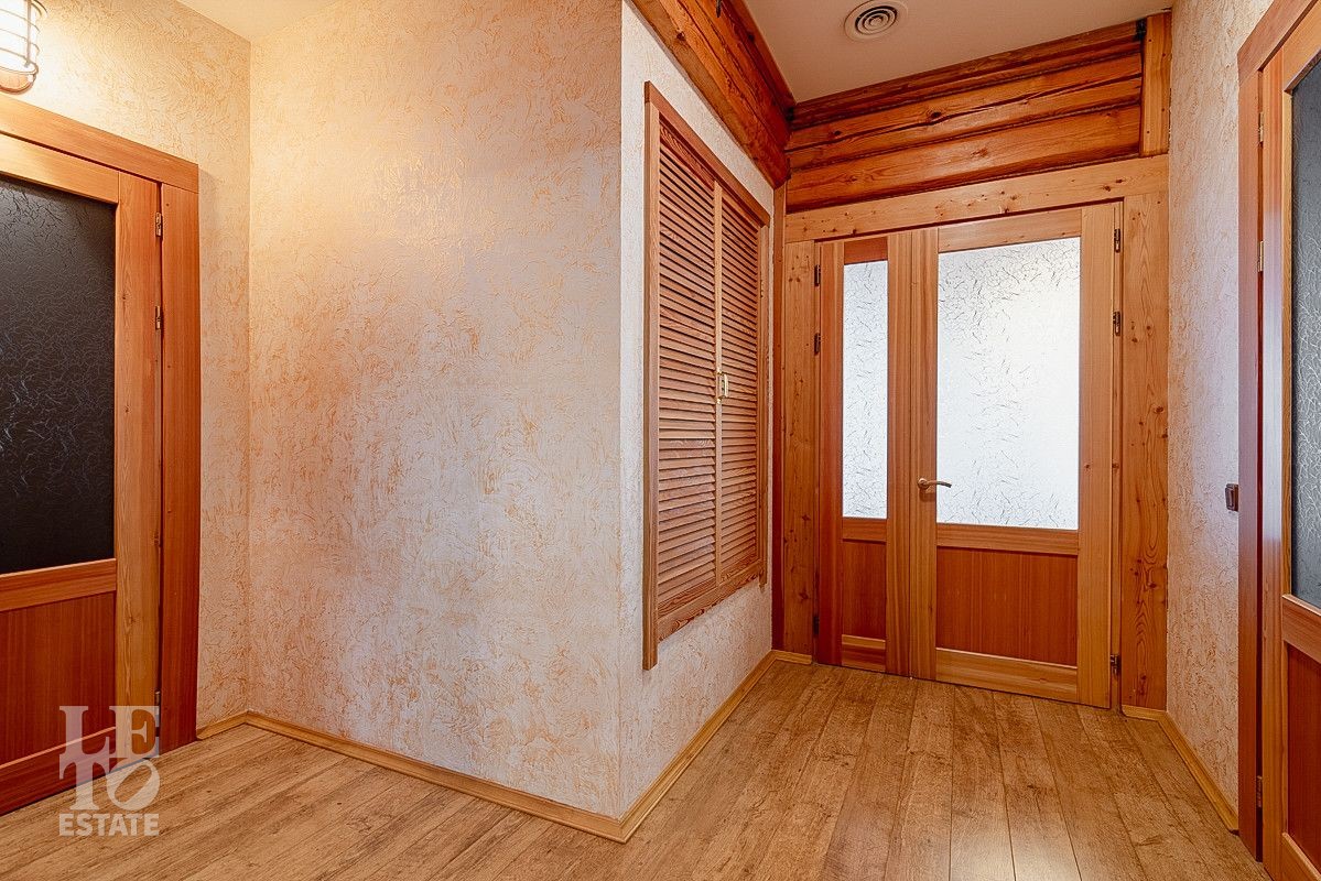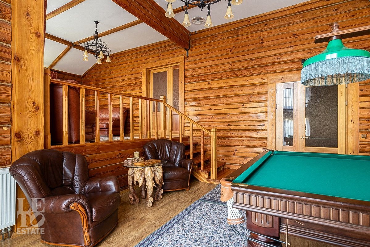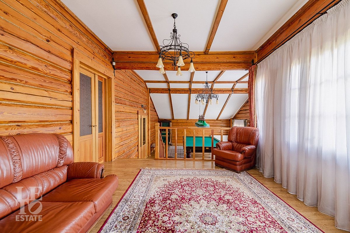 Дом построен из бревна: воплощение комфорта и уюта. Одним из основных достоинств дома является экологичность используемых материалов. Более того, в деревянном доме всегда создается уютная и теплая атмосфера, что благотворно влияет на здоровье и настроение. Брус обладает высокой плотностью и малой теплопроводностью, благодаря чему тепло внутри дома долго задерживается, а воздух не перегревается. Внутри дома используются только натуральные материалы, мебель выполнена на заказ. В доме разведены теплые полы, на цокольном этаже установлено кондиционирование. В доме во всех помещениях выполнена вытяжная вентиляция.