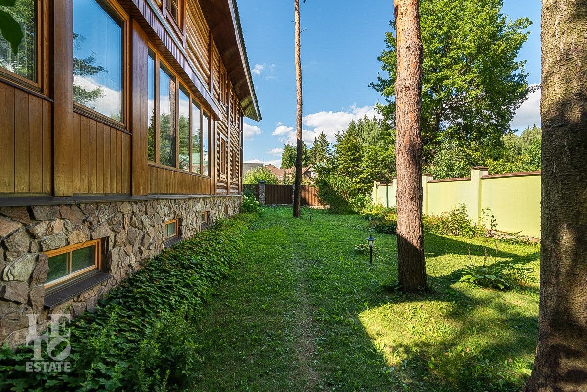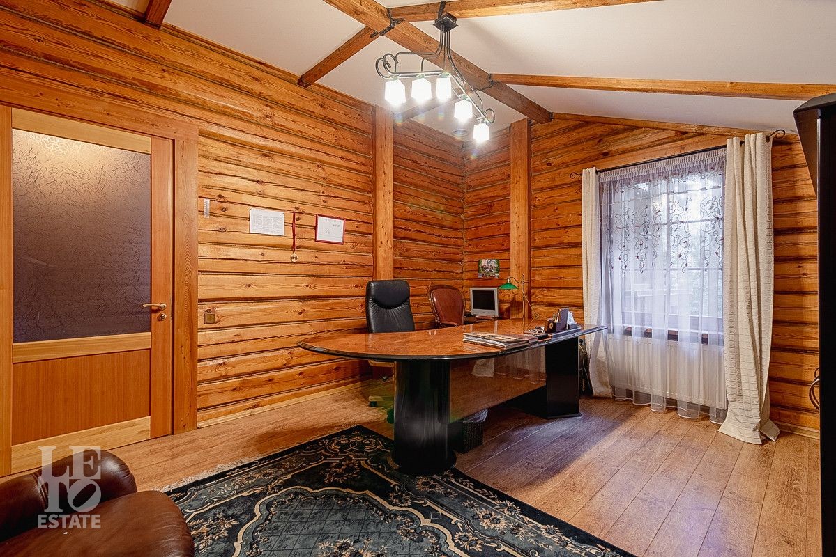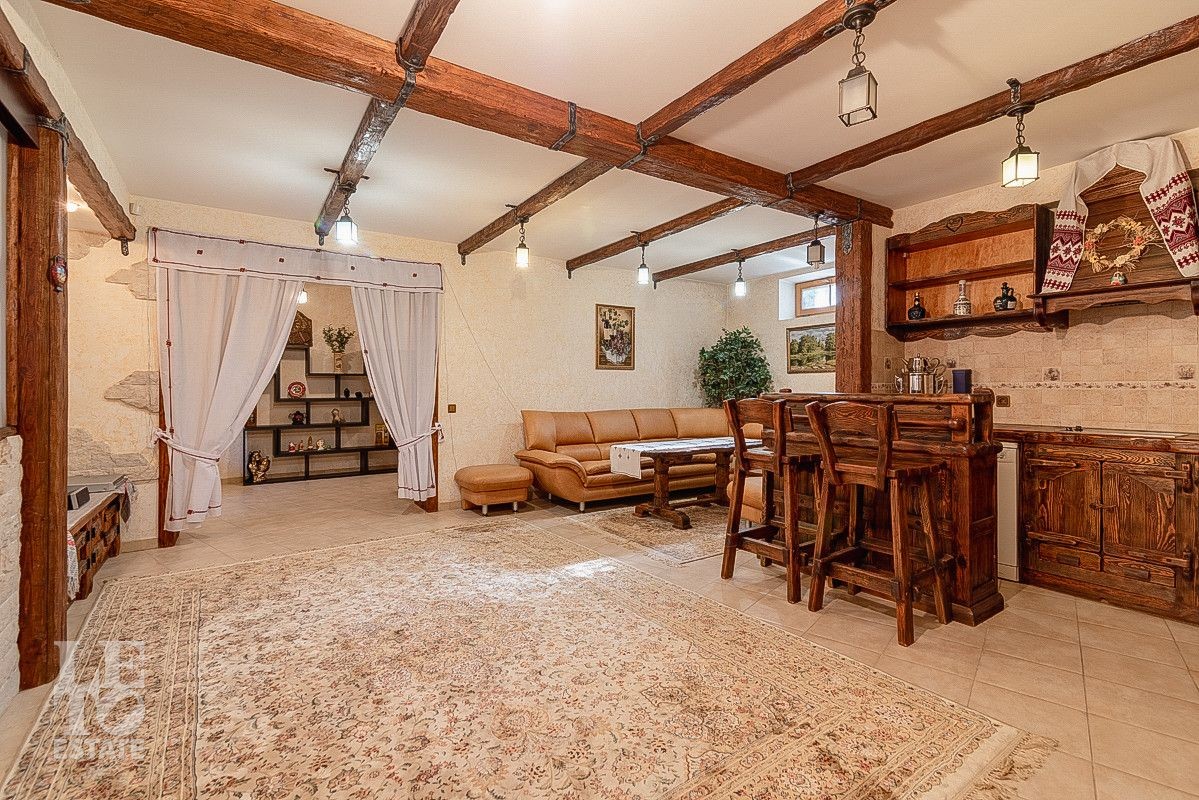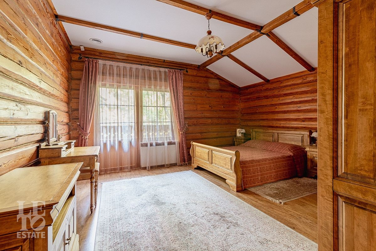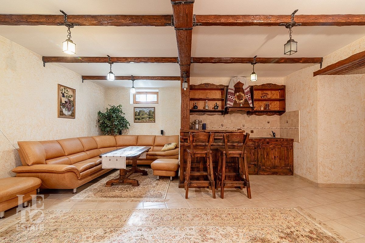 Дом построен из бревна: воплощение комфорта и уюта. Одним из основных достоинств дома является экологичность используемых материалов. Более того, в деревянном доме всегда создается уютная и теплая атмосфера, что благотворно влияет на здоровье и настроение. Брус обладает высокой плотностью и малой теплопроводностью, благодаря чему тепло внутри дома долго задерживается, а воздух не перегревается. Внутри дома используются только натуральные материалы, мебель выполнена на заказ. В доме разведены теплые полы, на цокольном этаже установлено кондиционирование. В доме во всех помещениях выполнена вытяжная вентиляция.