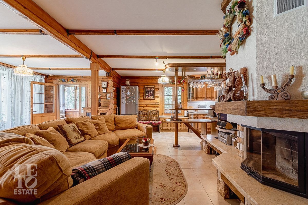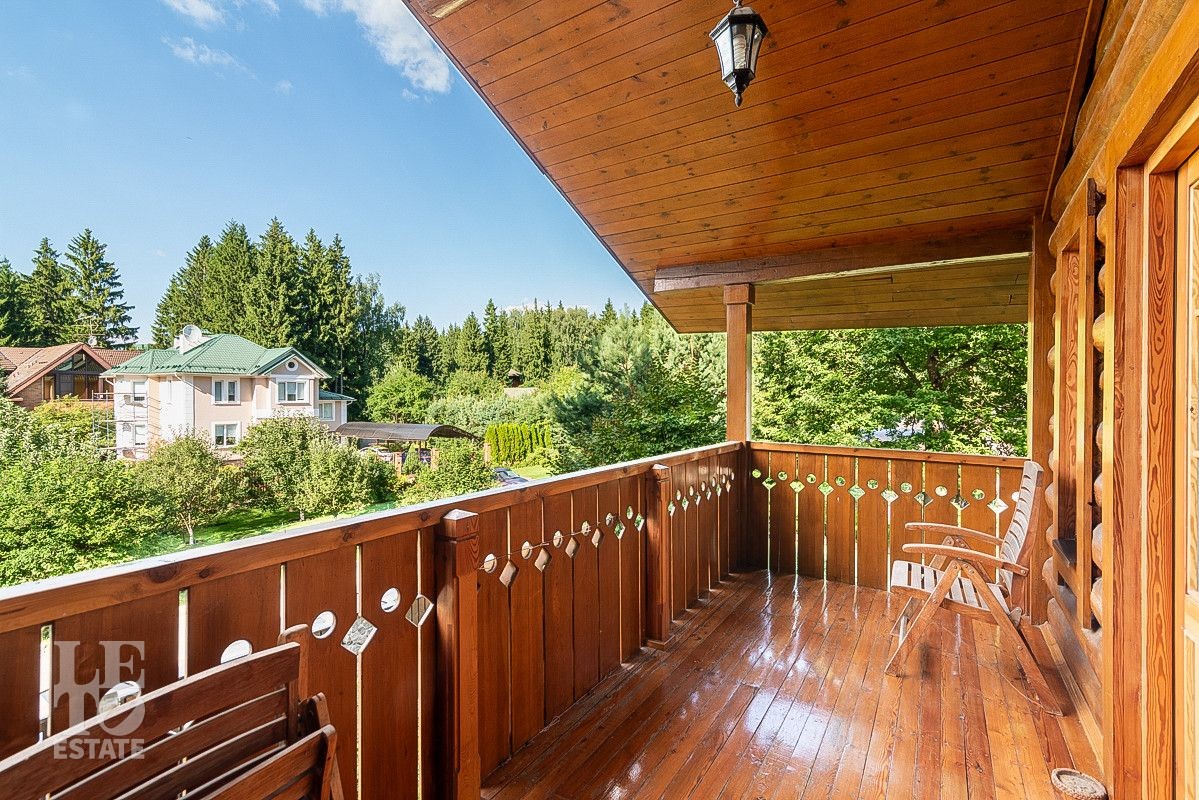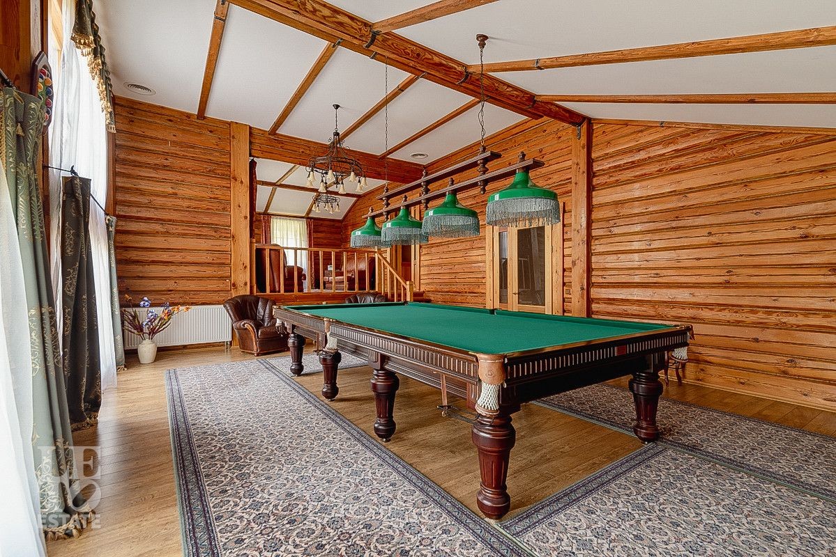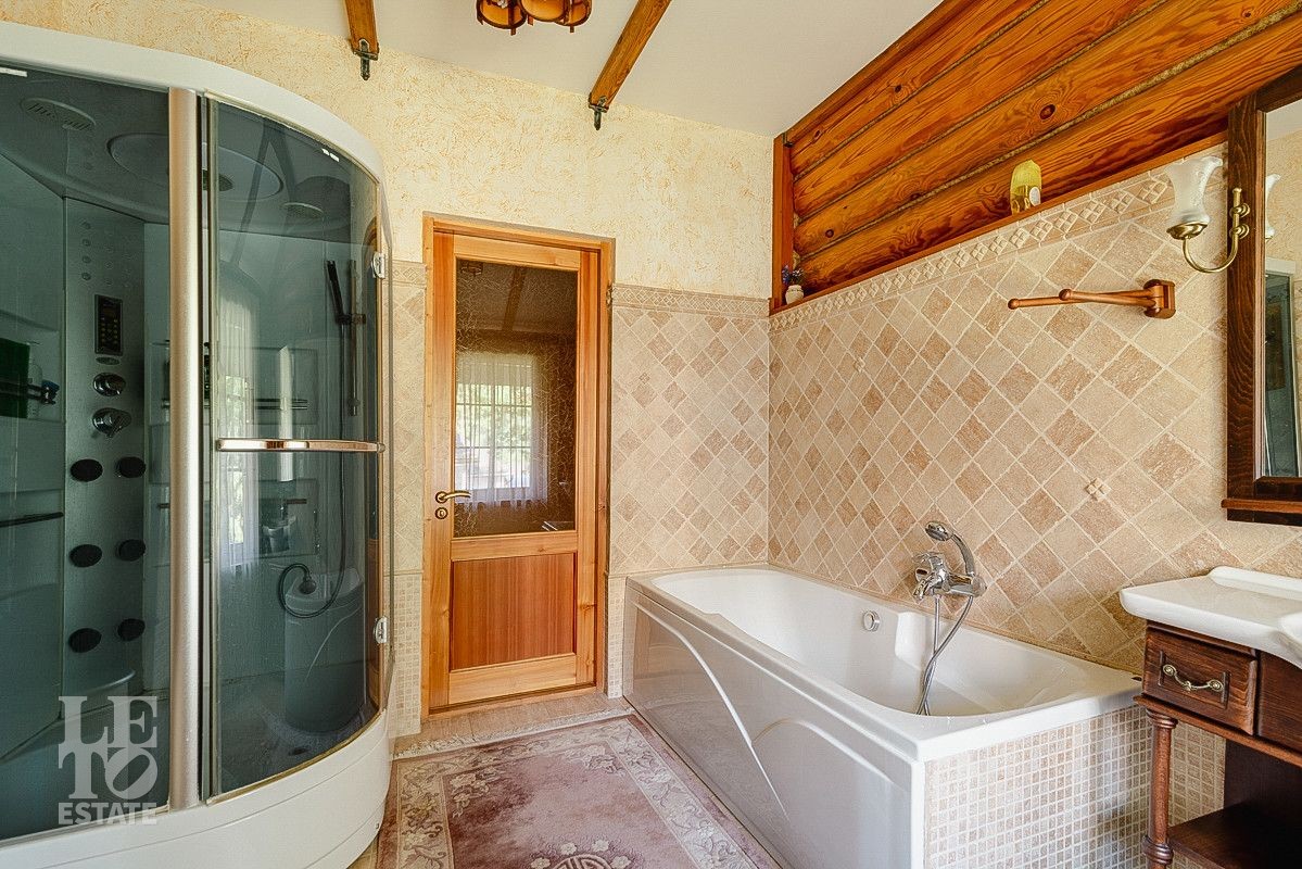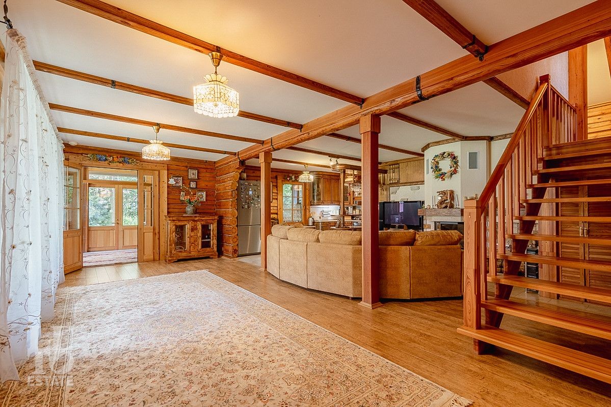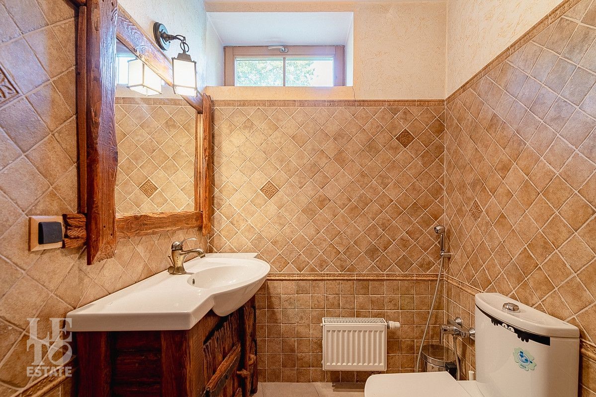Дом построен из бревна: воплощение комфорта и уюта. Одним из основных достоинств дома является экологичность используемых материалов. Более того, в деревянном доме всегда создается уютная и теплая атмосфера, что благотворно влияет на здоровье и настроение. Брус обладает высокой плотностью и малой теплопроводностью, благодаря чему тепло внутри дома долго задерживается, а воздух не перегревается. Внутри дома используются только натуральные материалы, мебель выполнена на заказ. В доме разведены теплые полы, на цокольном этаже установлено кондиционирование. В доме во всех помещениях выполнена вытяжная вентиляция.