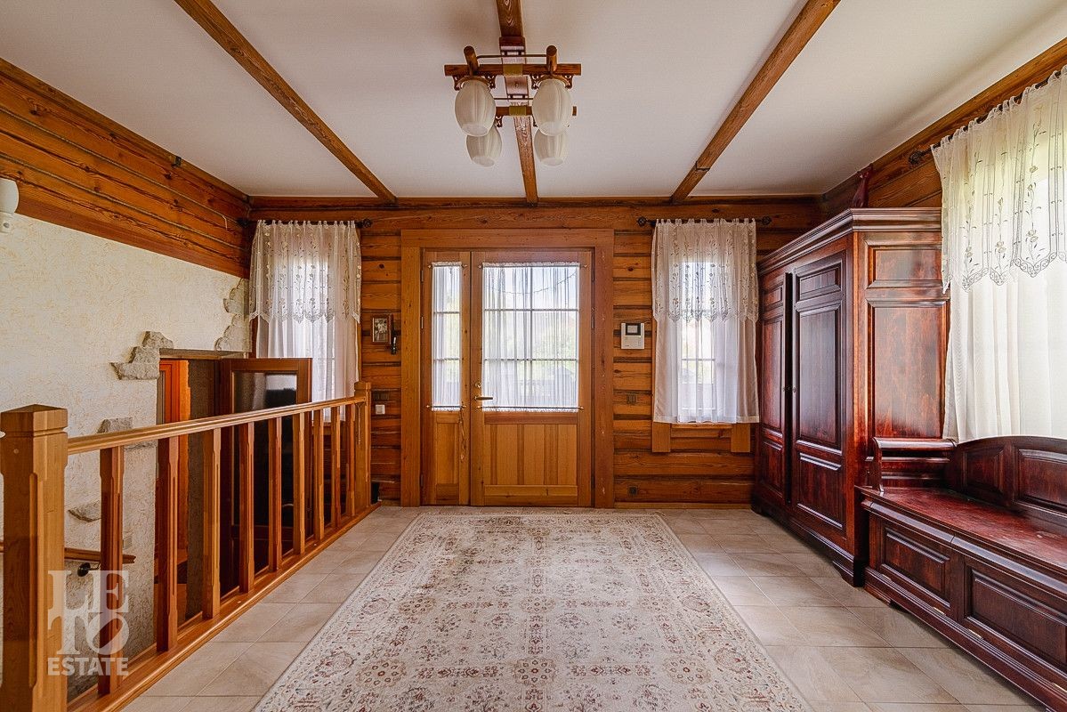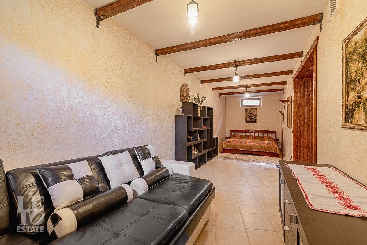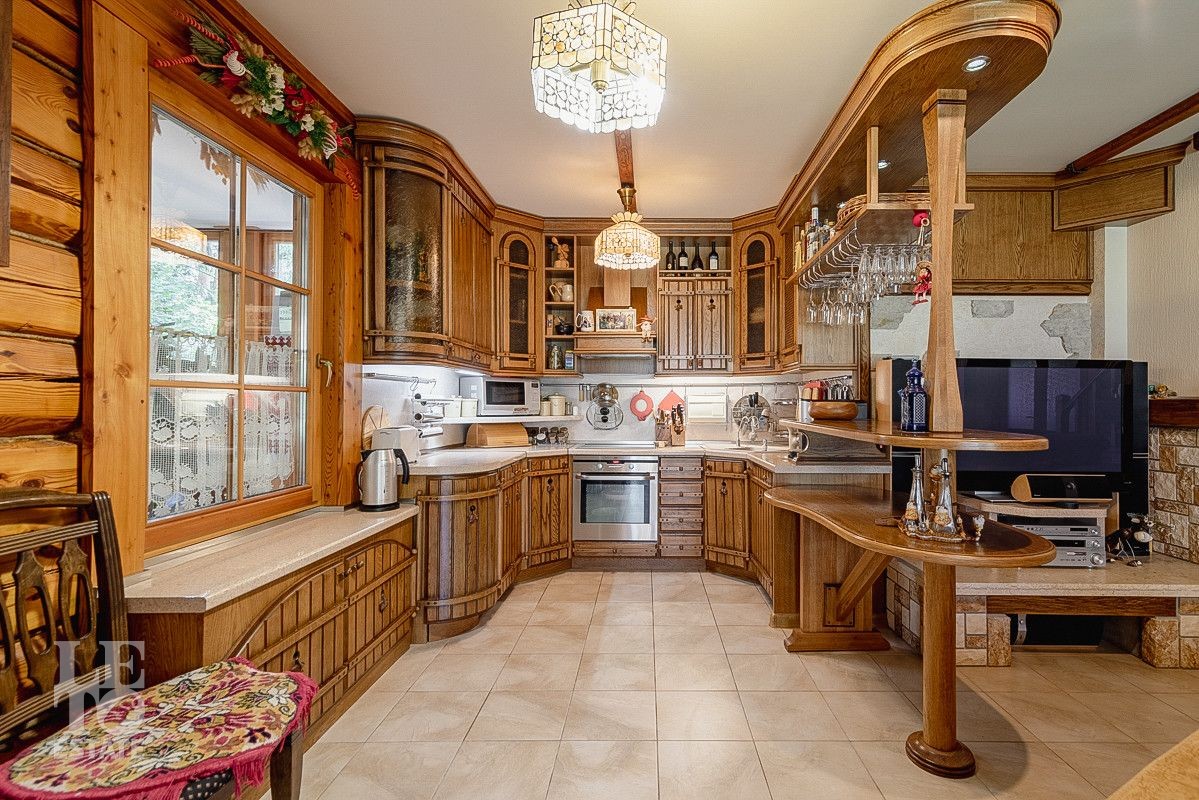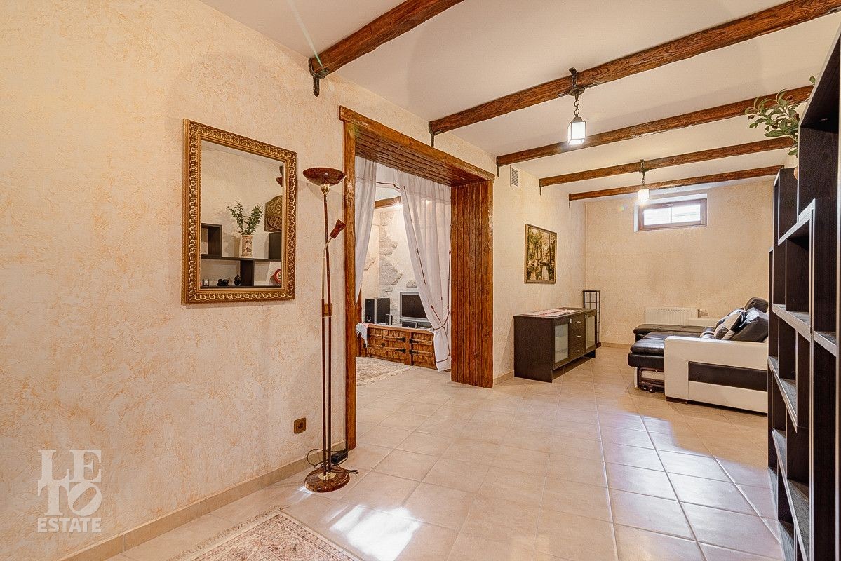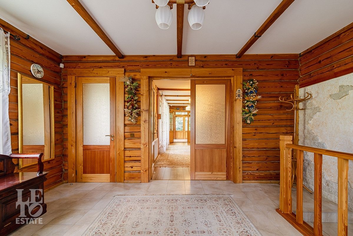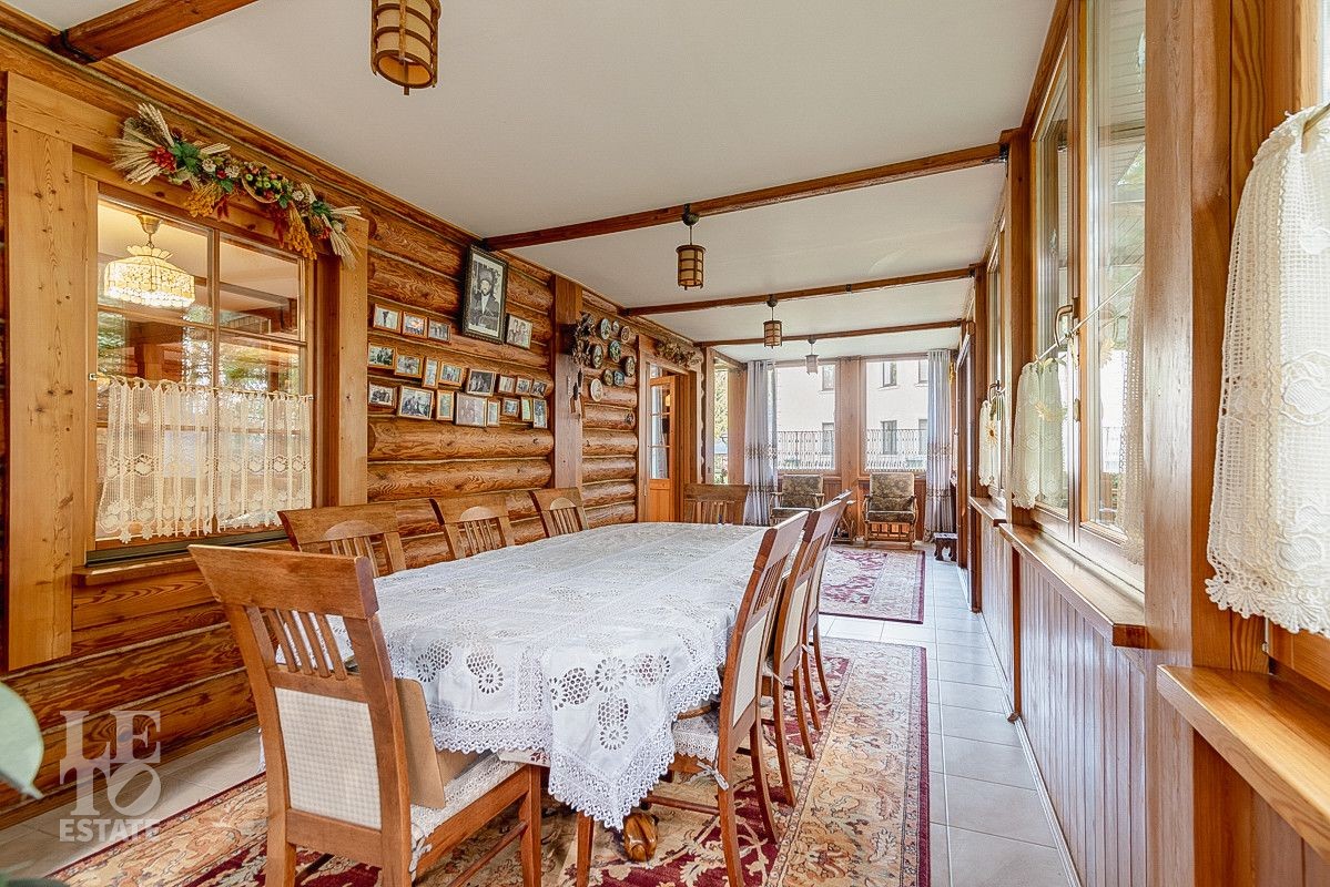 Дом построен из бревна: воплощение комфорта и уюта. Одним из основных достоинств дома является экологичность используемых материалов. Более того, в деревянном доме всегда создается уютная и теплая атмосфера, что благотворно влияет на здоровье и настроение. Брус обладает высокой плотностью и малой теплопроводностью, благодаря чему тепло внутри дома долго задерживается, а воздух не перегревается. Внутри дома используются только натуральные материалы, мебель выполнена на заказ. В доме разведены теплые полы, на цокольном этаже установлено кондиционирование. В доме во всех помещениях выполнена вытяжная вентиляция.