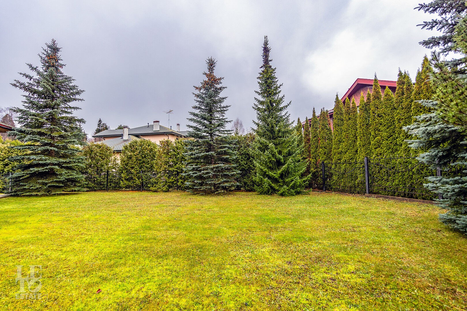 Участок с ровным газоном и ландшафтным дизайном создает завершенный образ: многолетние хвойные растения по периметру обеспечивают приватность, а беседка становится зоной отдыха в окружении природы.