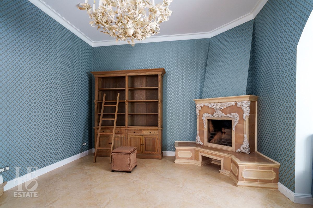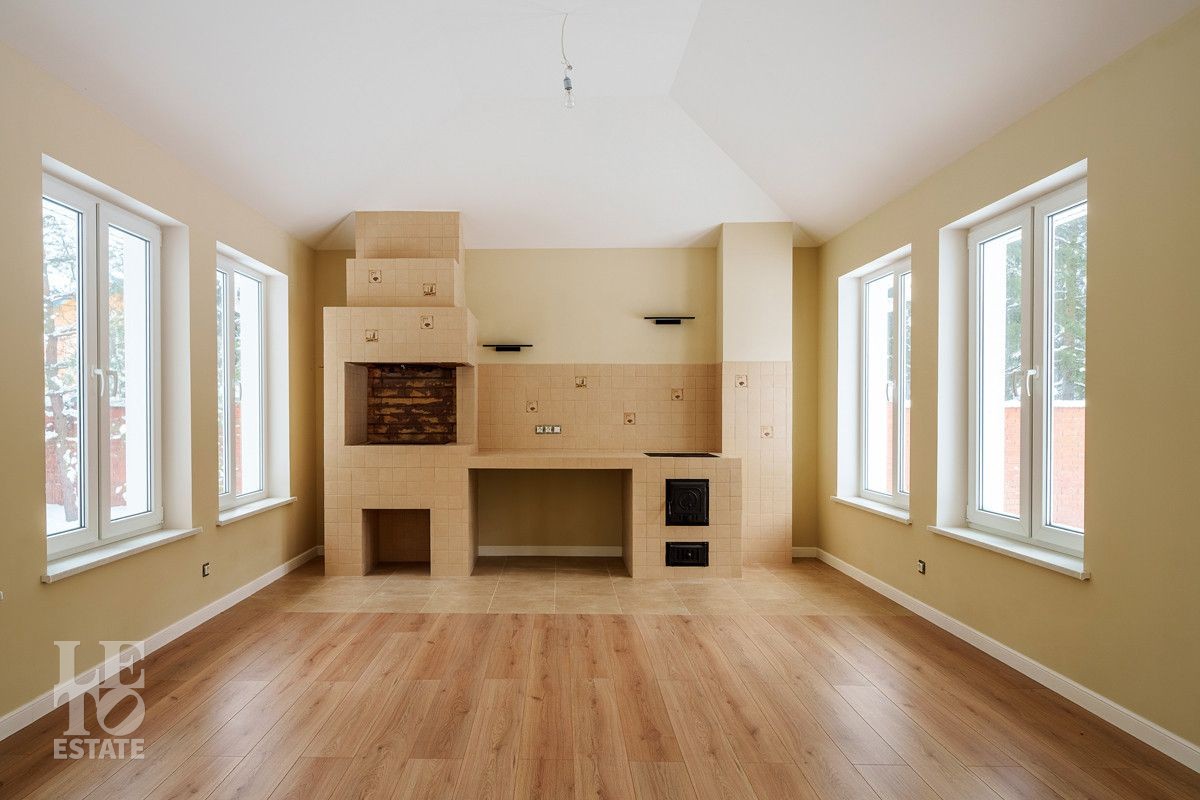 На первом этаже вы найдете кухню с выходом на крытую зону барбекю и просторную столовую. Встраиваемая техника фирмы BOSCH. Вытяжка NEFF. В гостиной имеется камин ручной работы, выполненный на заказ из керамики. А также удобная комната с двумя выходами в прихожую или в зону кухни-столовой.