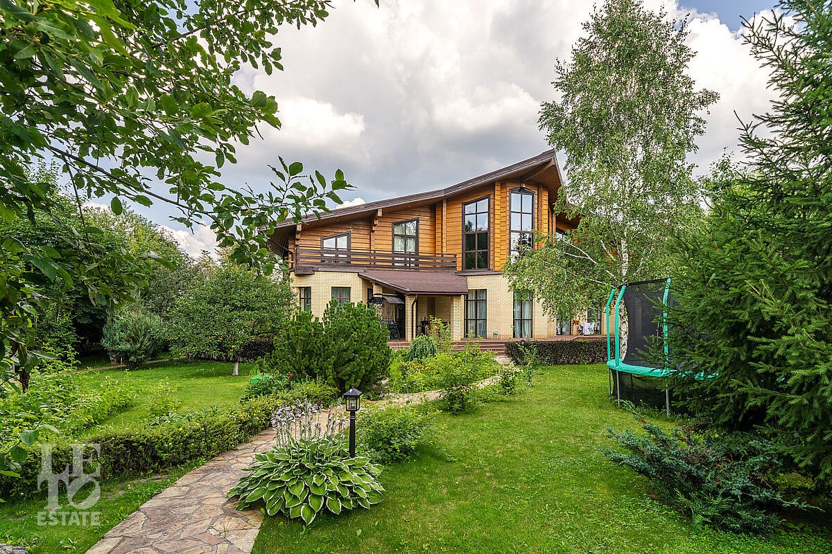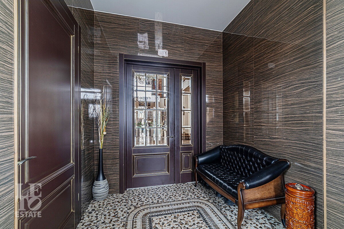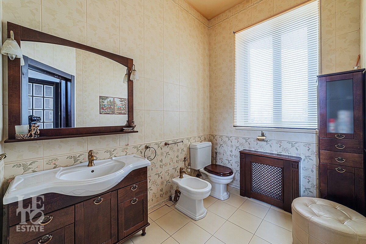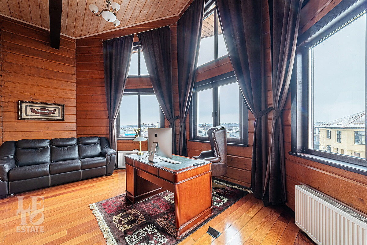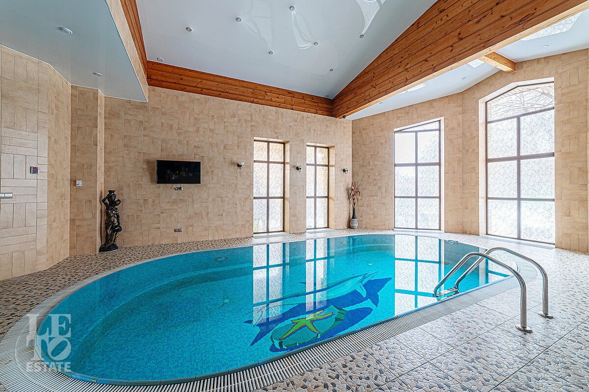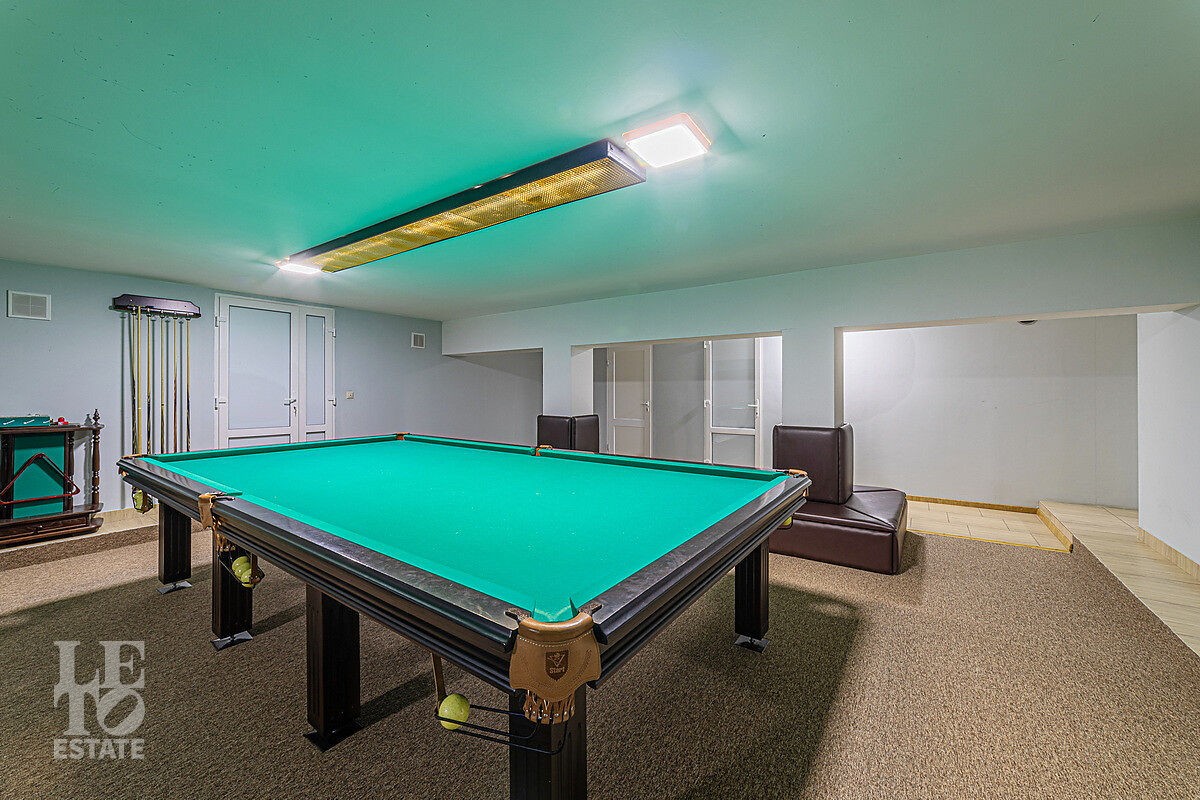 В доме отдельный вход на кухню с улицы, гостиная с камином авторского дизайна, обеденная зона, бассейн с витражным остеклением, финская сауна. В цоколе резиденции расположена зона отдыха с домашним кинотеатром и бильярдной, спортивный зал, постирочная. На втором этаже расположена мастер-спальня, кабинет и детский блок, в котором 3 детские комнаты и санузел.