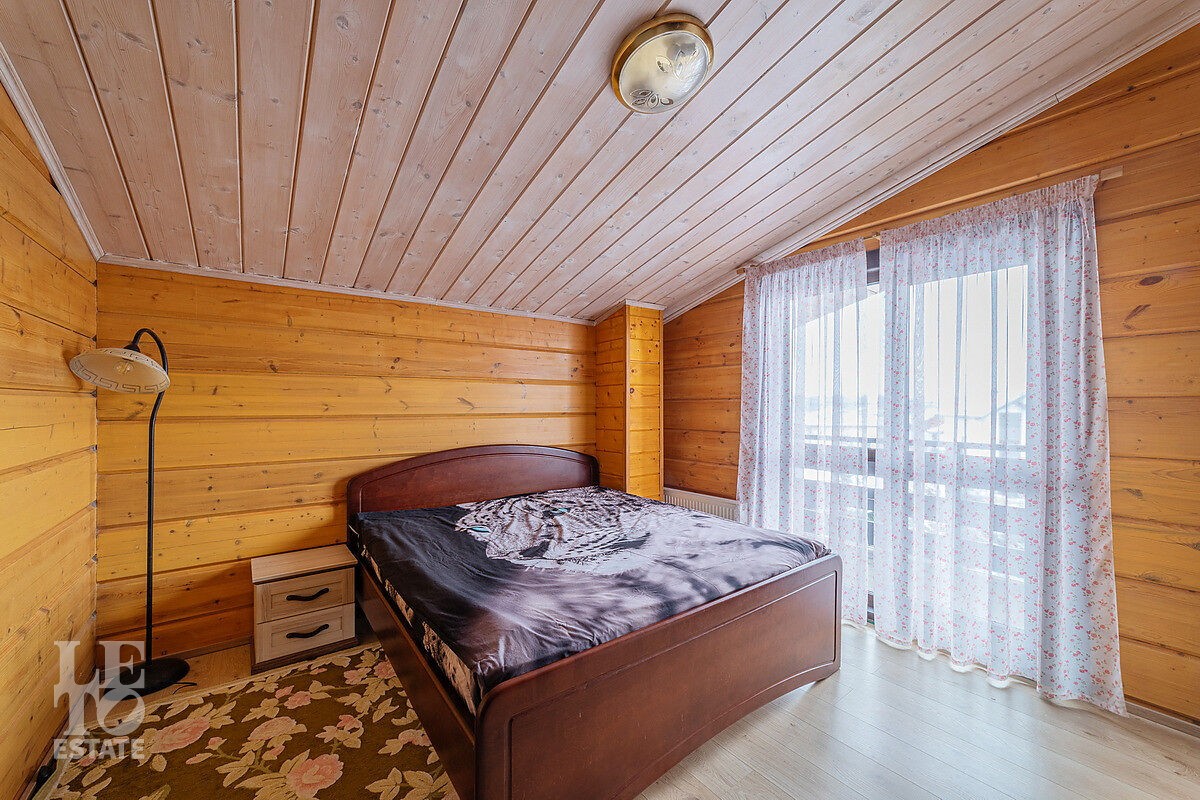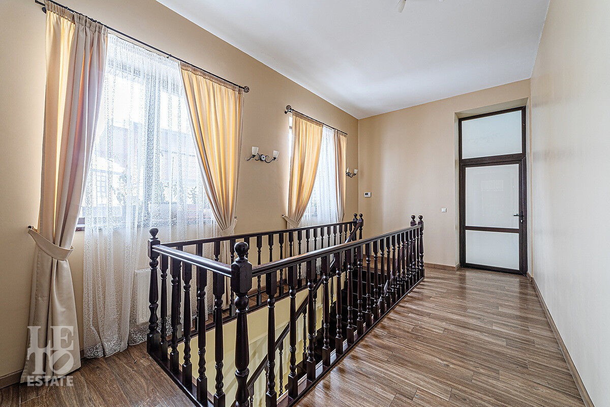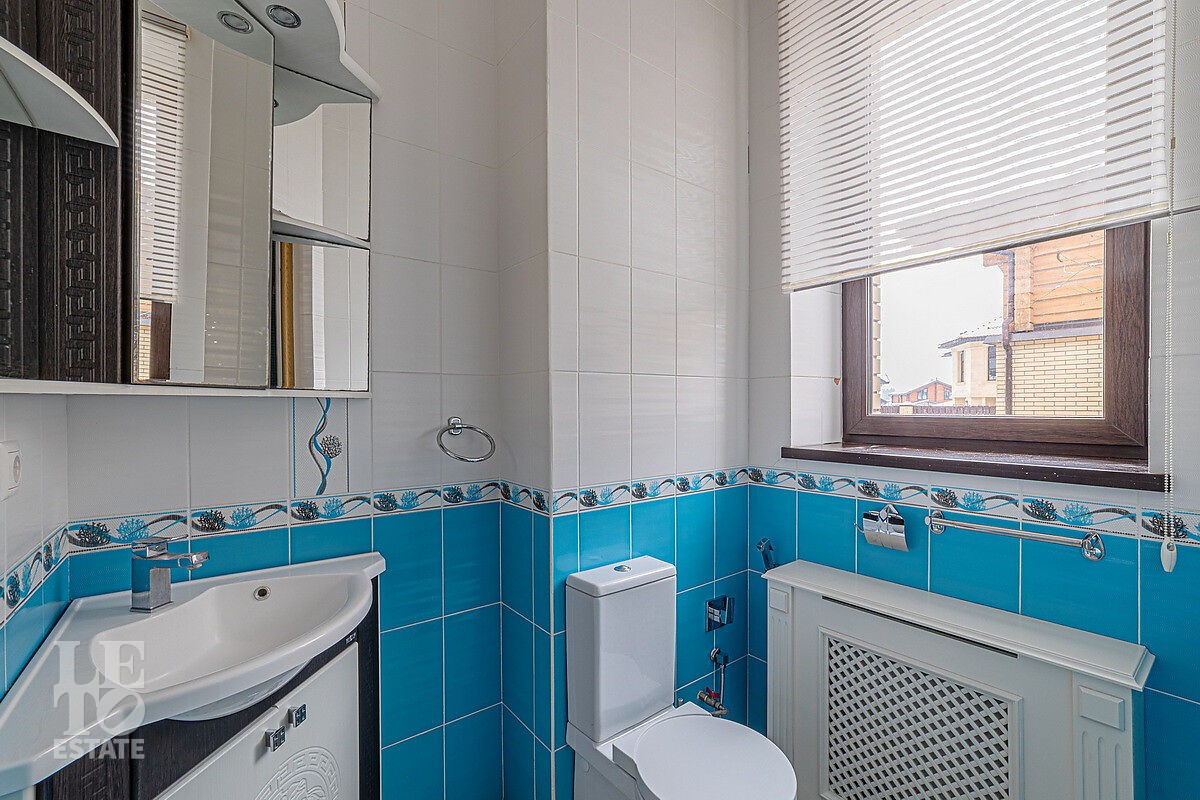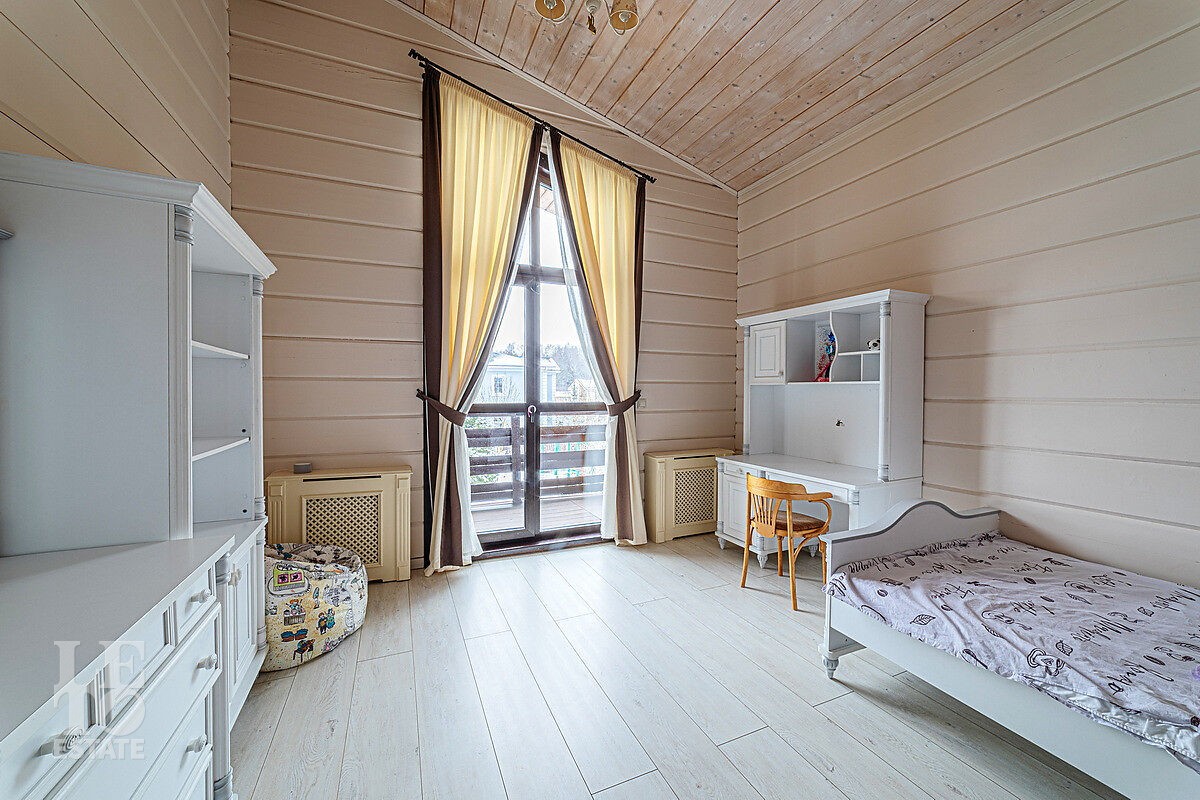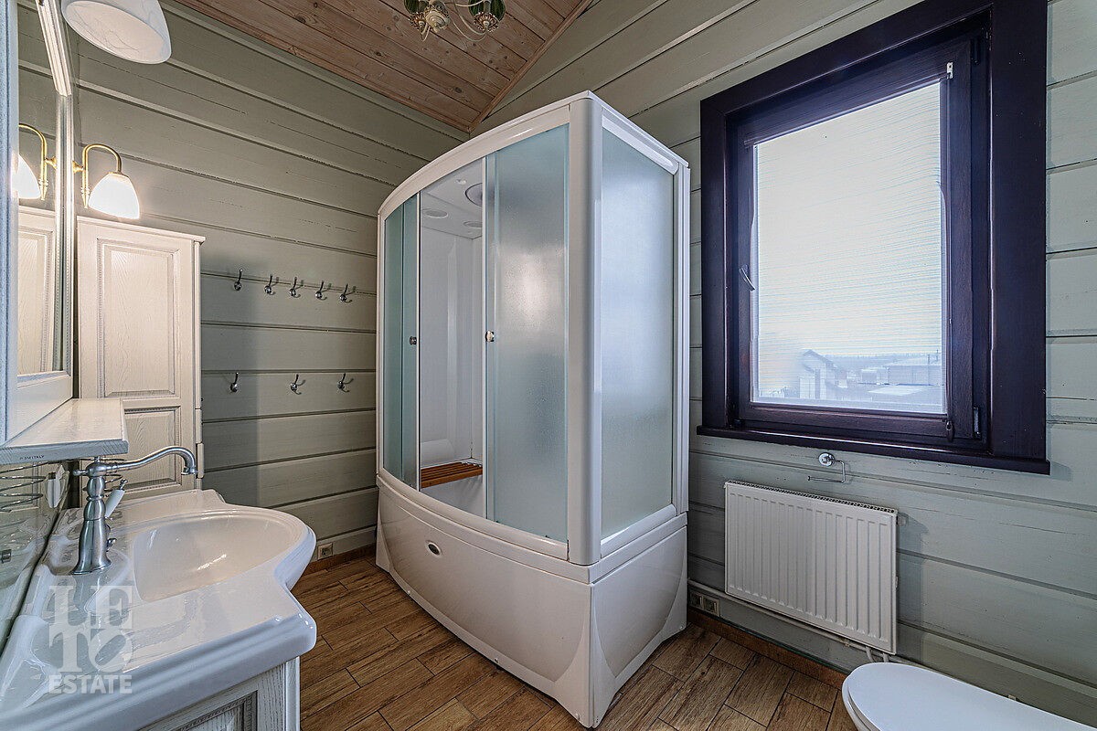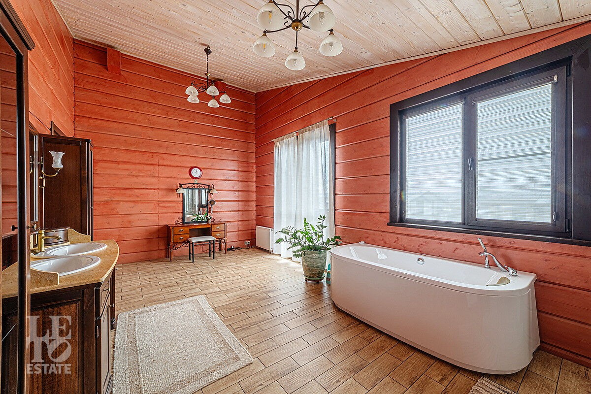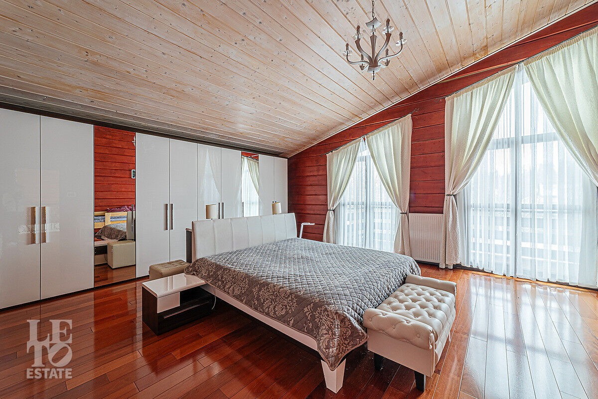 В доме отдельный вход на кухню с улицы, гостиная с камином авторского дизайна, обеденная зона, бассейн с витражным остеклением, финская сауна. В цоколе резиденции расположена зона отдыха с домашним кинотеатром и бильярдной, спортивный зал, постирочная. На втором этаже расположена мастер-спальня, кабинет и детский блок, в котором 3 детские комнаты и санузел.