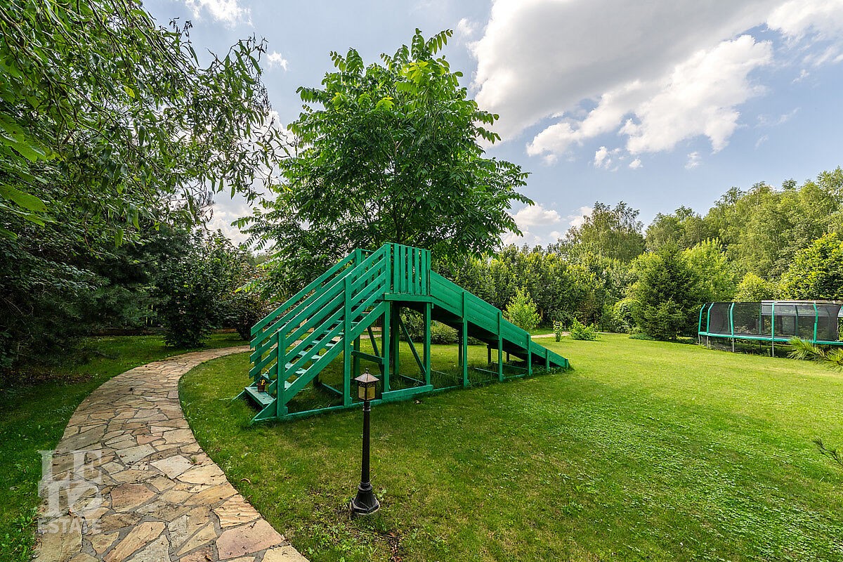 Участок правильной формы, общей площадью 32 сотки. На участке выполнены ландшафтное озеленение и благоустройство, организован автополив, сделано уличное освещение. Для детей построена горка. Все коммуникации центральные: газ, водоснабжение, электричество (20 кWa), канализация. Установлен газовый генератор и система бесперебойного питания. На улице установлен дополнительный шлагбаум на несколько домовладений.