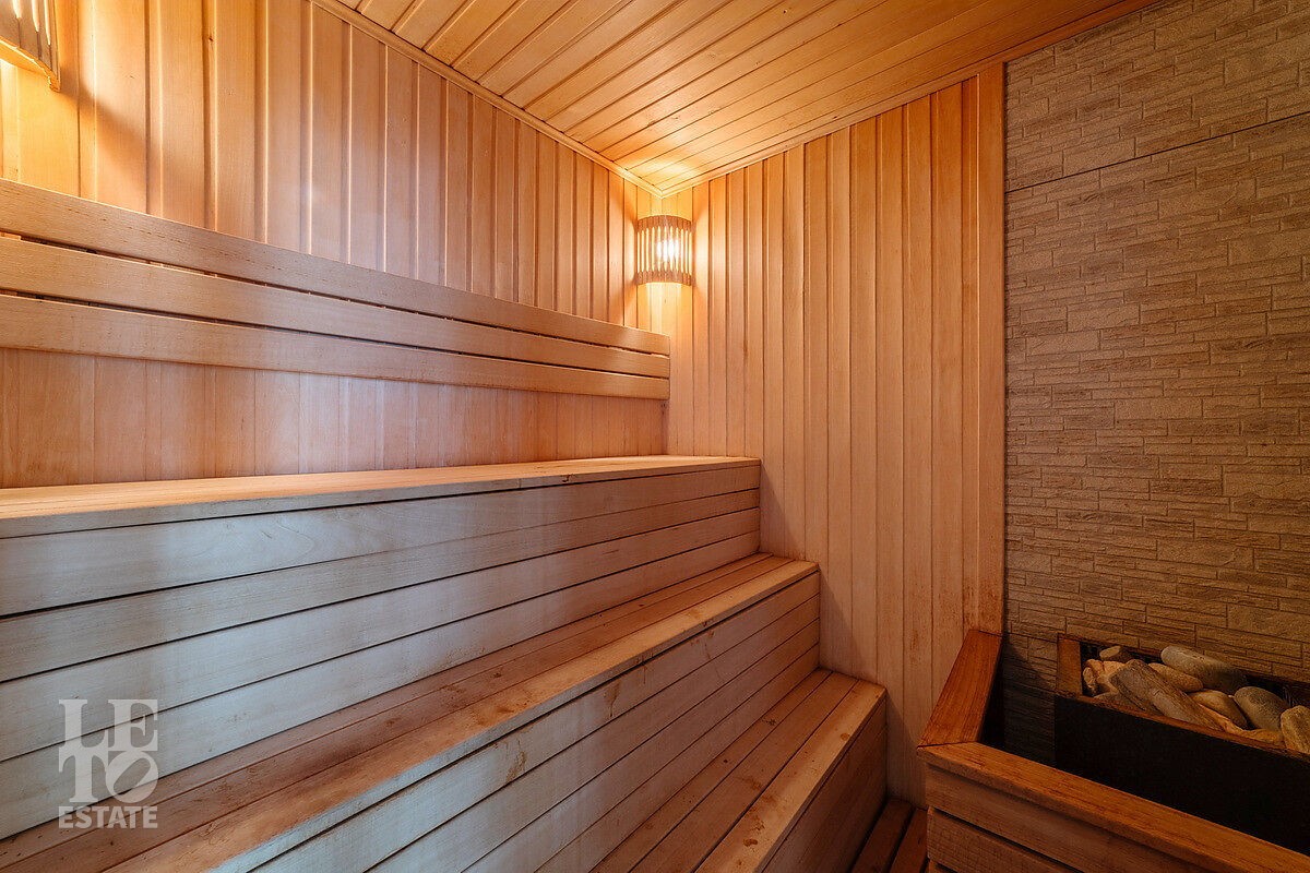 Дом выполнен в стиле шале. В нем сбалансированы функциональность, практичность и комфорт. Во внутренней отделке преобладает дерево и кованые элементы. На каждом этаже есть система доставки в постирочную комнату. Отдельным блоком вынесена спа-зона с бассейном, сауной и зона отдыха. Из этого блока есть выход на улицу.