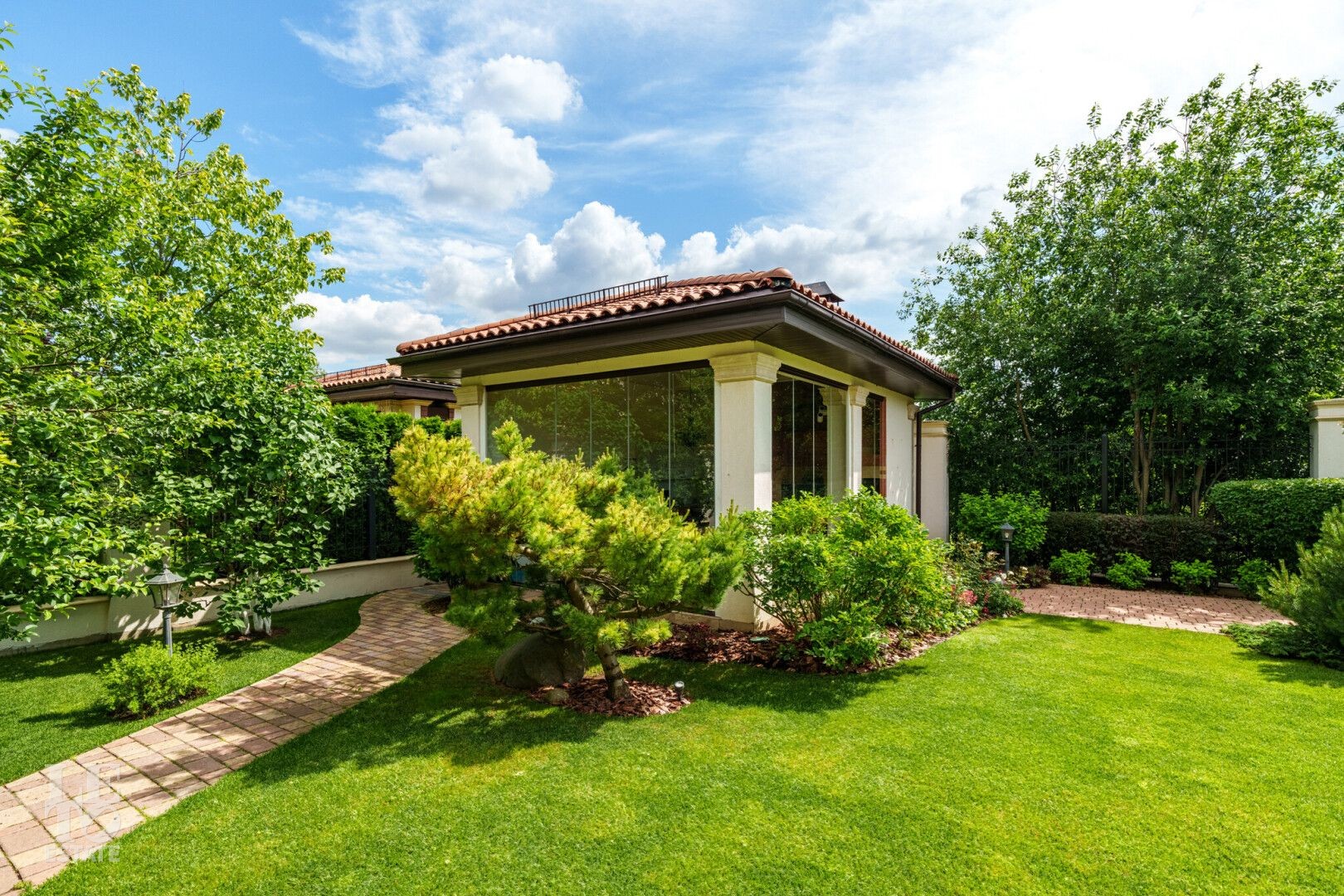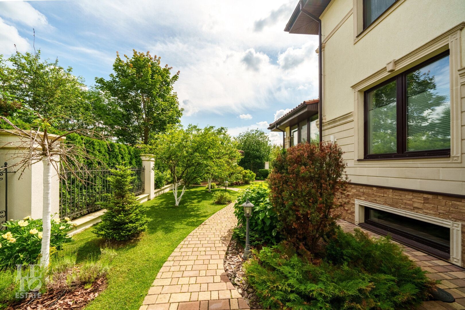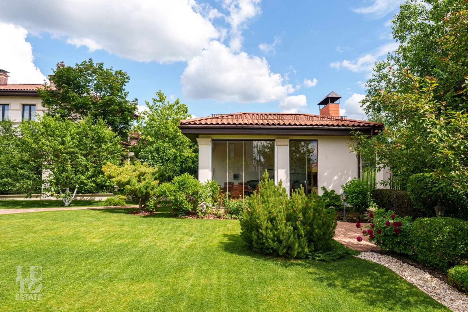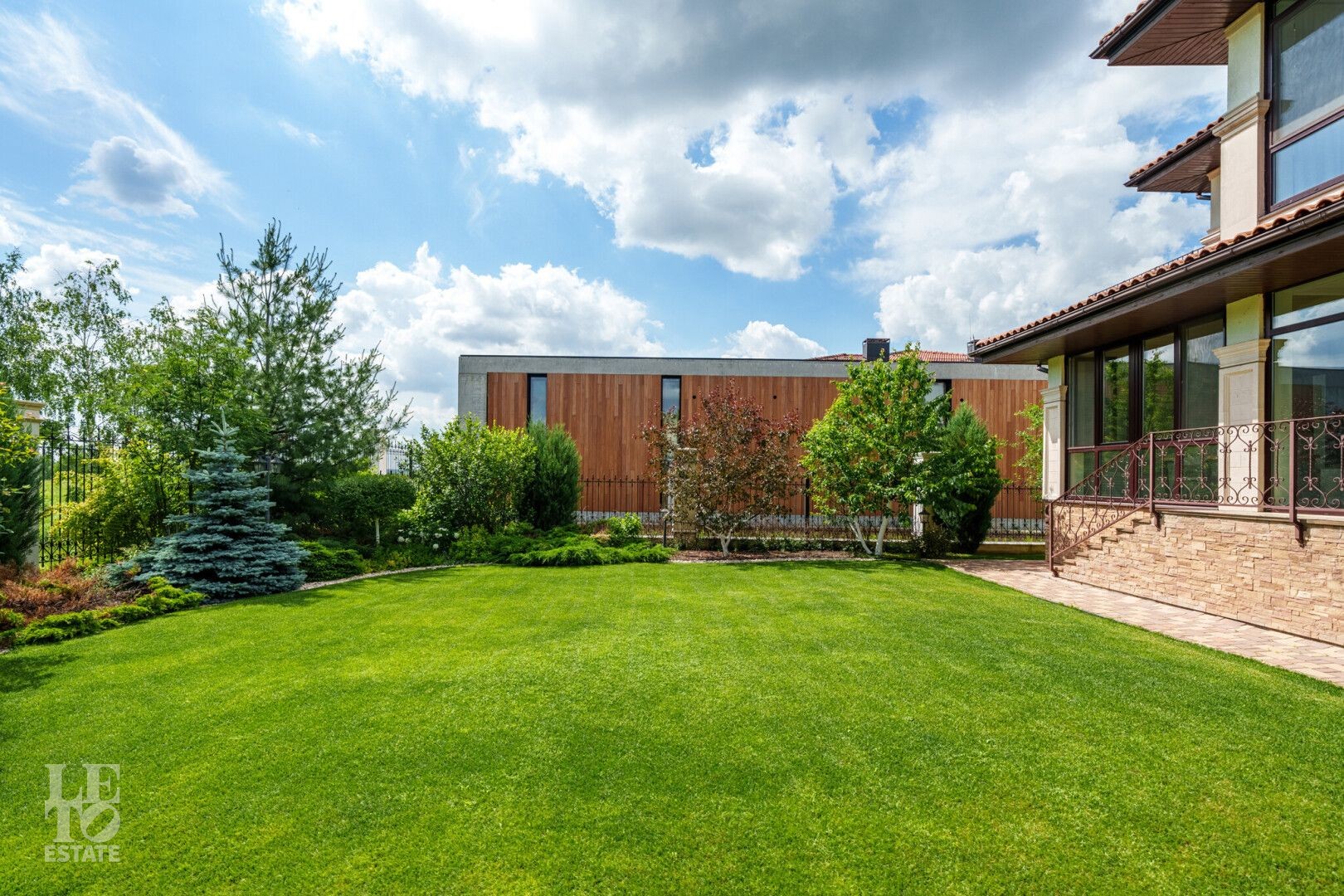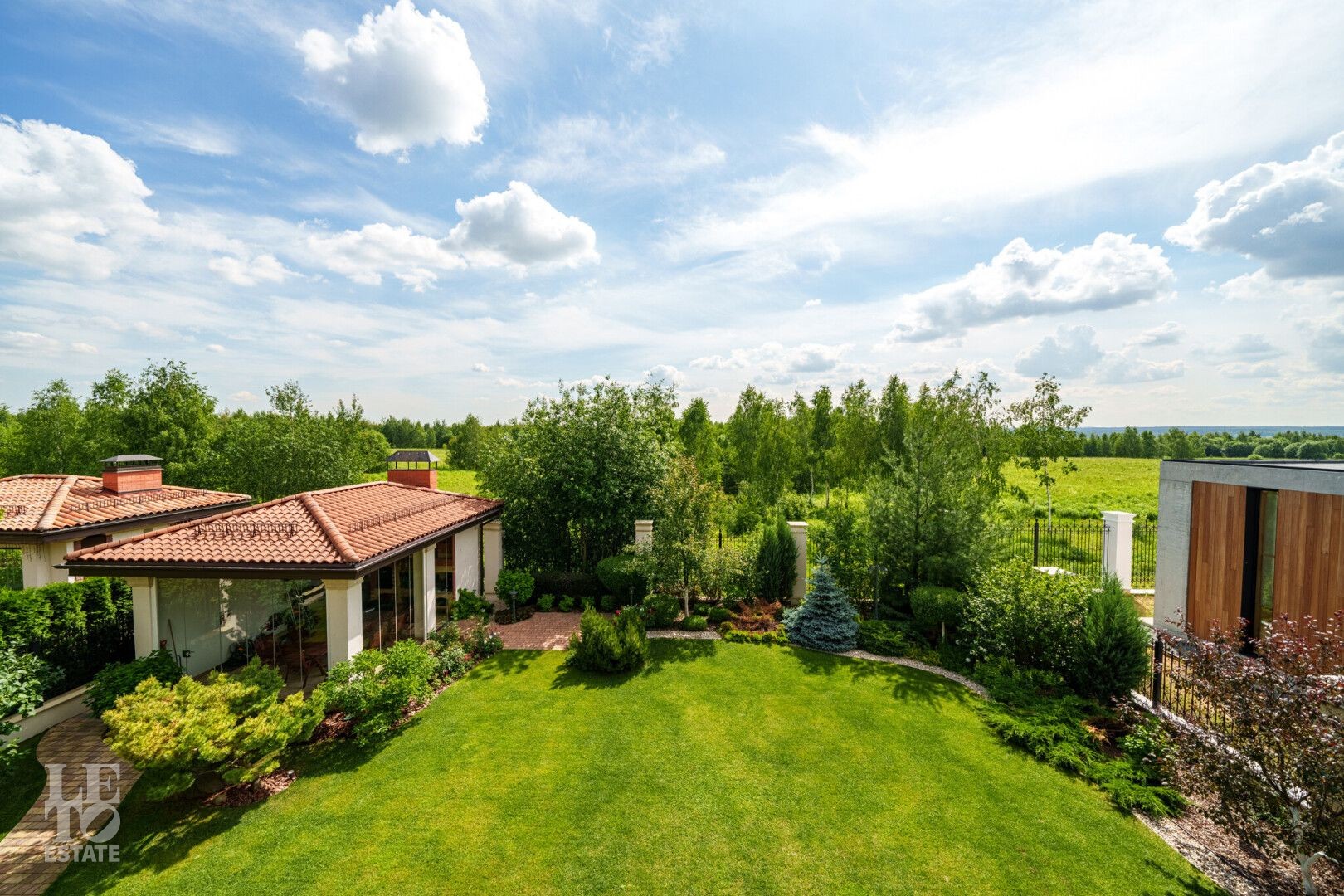 Участок правильной прямоугольной формы с ландшафтным дизайном и плодовыми деревьями. Помимо основного дома на участке расположен навес 2 машиныи летняя закрытая терраса с печью и мангалом для барбекю.