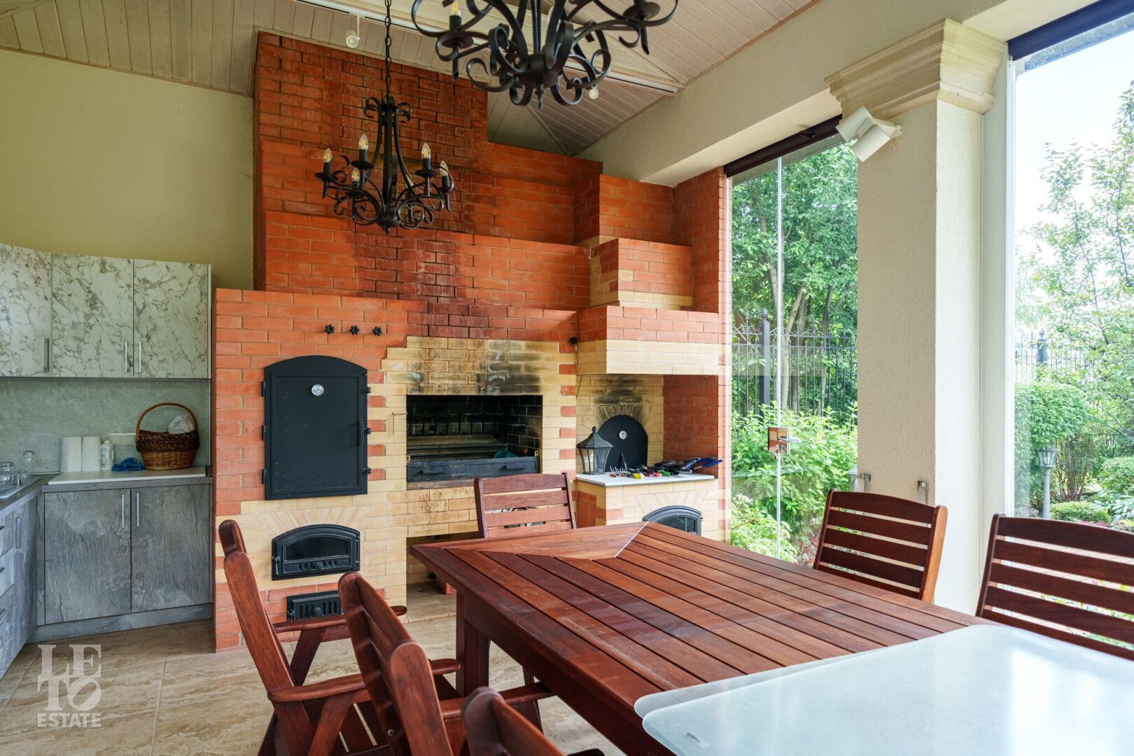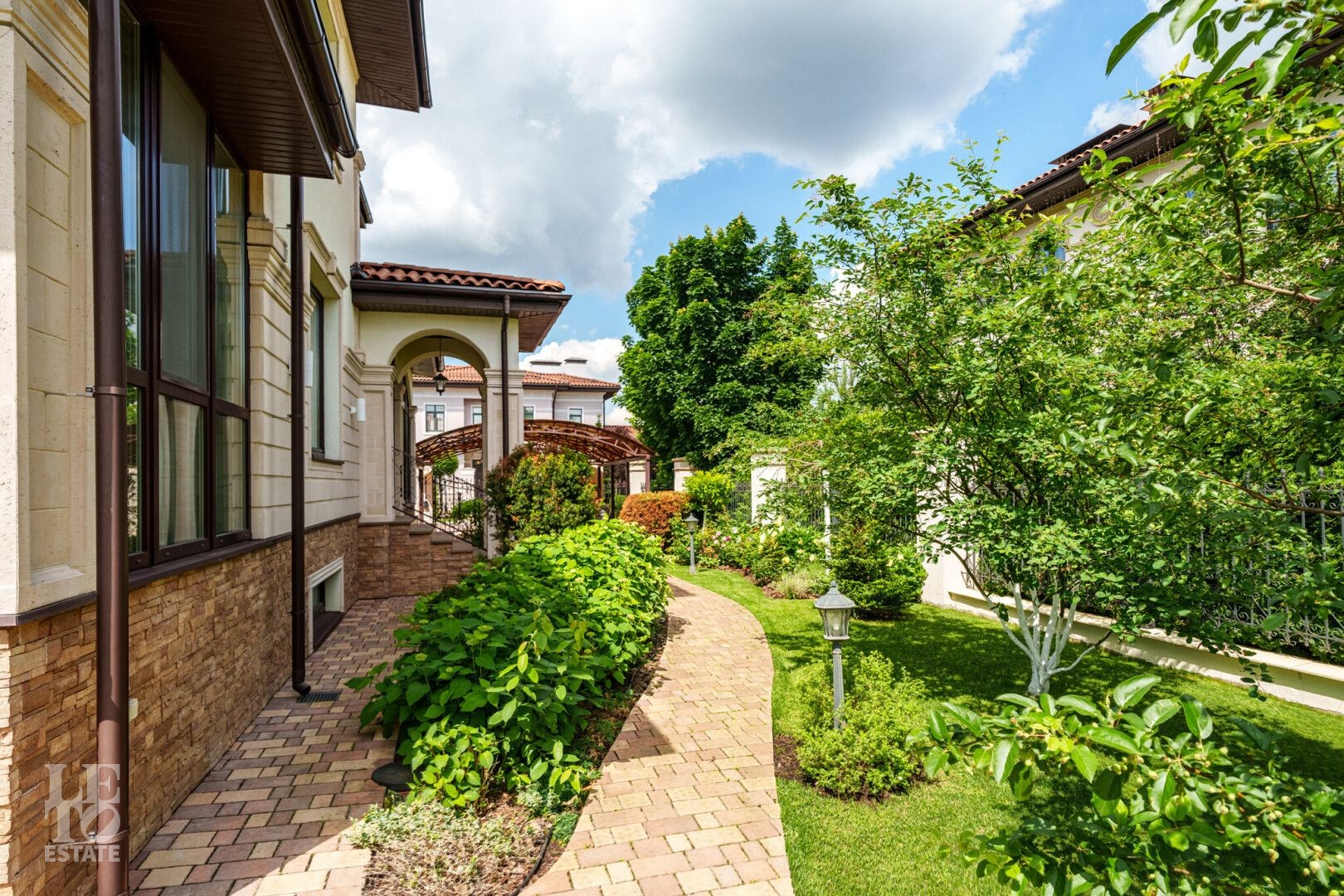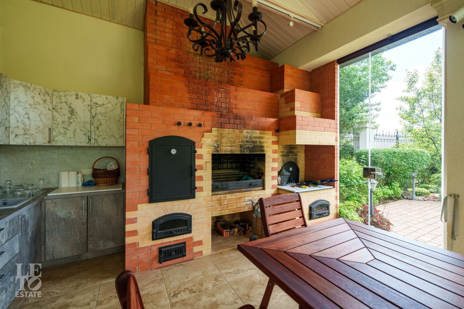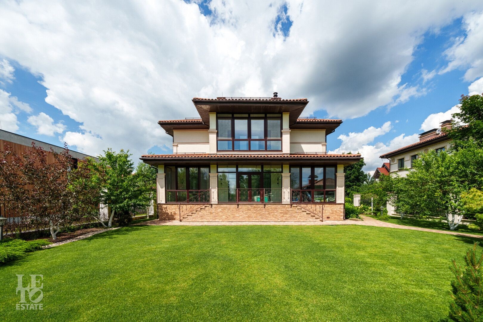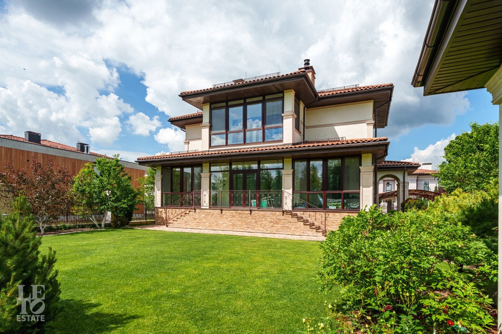 Участок правильной прямоугольной формы с ландшафтным дизайном и плодовыми деревьями. Помимо основного дома на участке расположен навес 2 машиныи летняя закрытая терраса с печью и мангалом для барбекю.