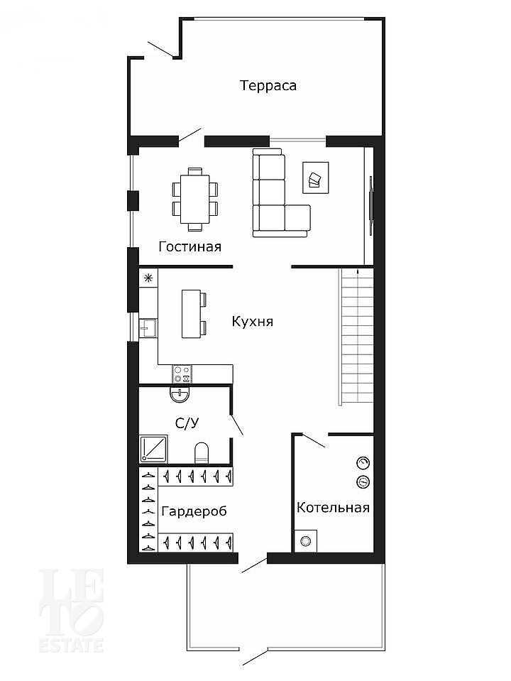 Первый этаж: гардероб, котельная, санузел, кухня, гостиная с выходом на террасу.