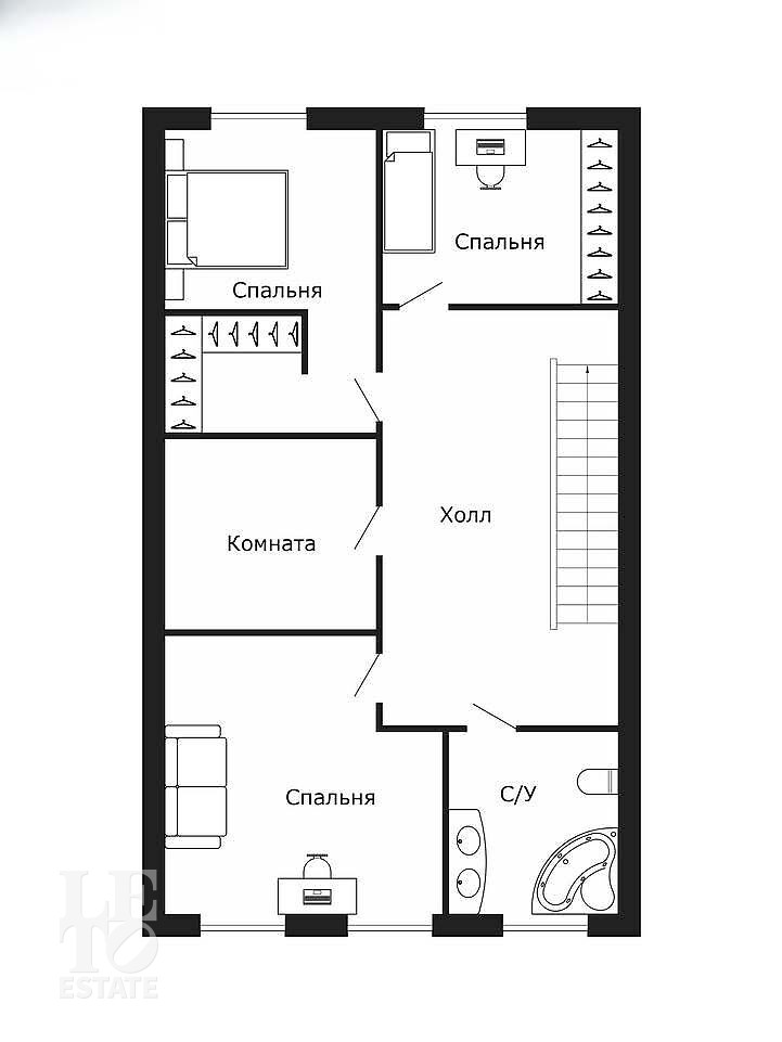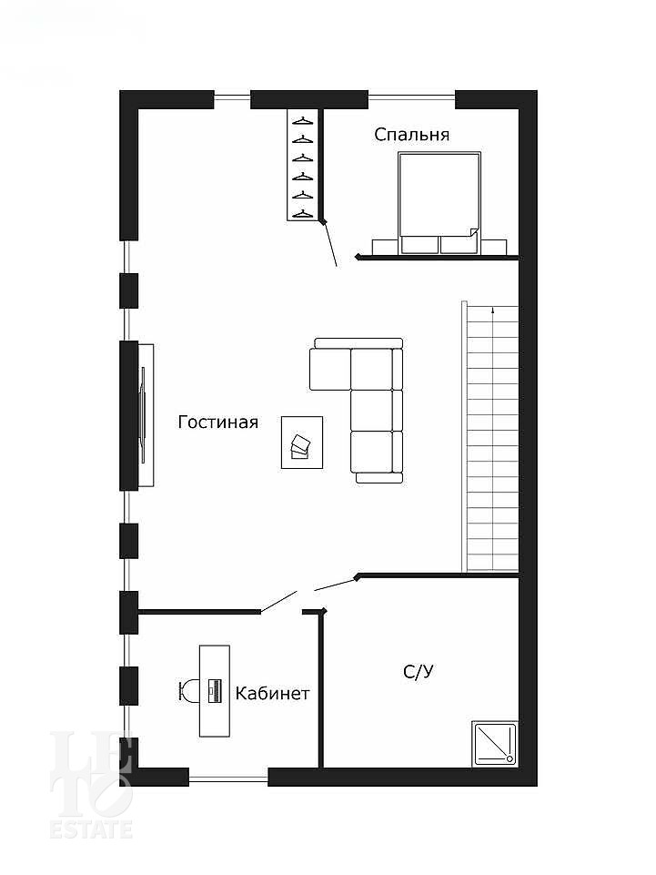 Третий этаж: гостиная, спальня, кабинет, санузел.