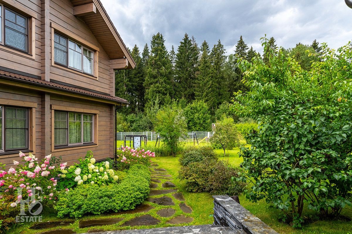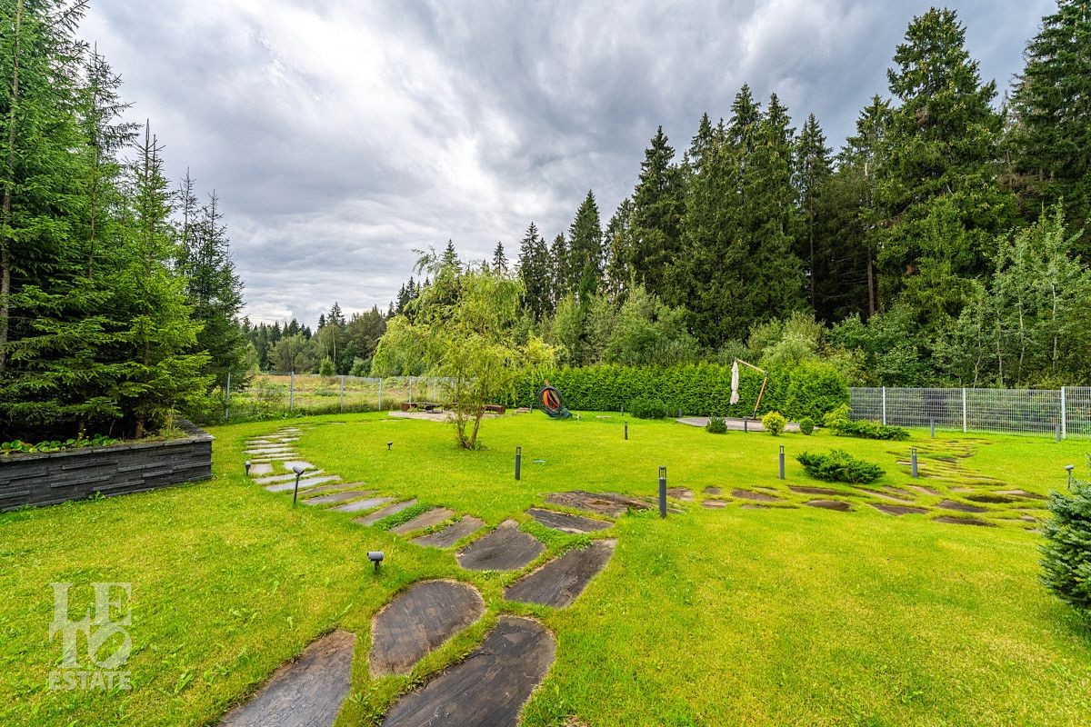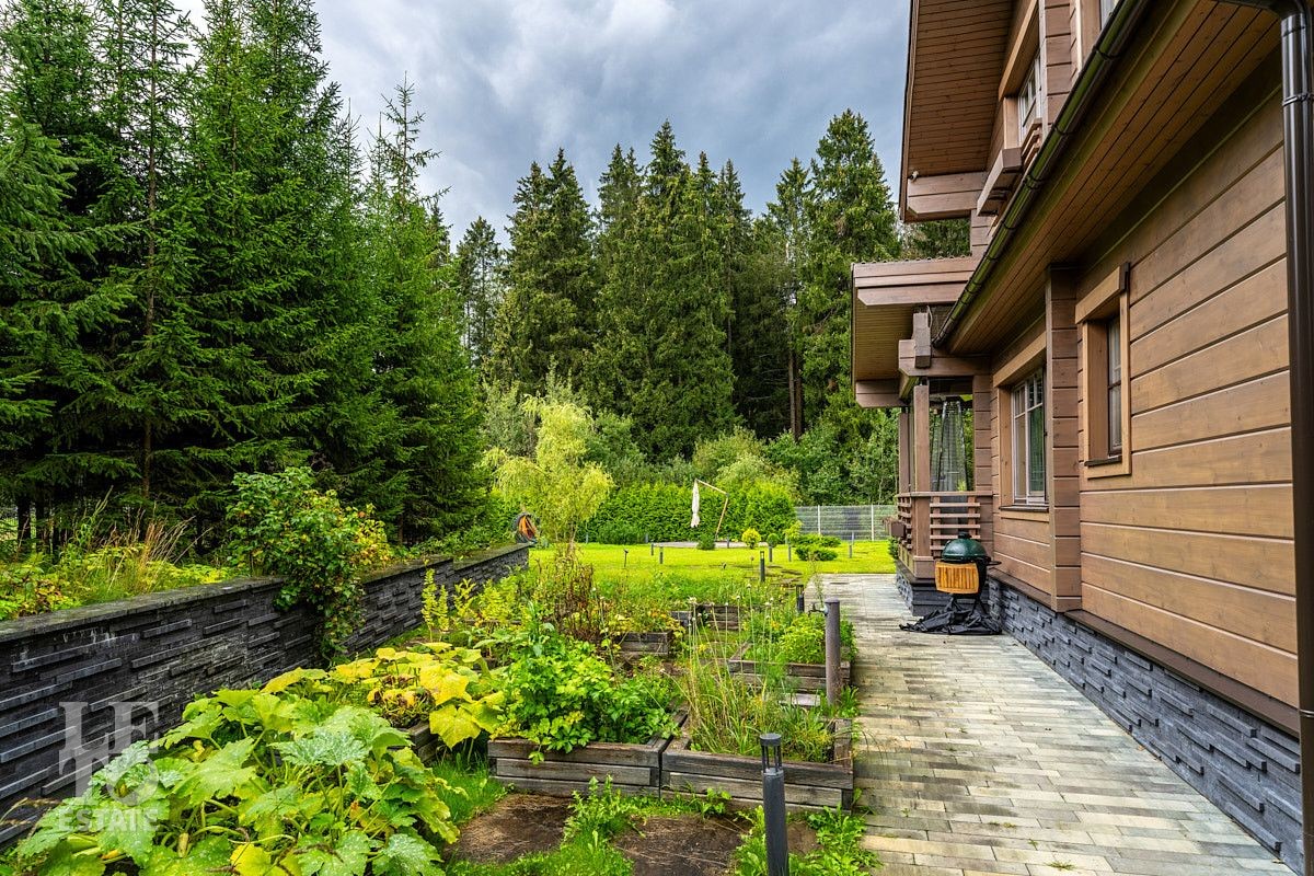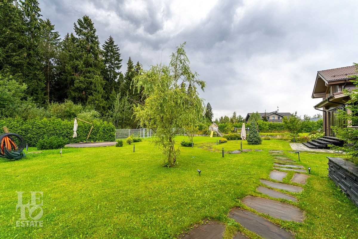 На приусадебном участке выполнены ландшафтные работы: высажены декоративные деревья и кустарники, организован сад, небольшой огород и ягодник. Природное очарование загородного участка достигнуто благодаря уникальному дизайну и новаторскому подходу. Продуманная инженерная концепция позволила создать безбарьерную среду, где строения для отдыха гармонично интегрированы в природное окружение. Безупречное состояние территории поддерживается системой дренажа — высокоэффективной технологией отвода воды и поддержания водного баланса. Дорожки выложены природным камнем, разведена система автоматического полива, организовано вечернее освещение. Помимо основного дома на участке расположен навес на два автомобиля, а также дополнительные помещения в виде кладовой и котельной.