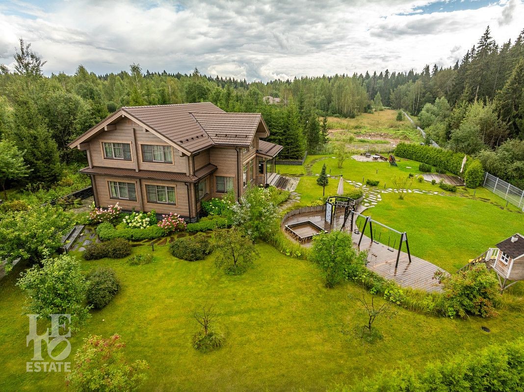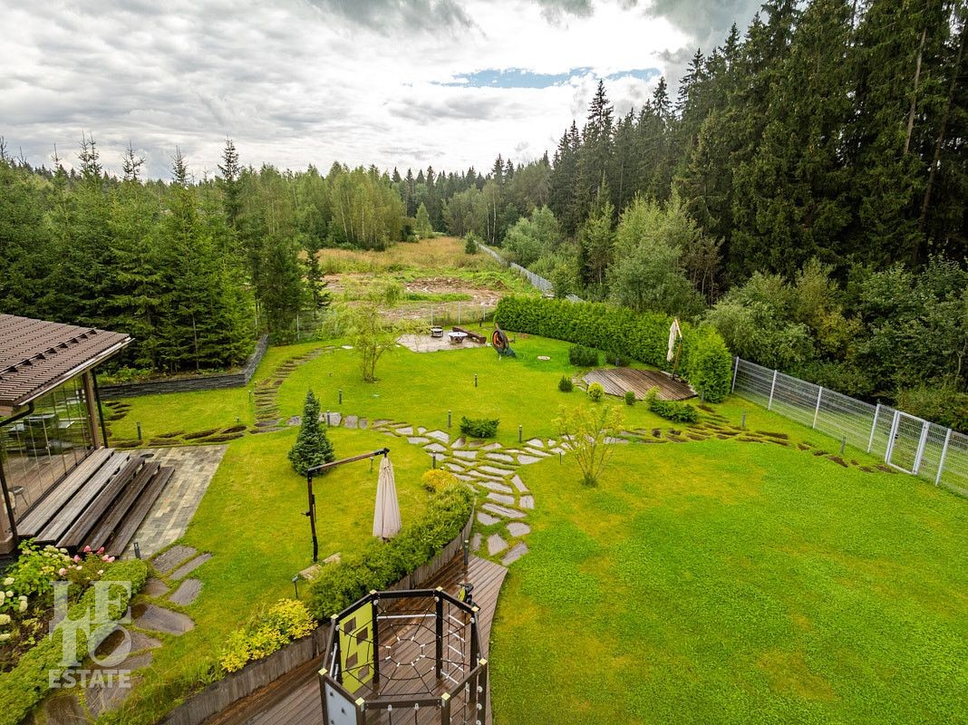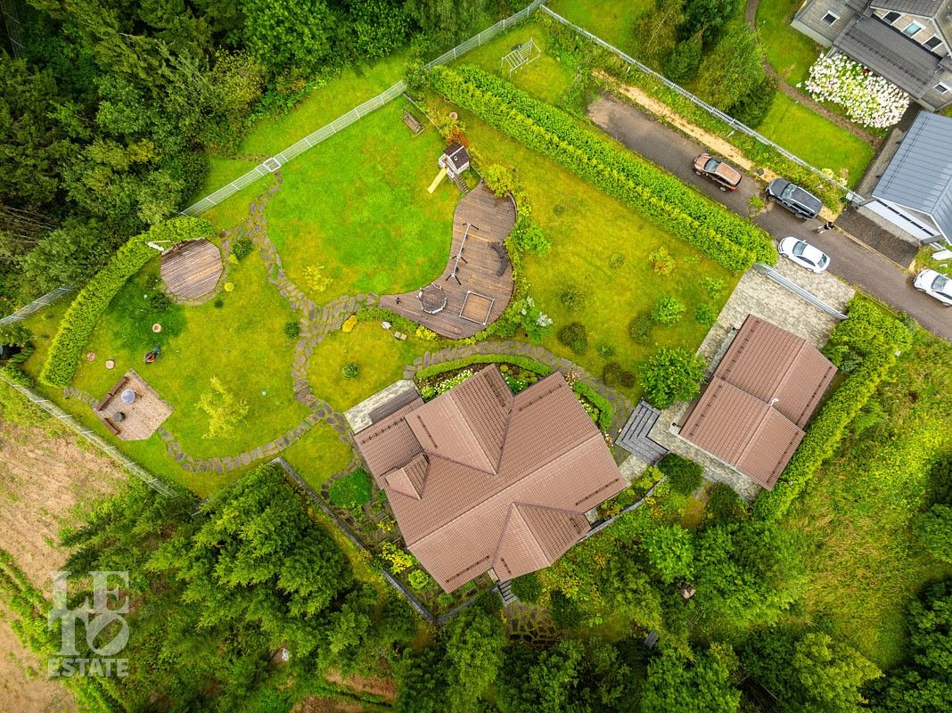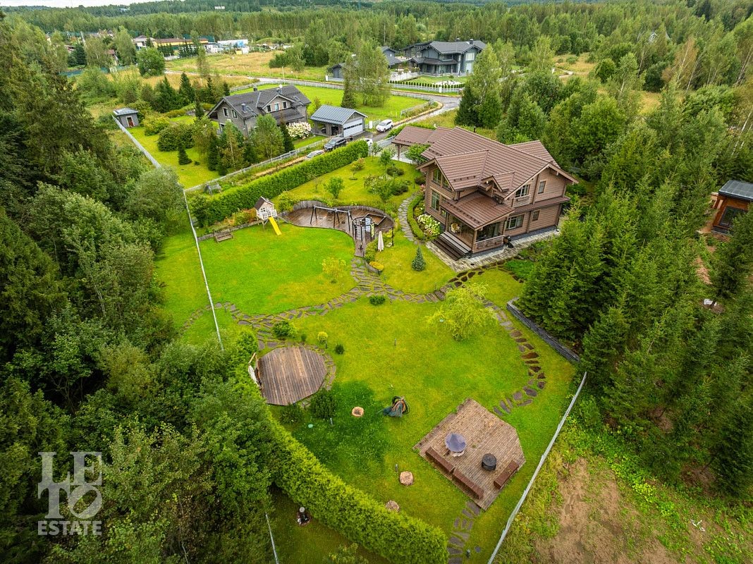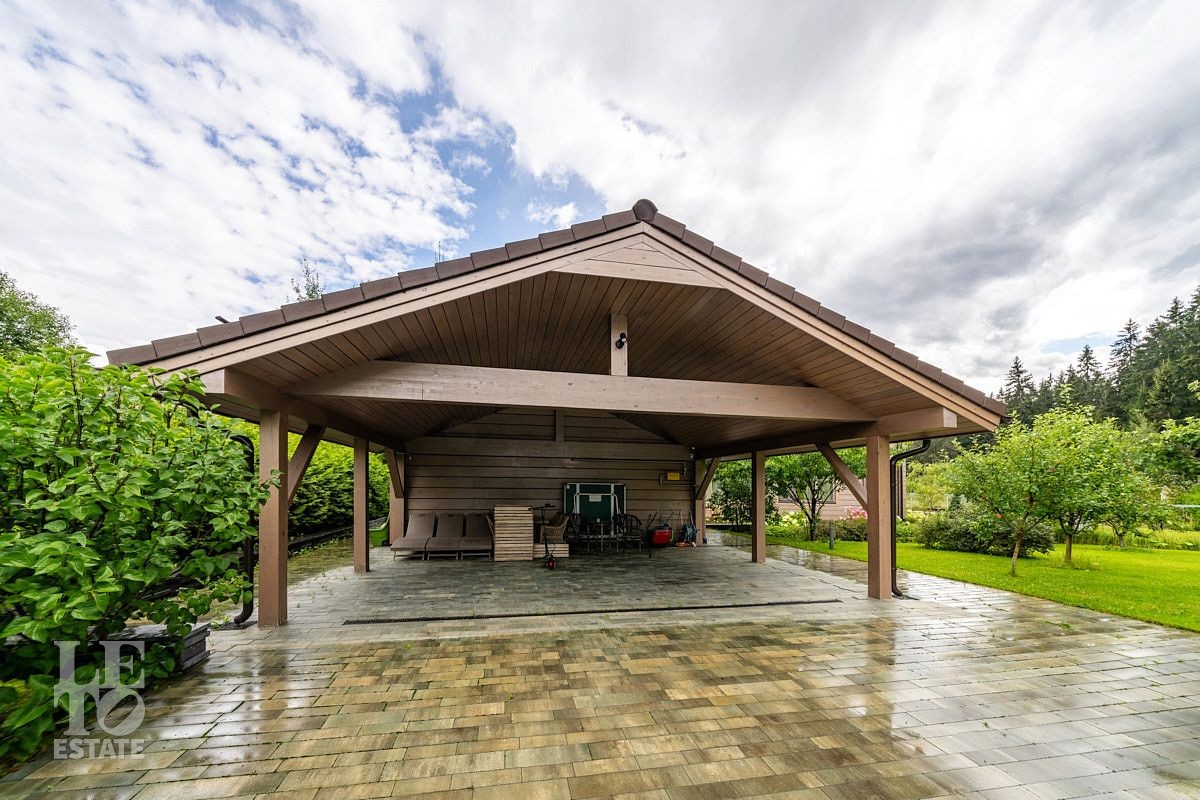 На приусадебном участке выполнены ландшафтные работы: высажены декоративные деревья и кустарники, организован сад, небольшой огород и ягодник. Природное очарование загородного участка достигнуто благодаря уникальному дизайну и новаторскому подходу. Продуманная инженерная концепция позволила создать безбарьерную среду, где строения для отдыха гармонично интегрированы в природное окружение. Безупречное состояние территории поддерживается системой дренажа — высокоэффективной технологией отвода воды и поддержания водного баланса. Дорожки выложены природным камнем, разведена система автоматического полива, организовано вечернее освещение. Помимо основного дома на участке расположен навес на два автомобиля, а также дополнительные помещения в виде кладовой и котельной.