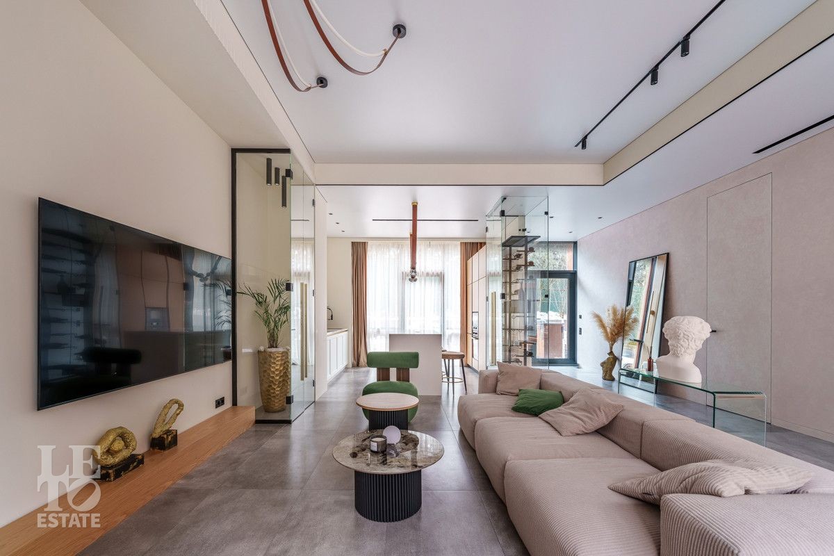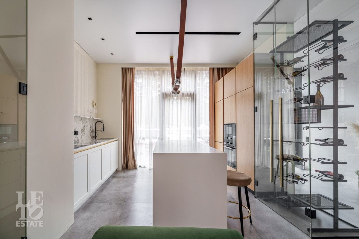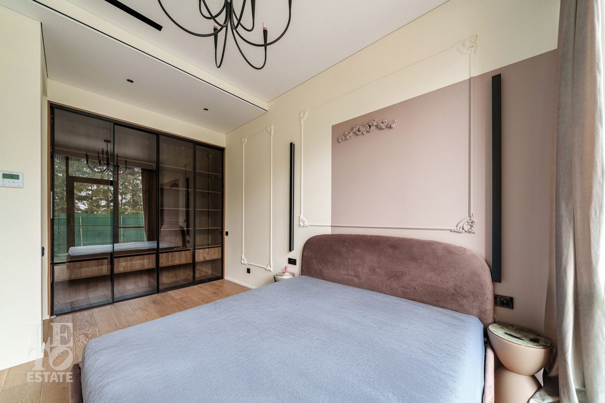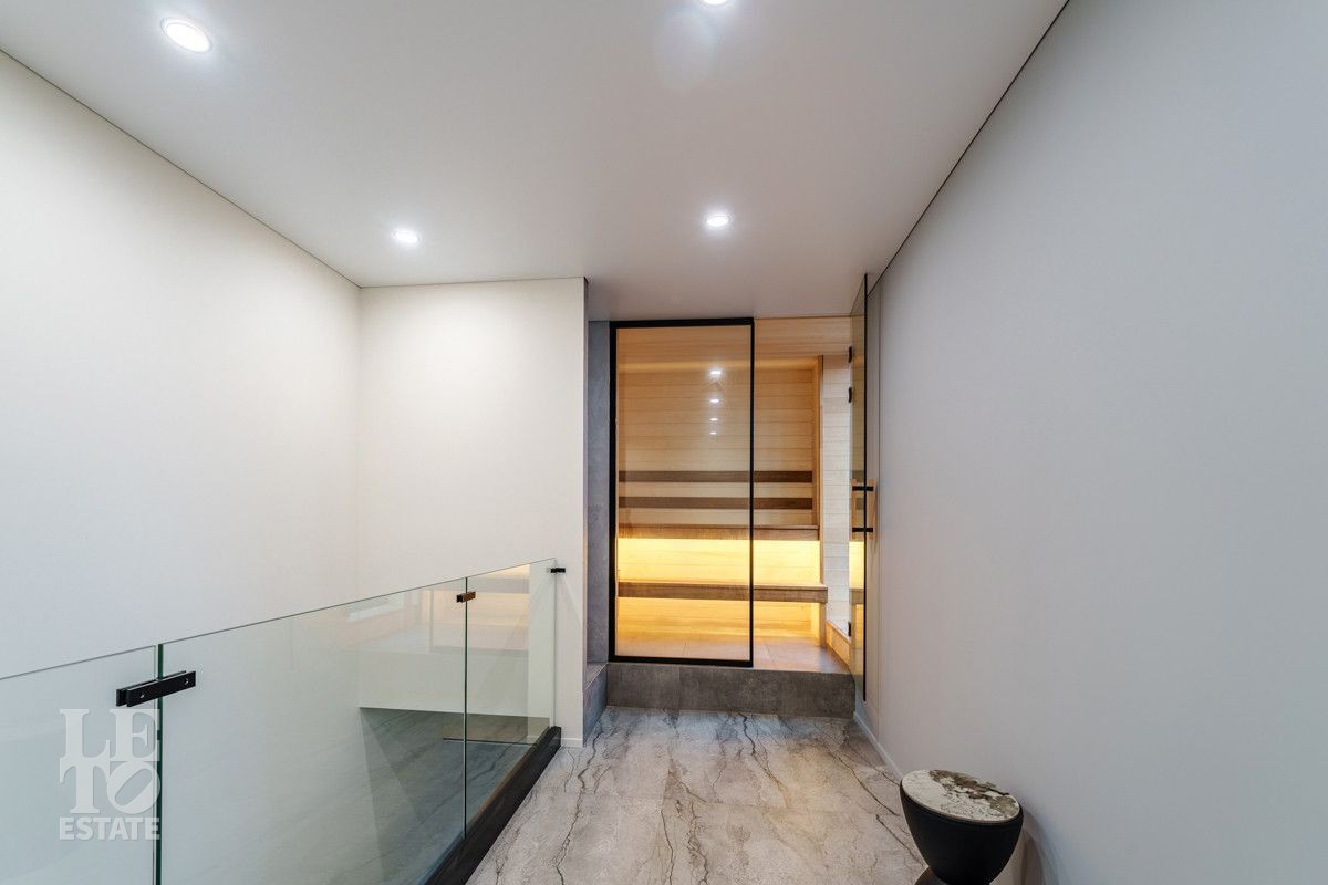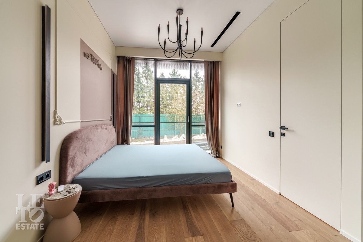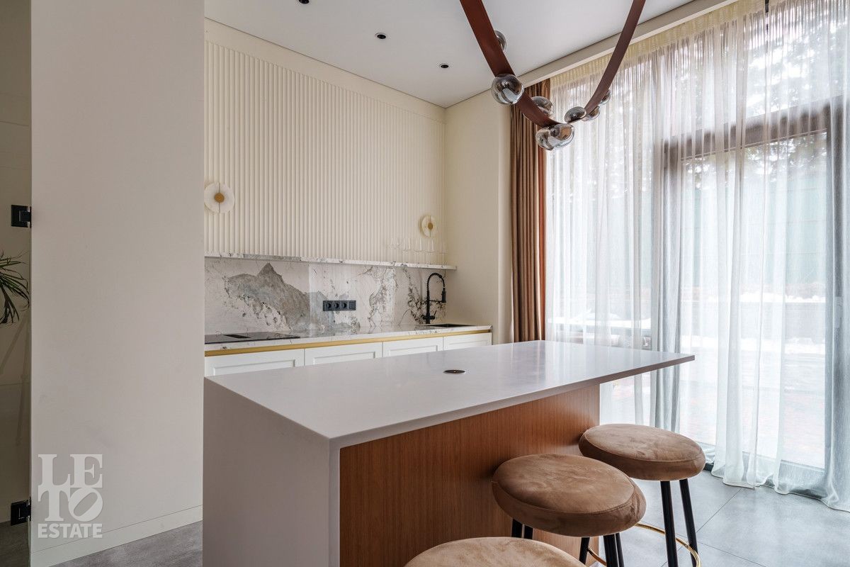 Внутренняя отделка выполнена из дорогостоящих материалов, полы - паркет и итальянский керамогранит, лестница сделана из натурального дерева - ясень. Установлена техника Kuppersbusch, Maunfeld и канальное кондиционирование, а также электрокарнизы. Разведен теплый пол.