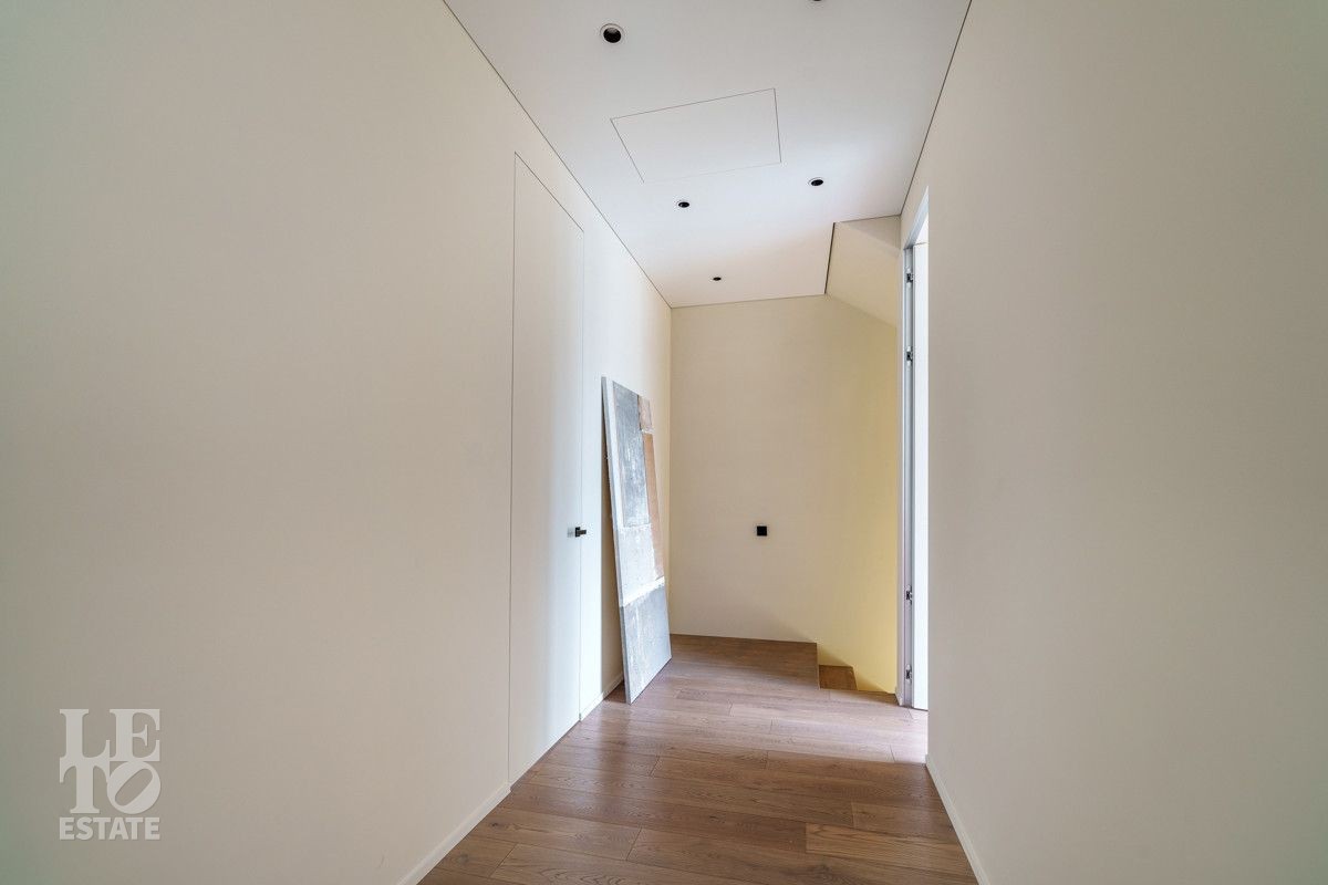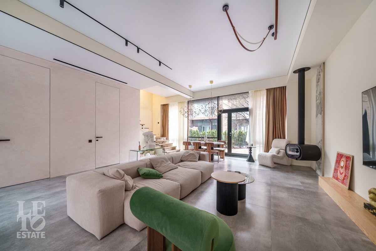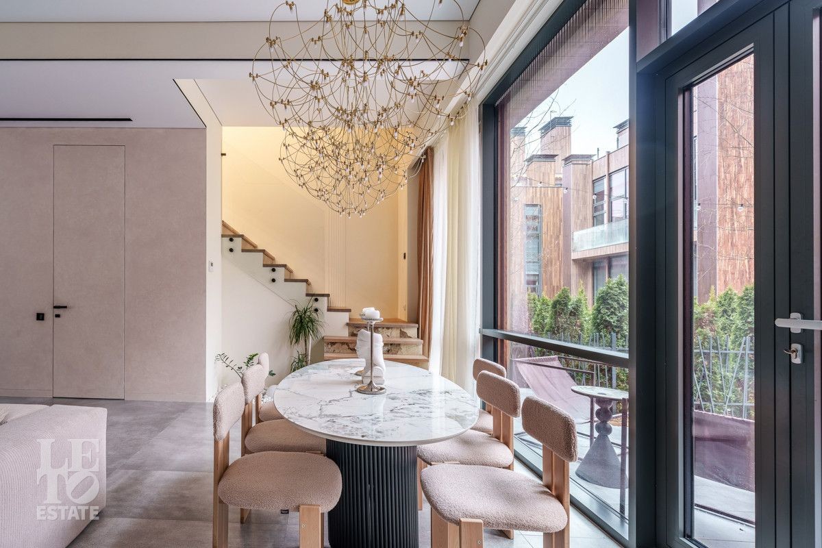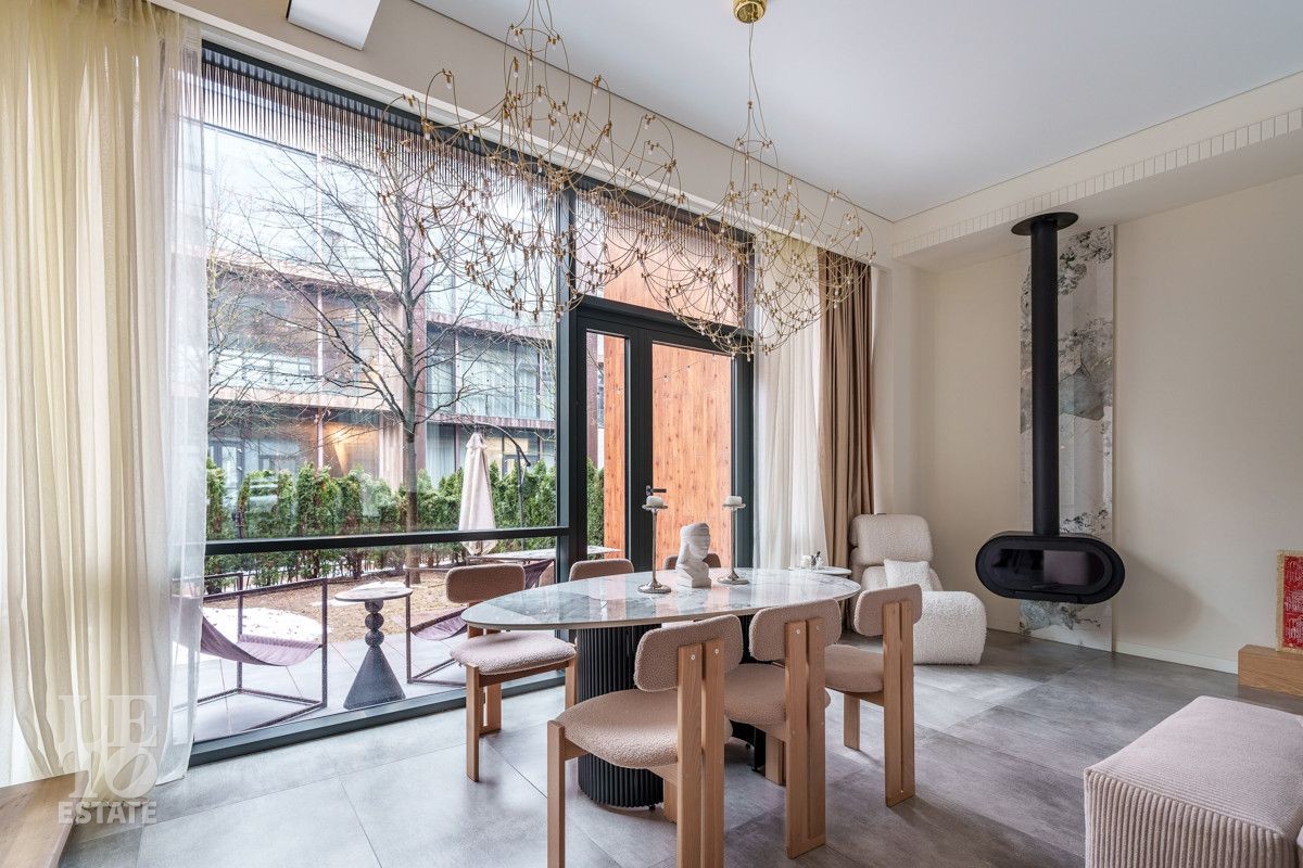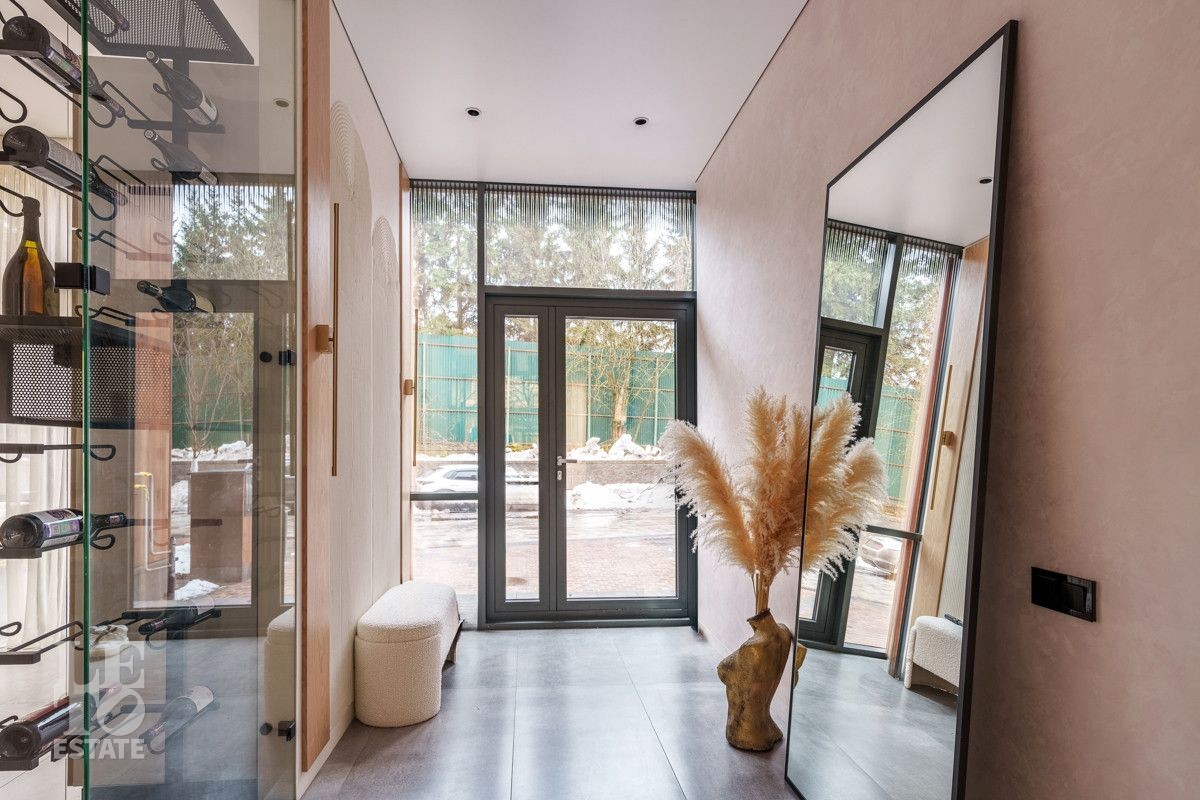 Внутренняя отделка выполнена из дорогостоящих материалов, полы - паркет и итальянский керамогранит, лестница сделана из натурального дерева - ясень. Установлена техника Kuppersbusch, Maunfeld и канальное кондиционирование, а также электрокарнизы. Разведен теплый пол.