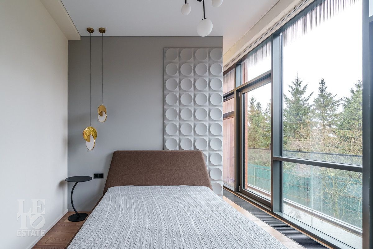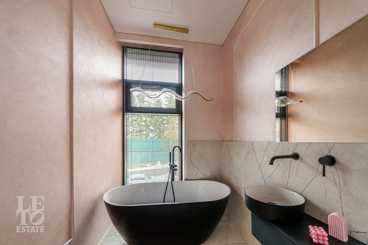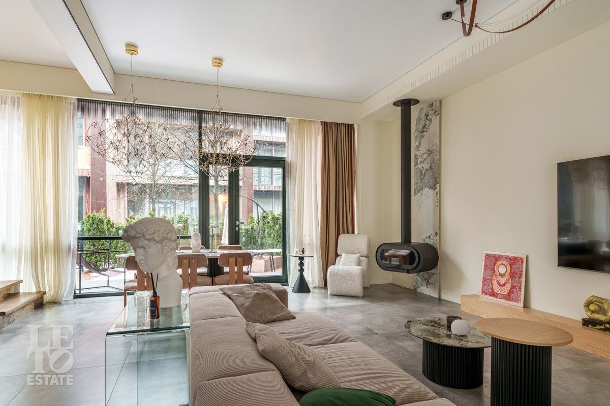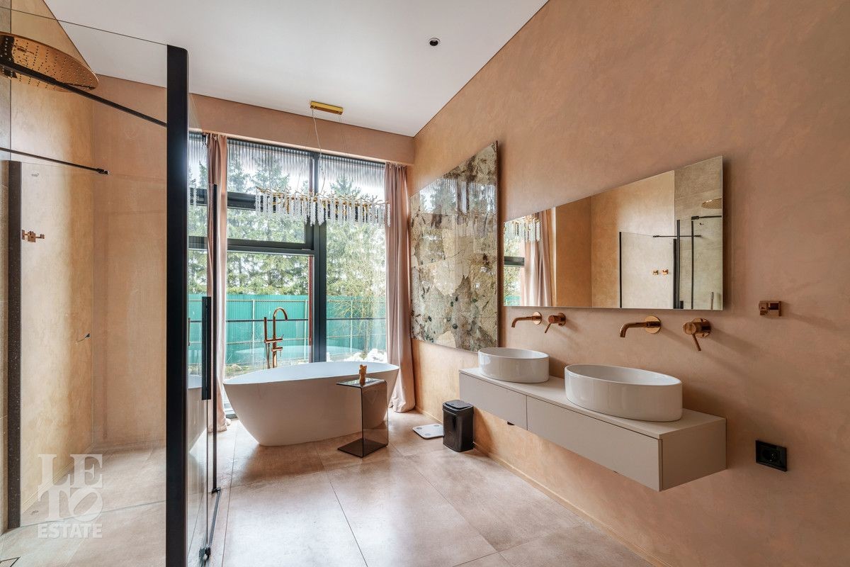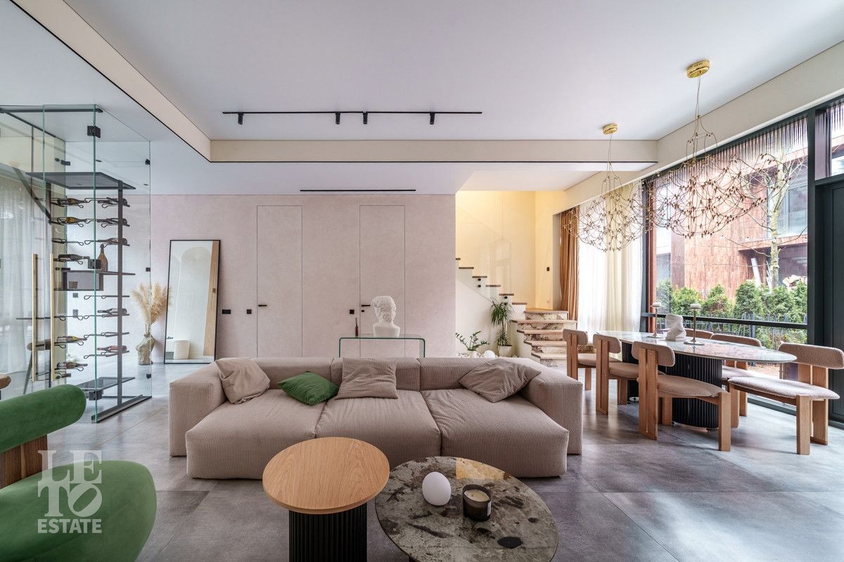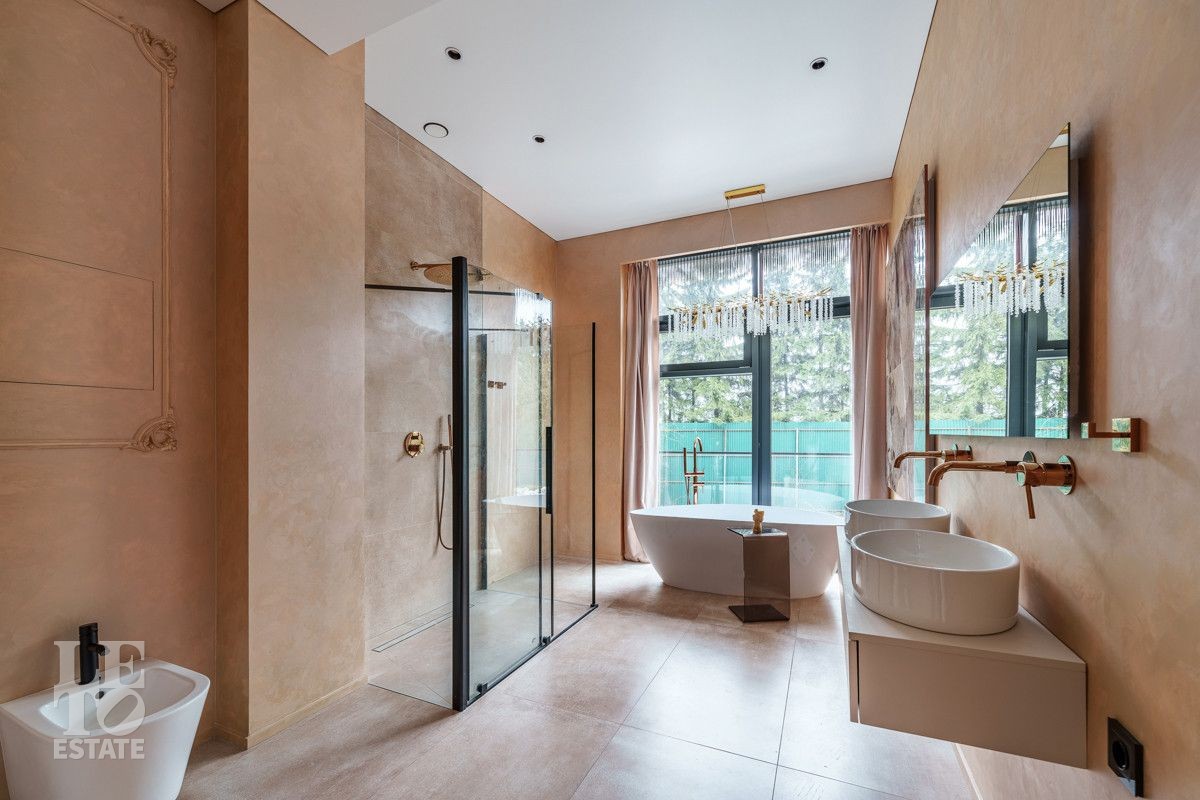 Внутренняя отделка выполнена из дорогостоящих материалов, полы - паркет и итальянский керамогранит, лестница сделана из натурального дерева - ясень. Установлена техника Kuppersbusch, Maunfeld и канальное кондиционирование, а также электрокарнизы. Разведен теплый пол.