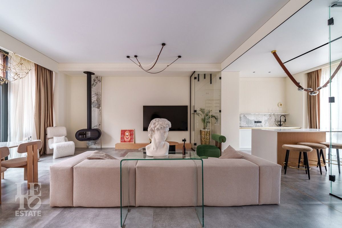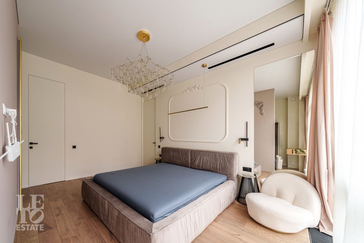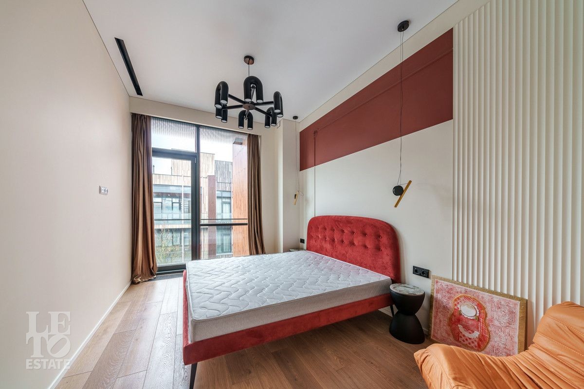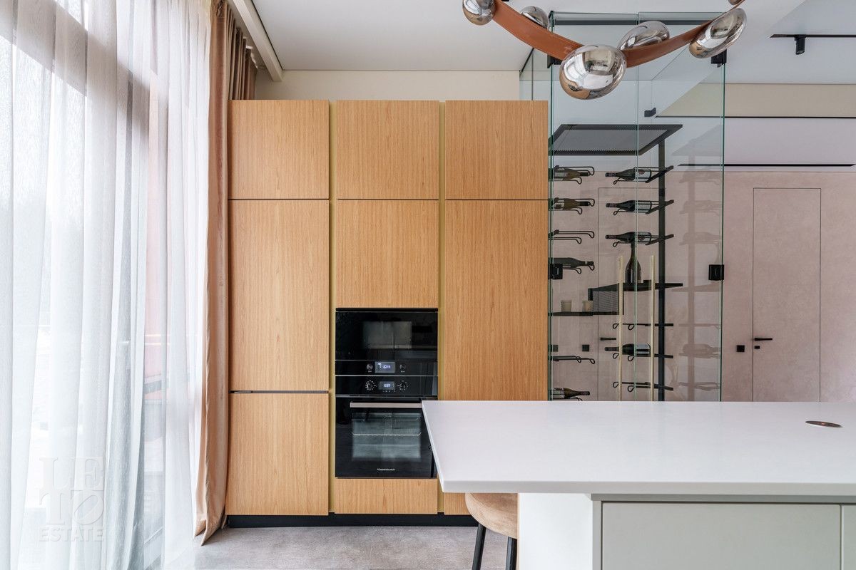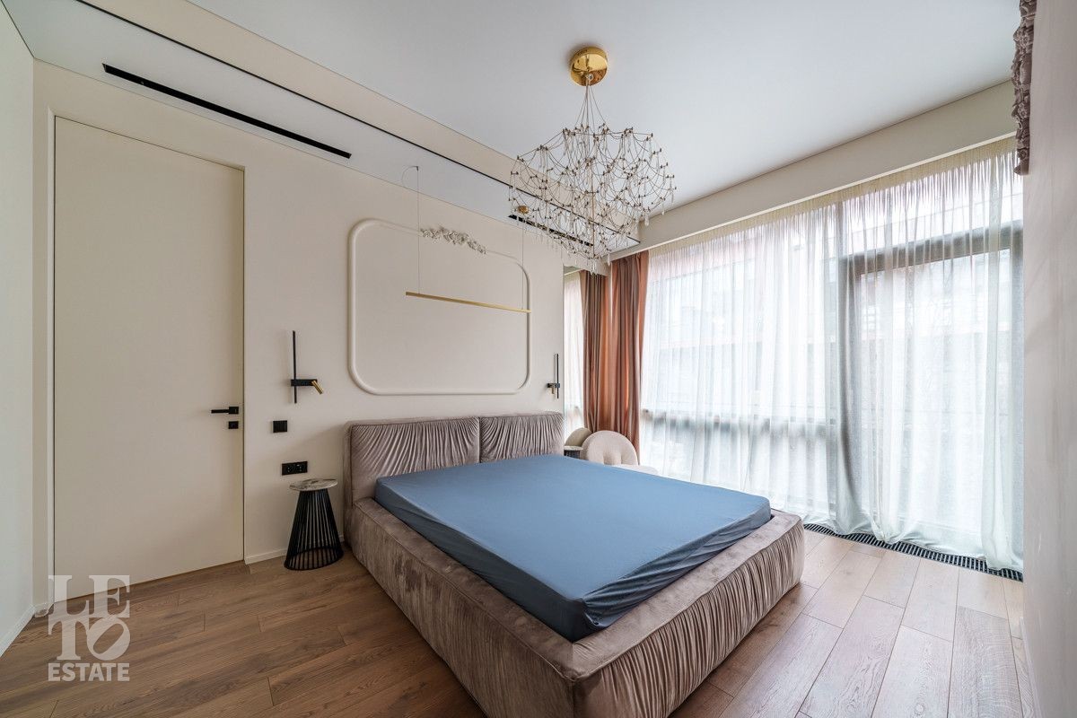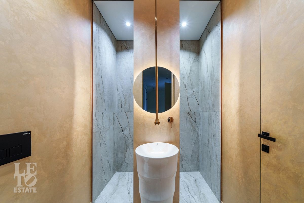 Внутренняя отделка выполнена из дорогостоящих материалов, полы - паркет и итальянский керамогранит, лестница сделана из натурального дерева - ясень. Установлена техника Kuppersbusch, Maunfeld и канальное кондиционирование, а также электрокарнизы. Разведен теплый пол.