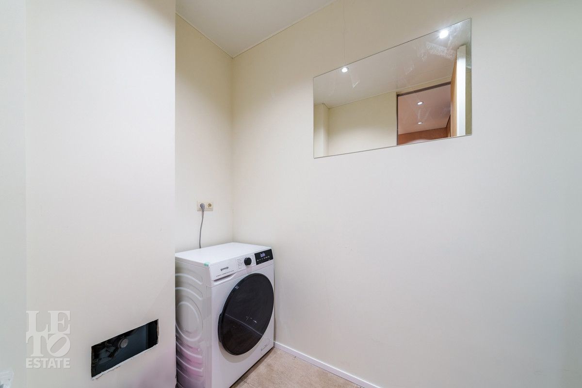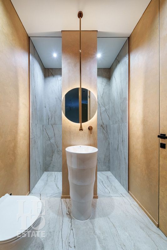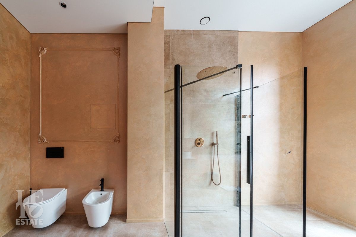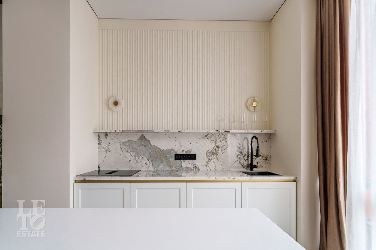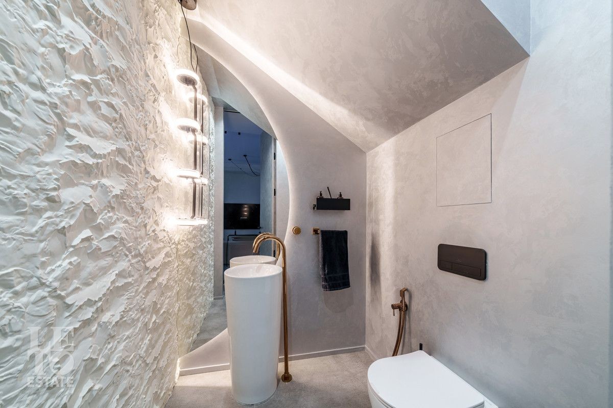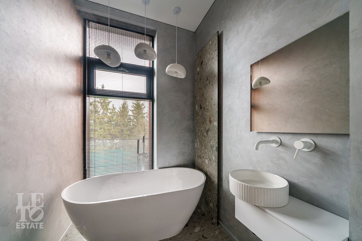 Внутренняя отделка выполнена из дорогостоящих материалов, полы - паркет и итальянский керамогранит, лестница сделана из натурального дерева - ясень. Установлена техника Kuppersbusch, Maunfeld и канальное кондиционирование, а также электрокарнизы. Разведен теплый пол.