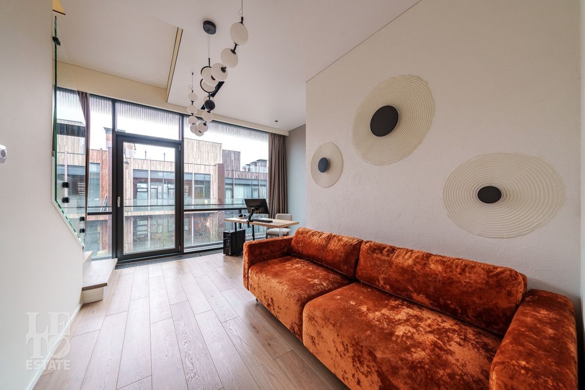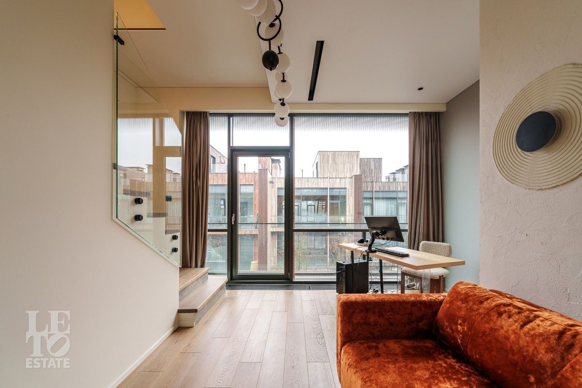 Отличительными чертами таунхауса являются большие панорамные окна, которые добавляют пространства и света, а также терраса на верхнем этаже, где дополнительно можно организовать зону отдыха для всей семьи.