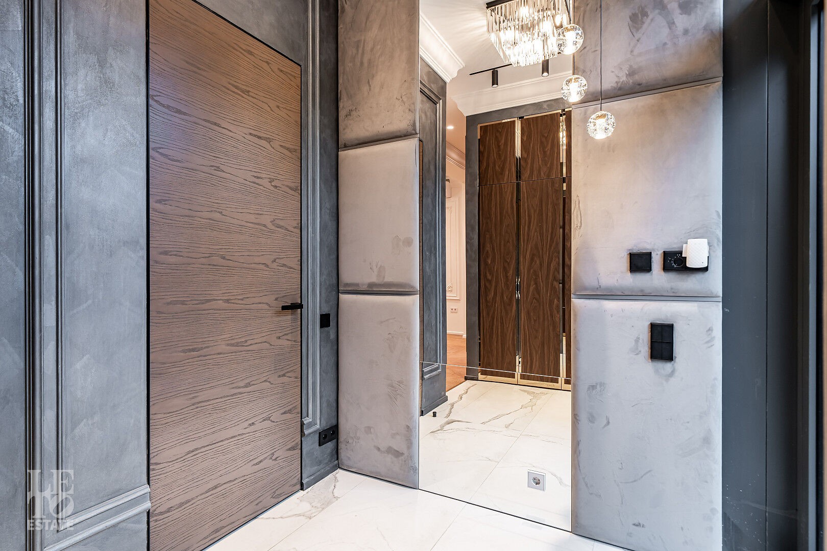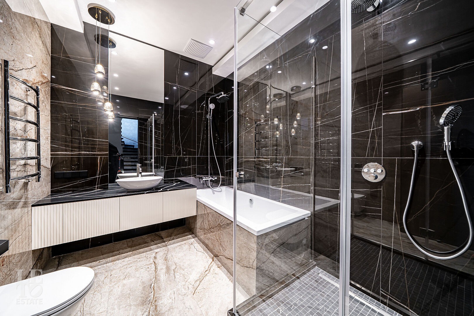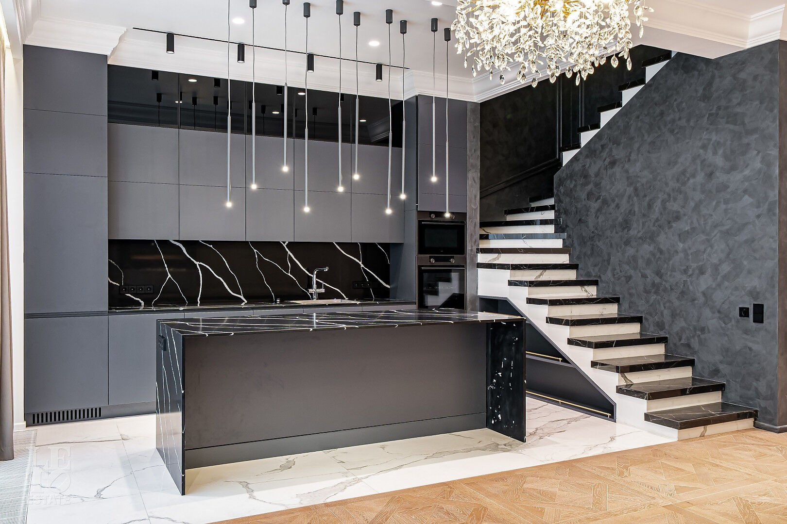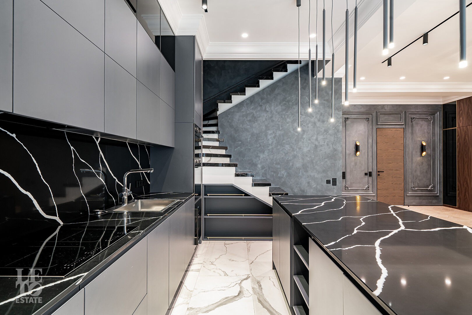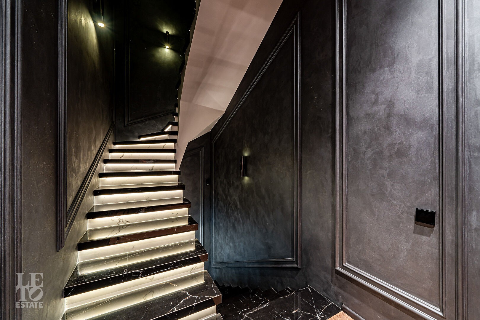 Таунхаус представлен под ключ с дизайнерским интерьером: лаконичные линии, современные фактуры, продуманные световые сценарии. Изящная лестница с подсветкой интегрирована так, чтобы визуально разгрузить гостиную.