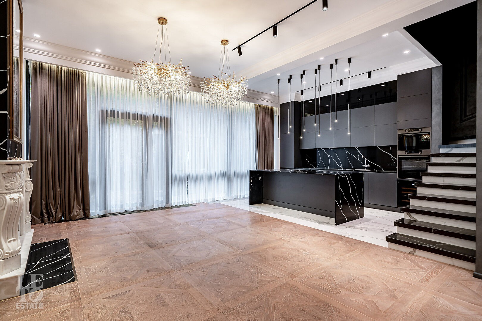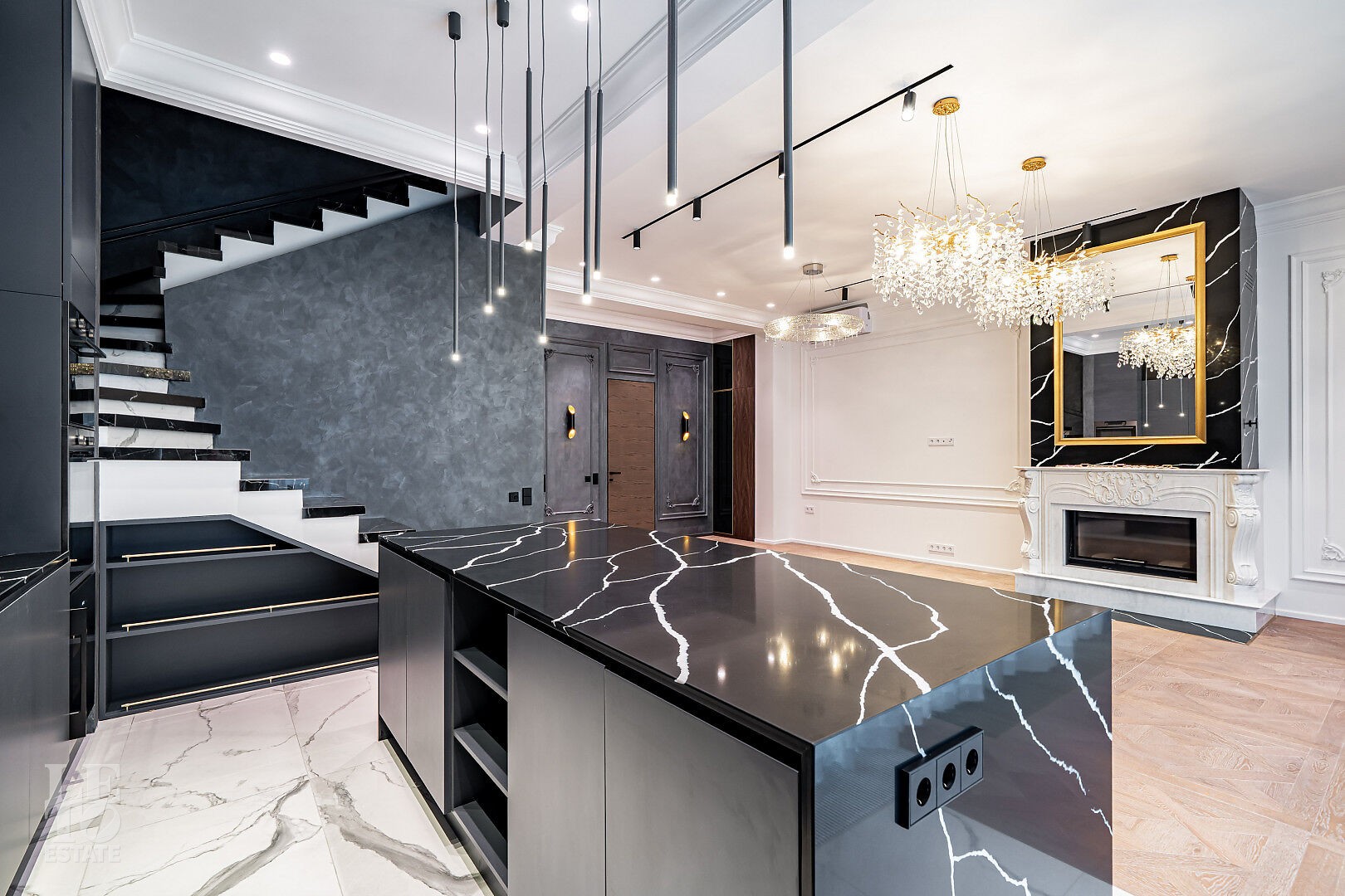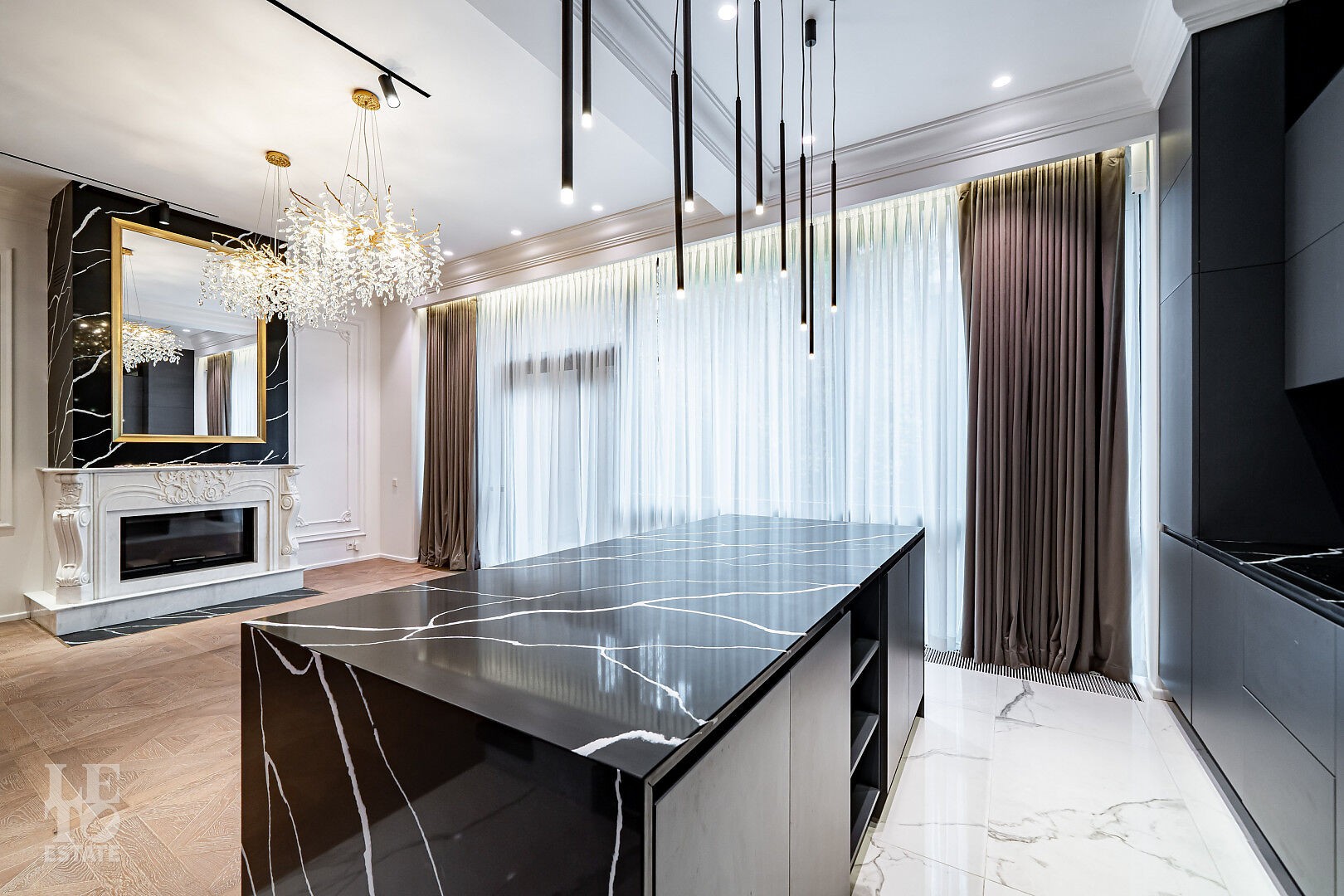 На первом этаже расположен действующий мраморный камин — центральный акцент гостиной,