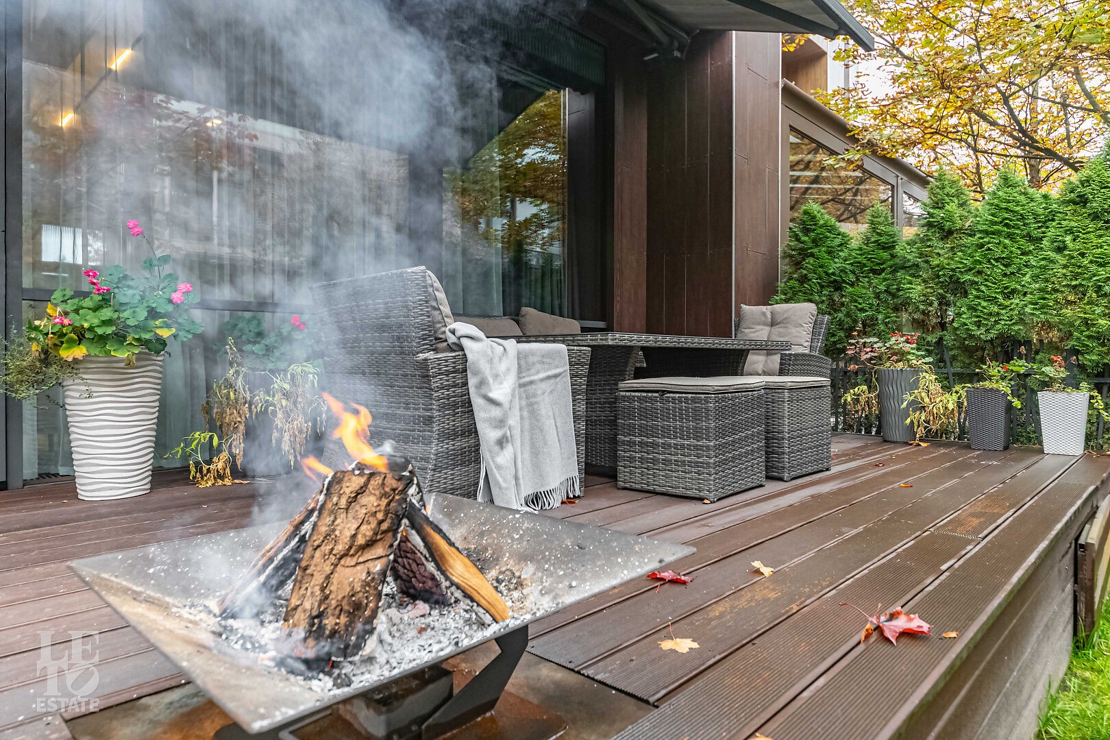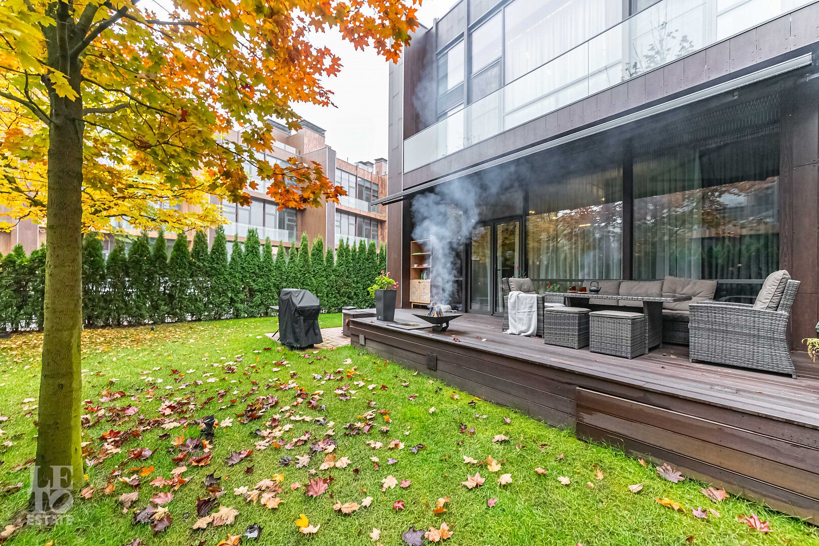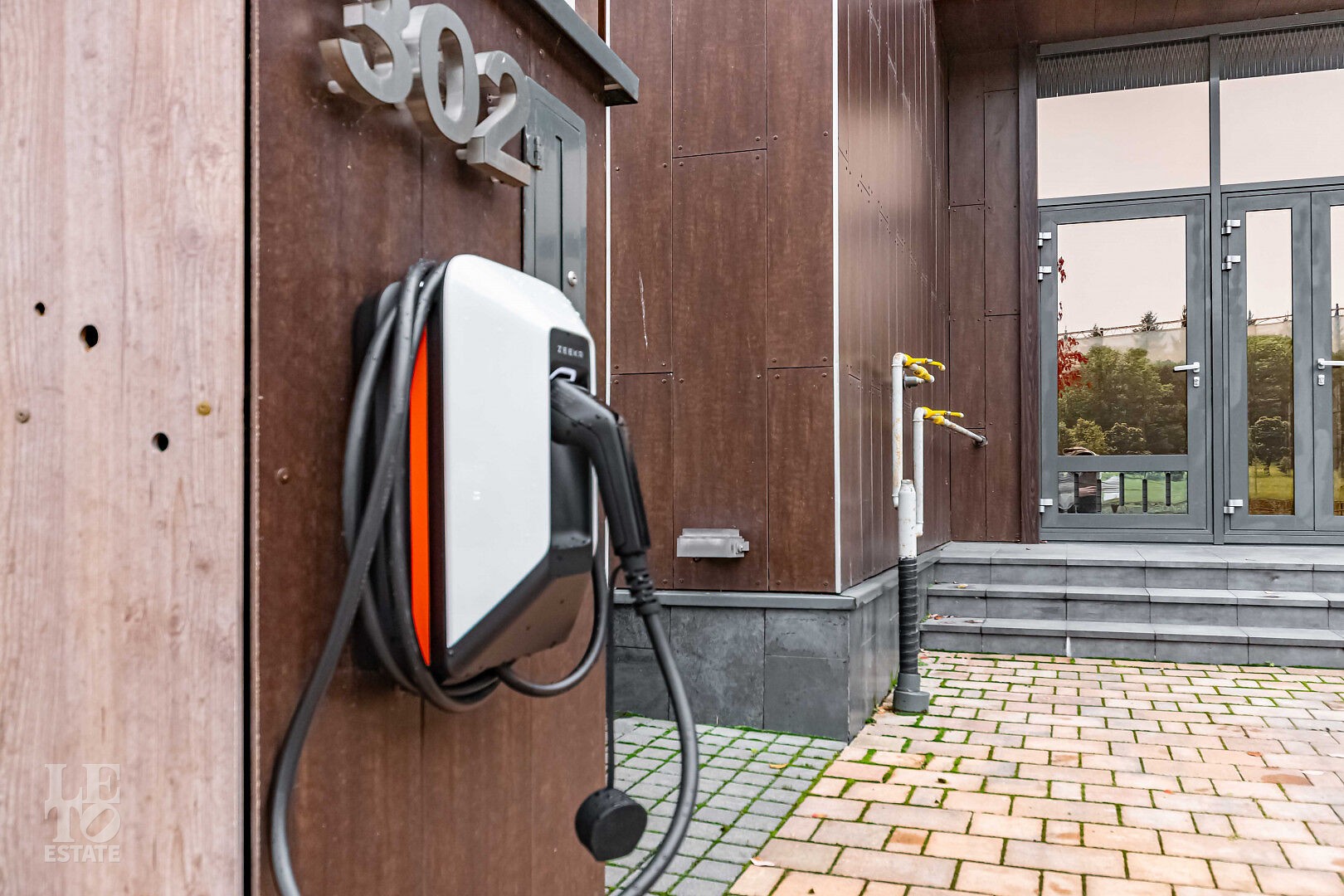 На 2,8 сотках ухоженный участок с туями и барбекю, зарядка для электромобилей.