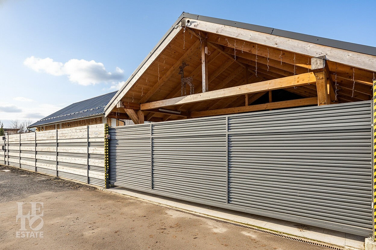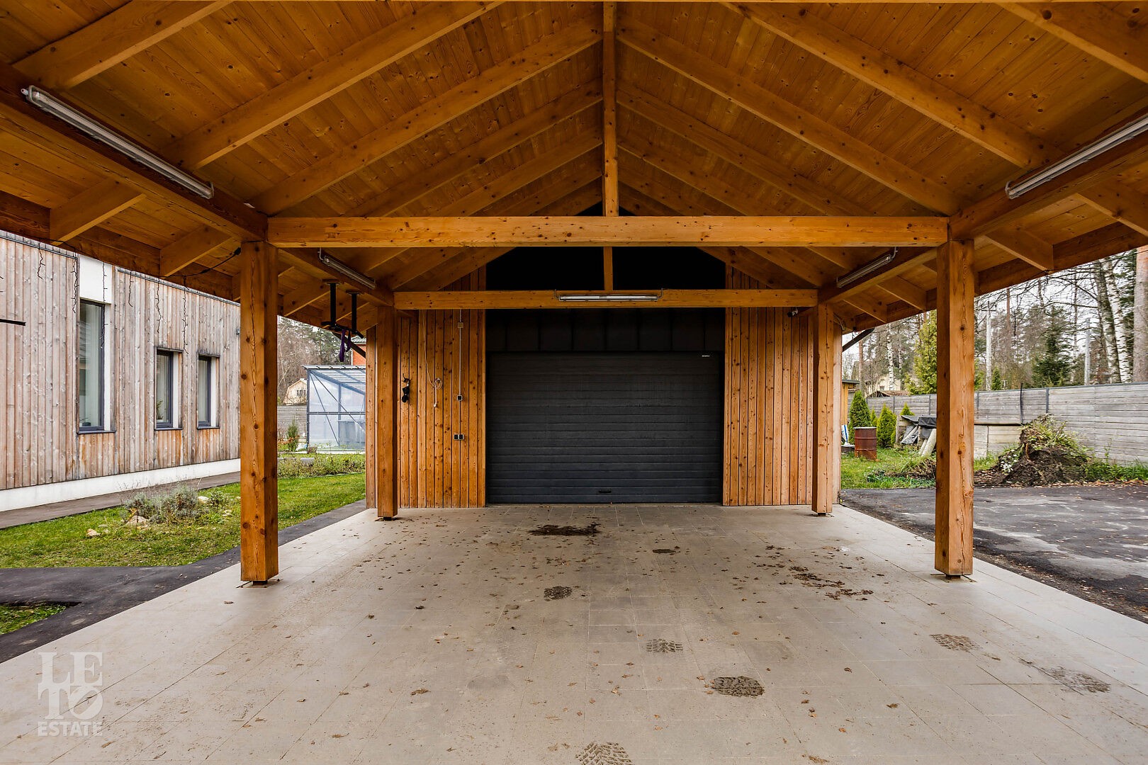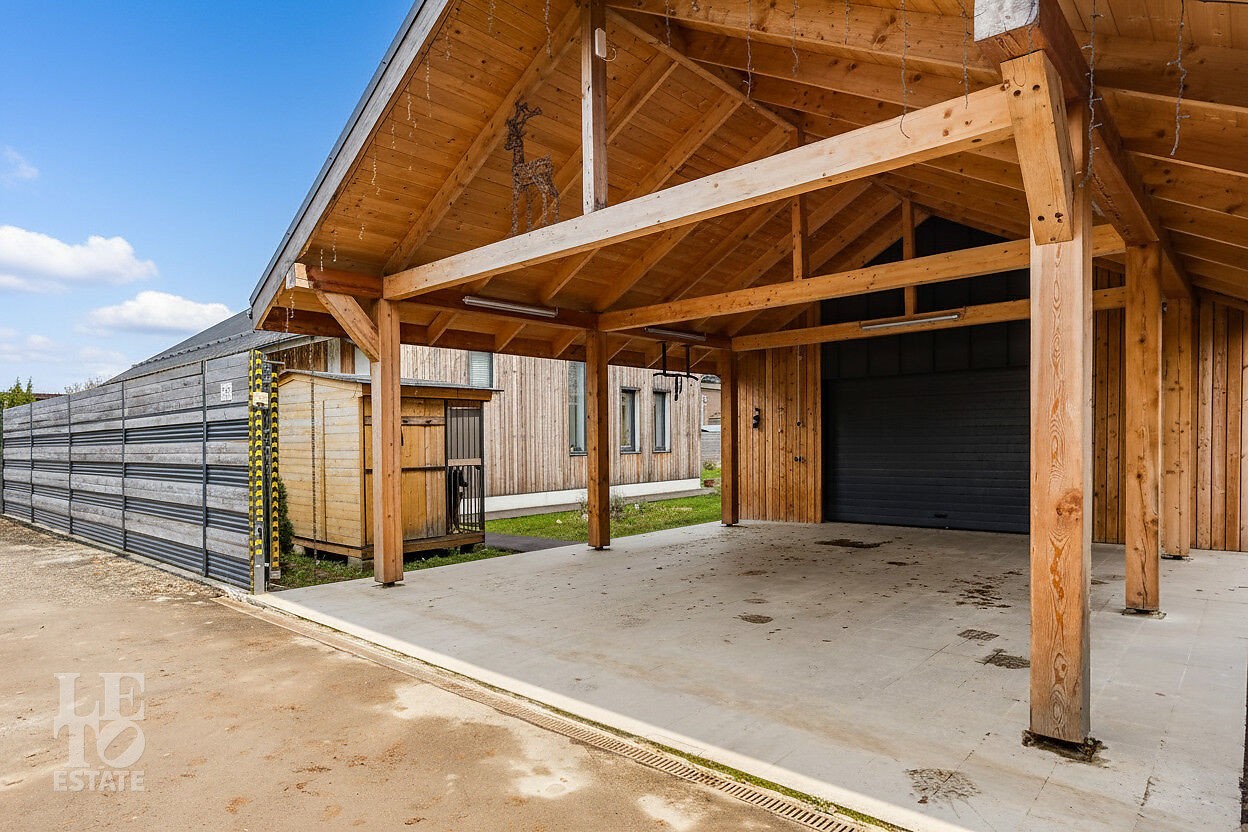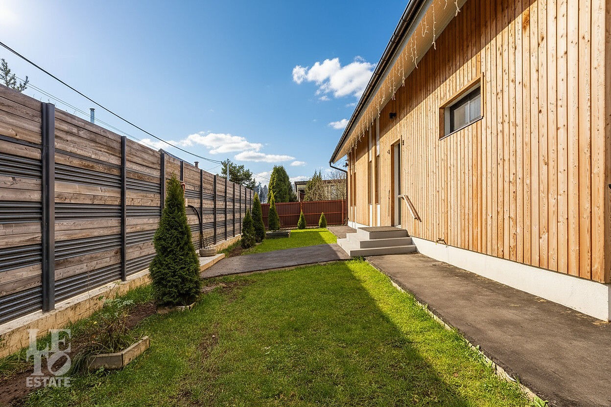 Участок полностью огорожен забором из лиственницы. Гаражные и въездные ворота с электроприводом.