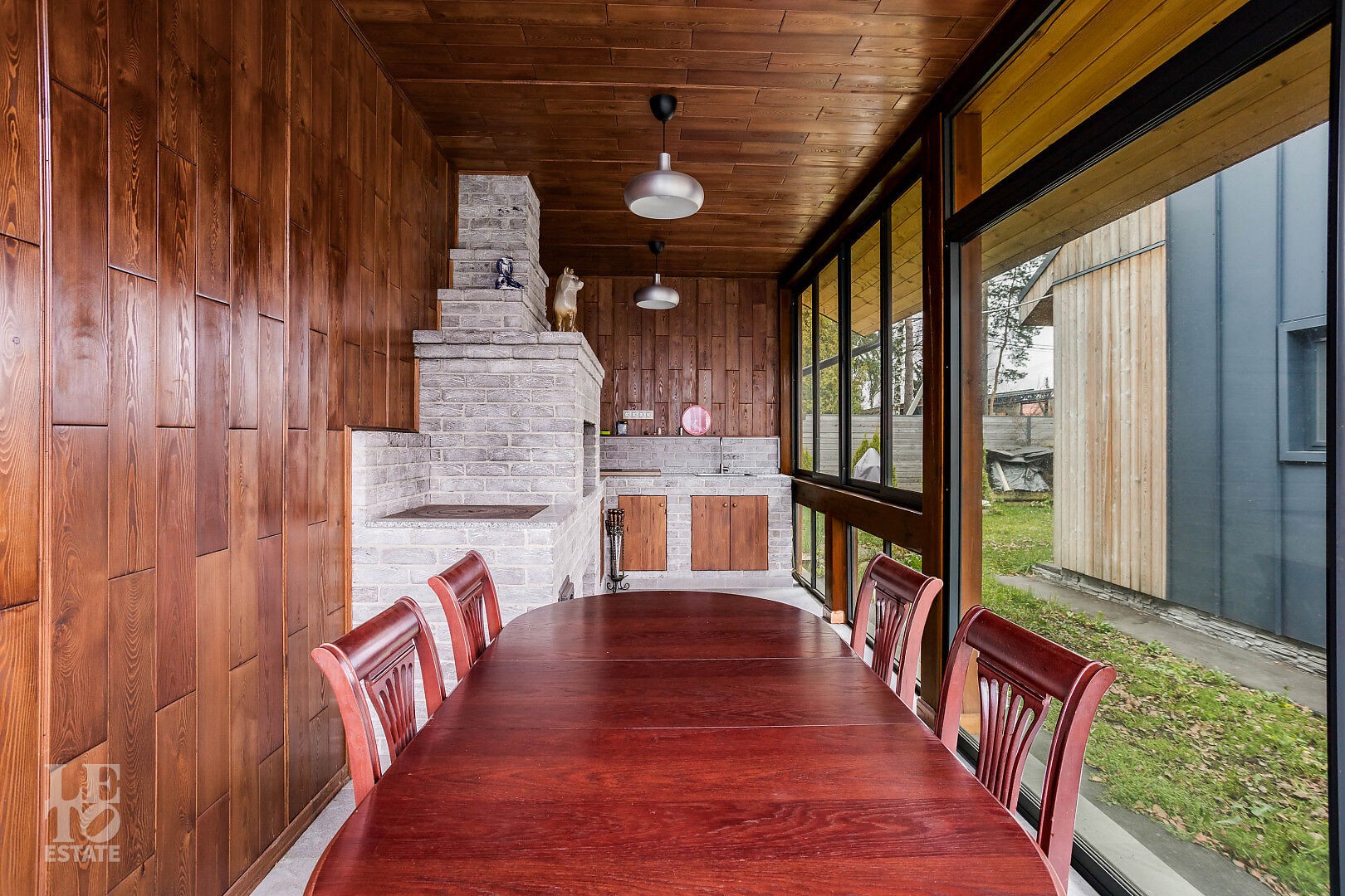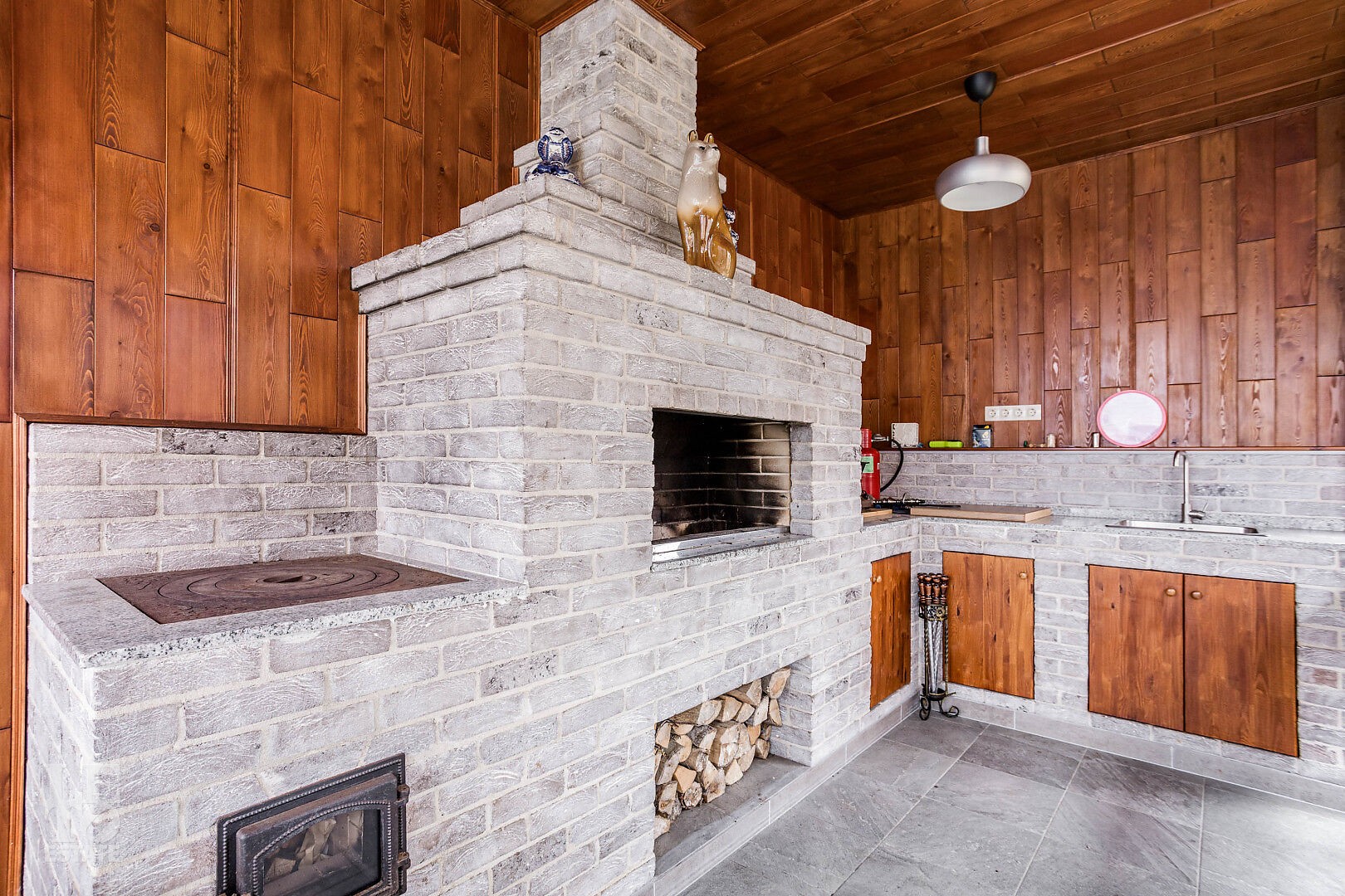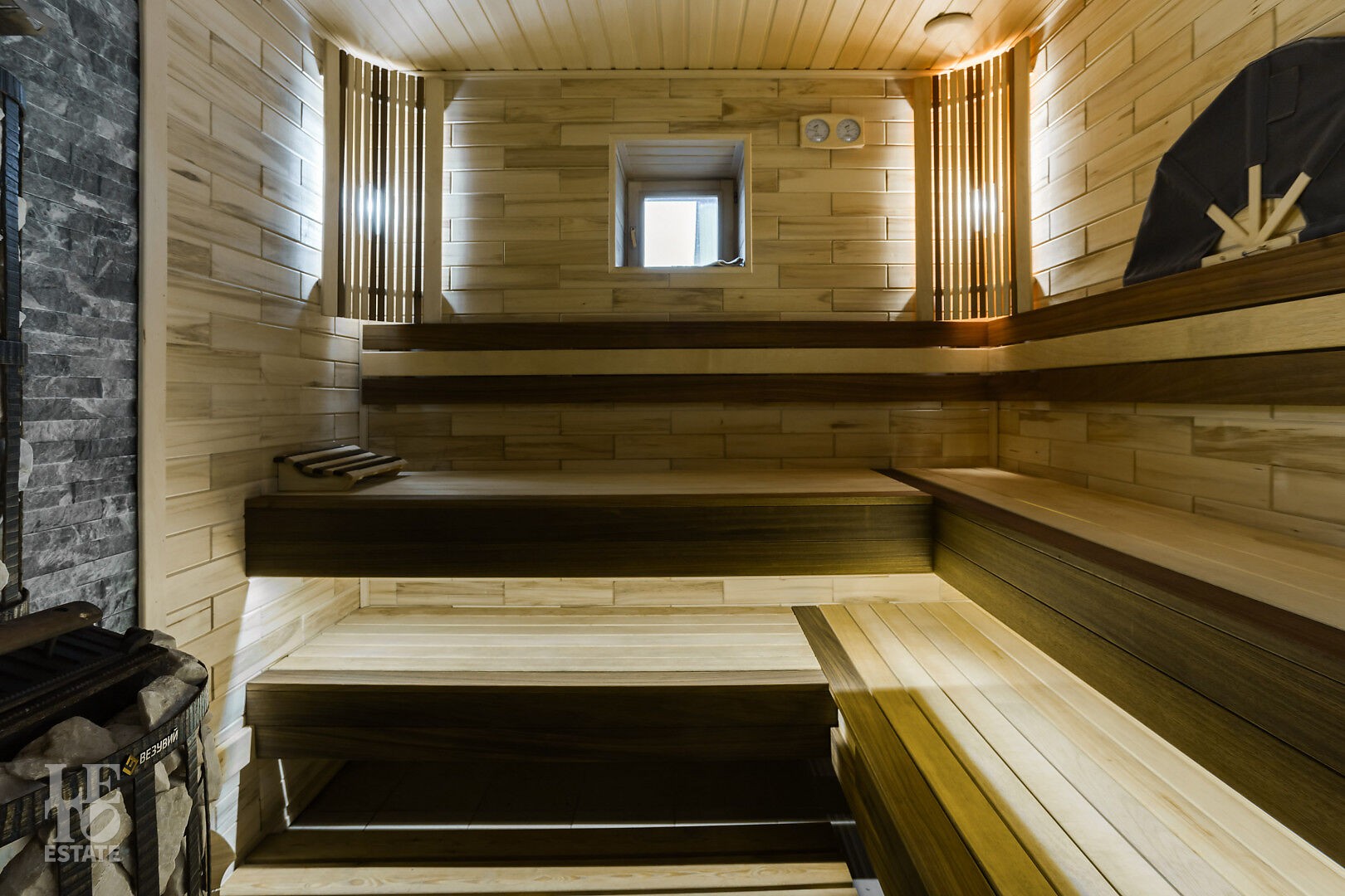 Дополнительно построена баня из газоблоков с зоной отдыха, парной, санузлом и душевой. На открытой террасе расположена дровяная печь, кухня. На придомовой территории также есть гараж на два автомобиля с навесом. Примыкает открытая парковка. Всего можно разместить восемь автомобилей.