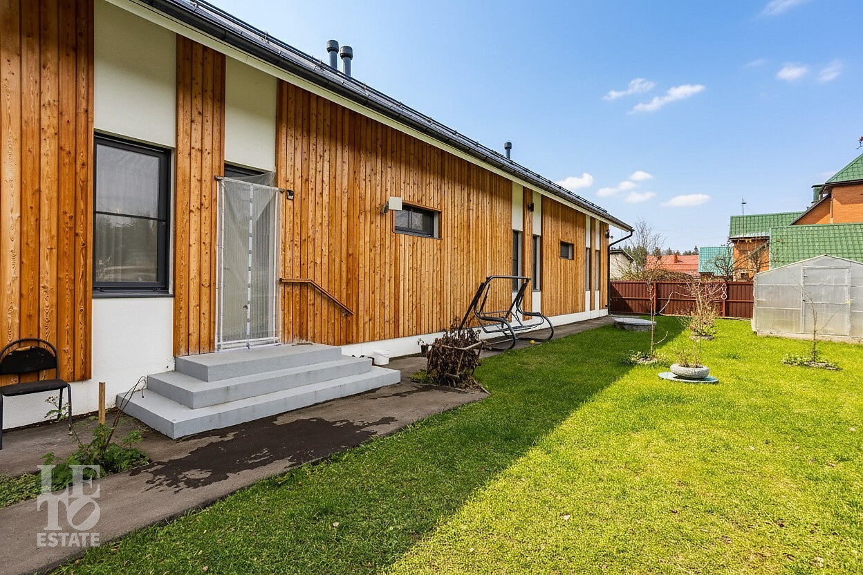 Дом построен из газоблоков, свайно-ростверковый фундамент, крыша - фальцевая финская кровля, внешняя отделка - лиственница.