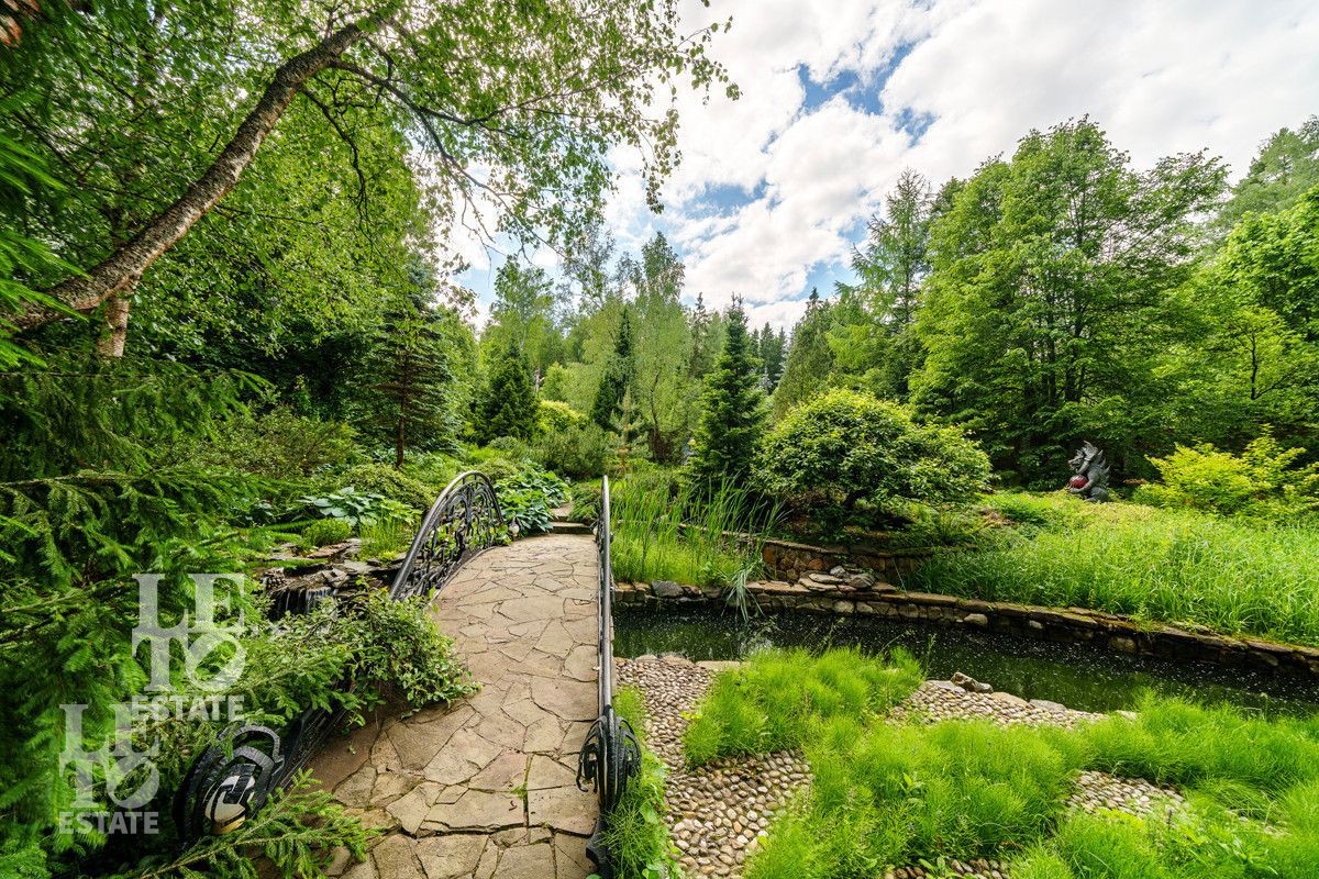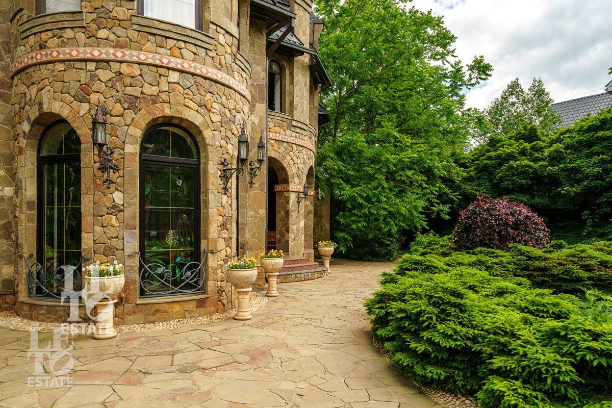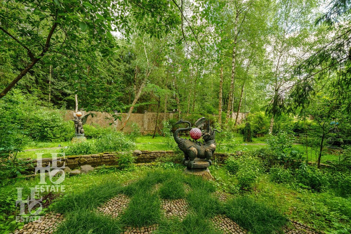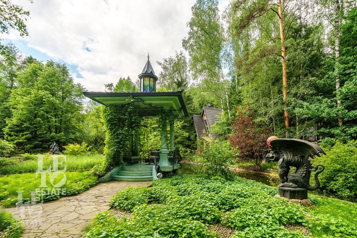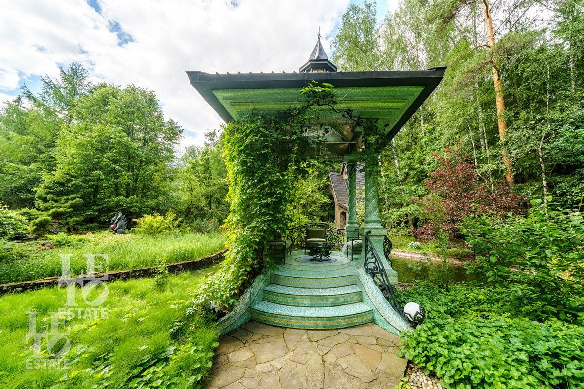Этот роскошный особняк, расположен на лесном тихом участке в 1,15 гектара. На территории сделан ландшафтный дизайн: перед домом установлен великолепный фонтан в форме дракона, также 9 бронзовых скульптур от Александра Шенгелия, расположеные по всему периметру участка, вымощенные дорожки, освещаемые 270 фонарями - создают неповторимую атмосферу. Нижний сад украшает большой пруд, водопады и мозаичная беседка с итальянской мозаикой, отделанная мрамором Verda Laponia. Вторая беседка и зона барбекю расположена чуть дальше и выполнена по отдельному проекту из мрамора и кованных элементов, которая вмещает в себя до 20 человек.
