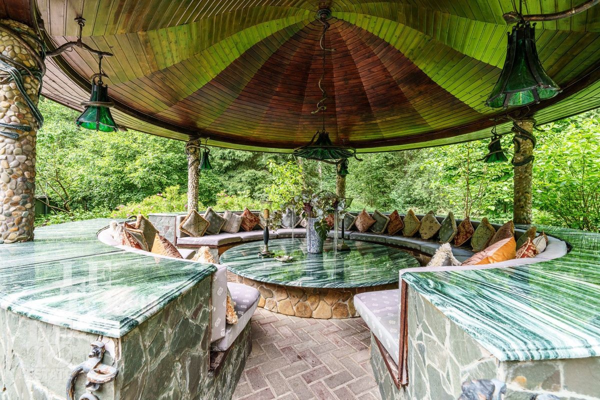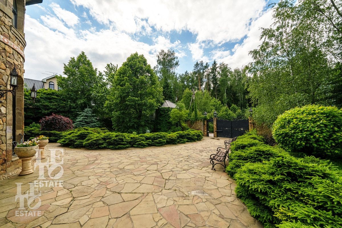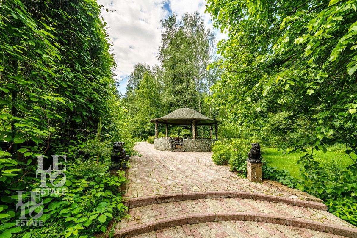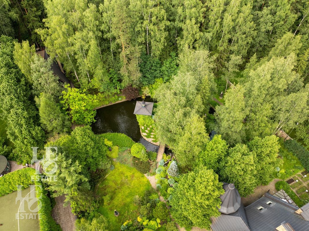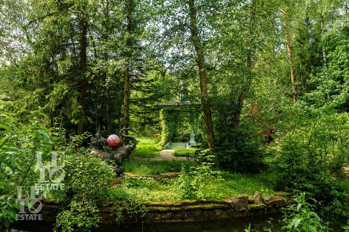 Этот роскошный особняк, расположен на лесном тихом участке в 1,15 гектара. На территории сделан ландшафтный дизайн: перед домом установлен великолепный фонтан в форме дракона, также 9 бронзовых скульптур от Александра Шенгелия, расположеные по всему периметру участка, вымощенные дорожки, освещаемые 270 фонарями - создают неповторимую атмосферу. Нижний сад украшает большой пруд, водопады и мозаичная беседка с итальянской мозаикой, отделанная мрамором Verda Laponia. Вторая беседка и зона барбекю расположена чуть дальше и выполнена по отдельному проекту из мрамора и кованных элементов, которая вмещает в себя до 20 человек.