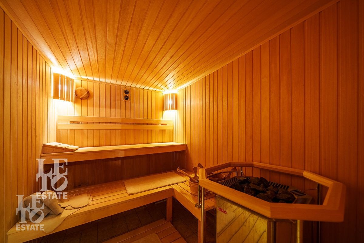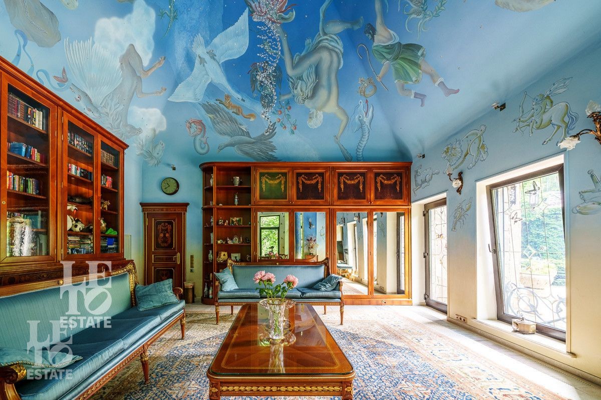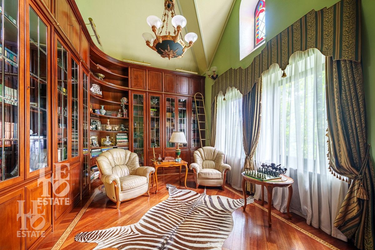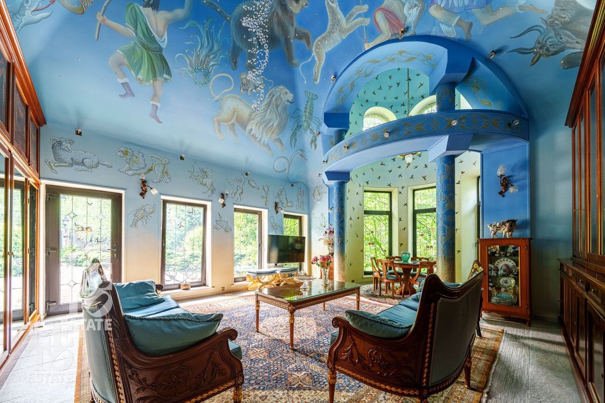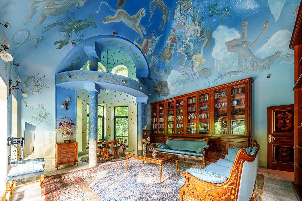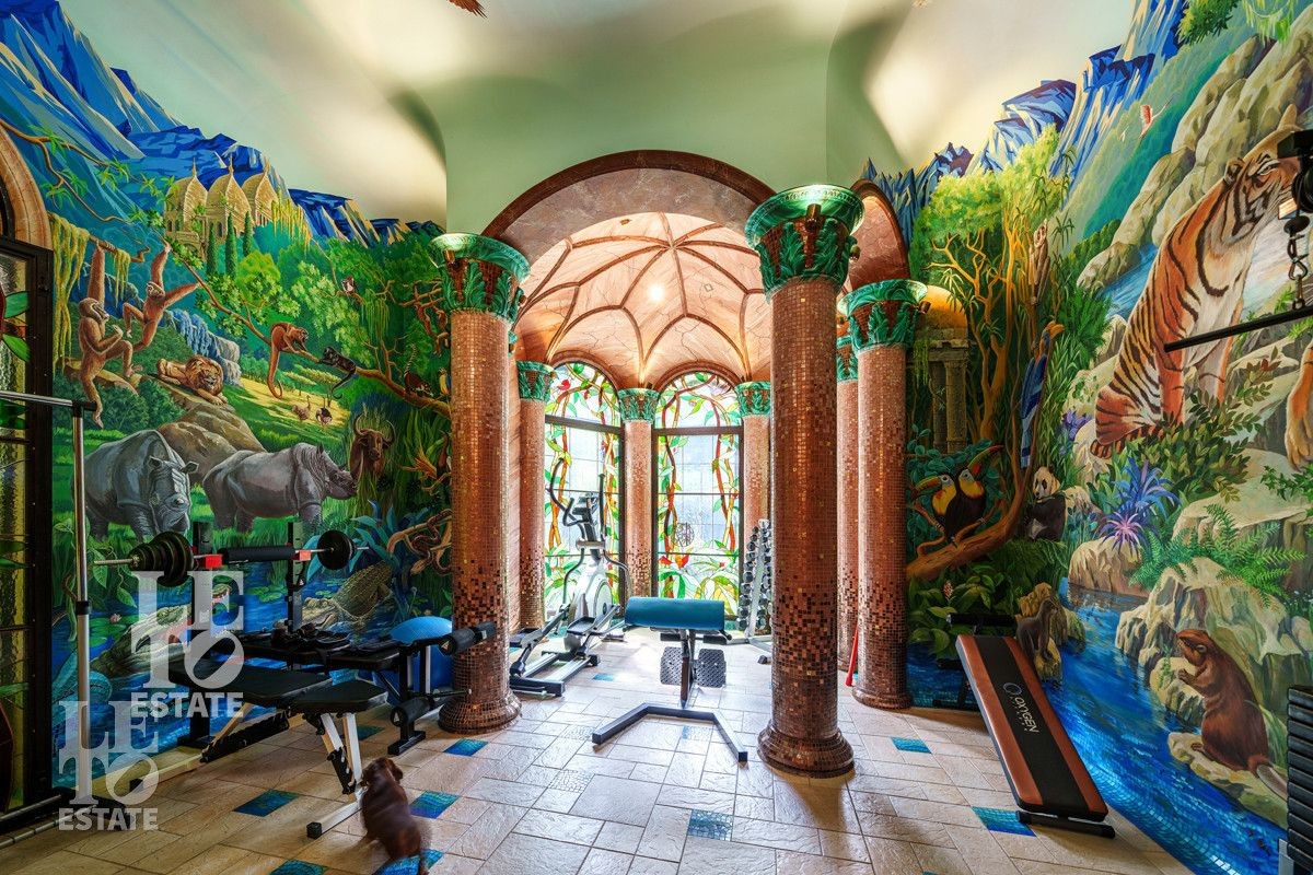 Большая библиотека-гостиная с ротондой инкрустирована кристаллами Swarovski, изображающими звездное небо Северного полушария и знаки зодиака, оттуда можно пройти в спортивный зал с эркером и ручной росписью "Зоопарк Роберта Спенсера", далее располагается сауна Tylo из африканского дерева.
